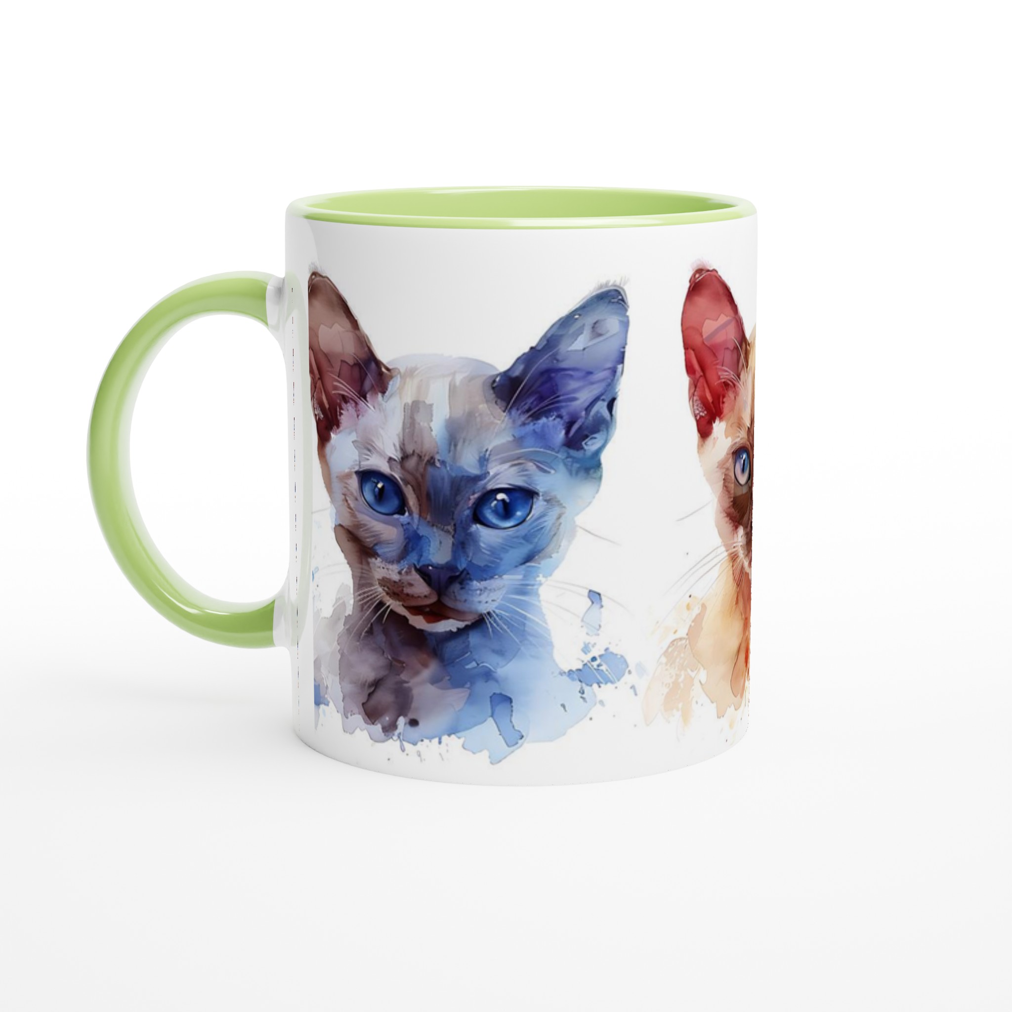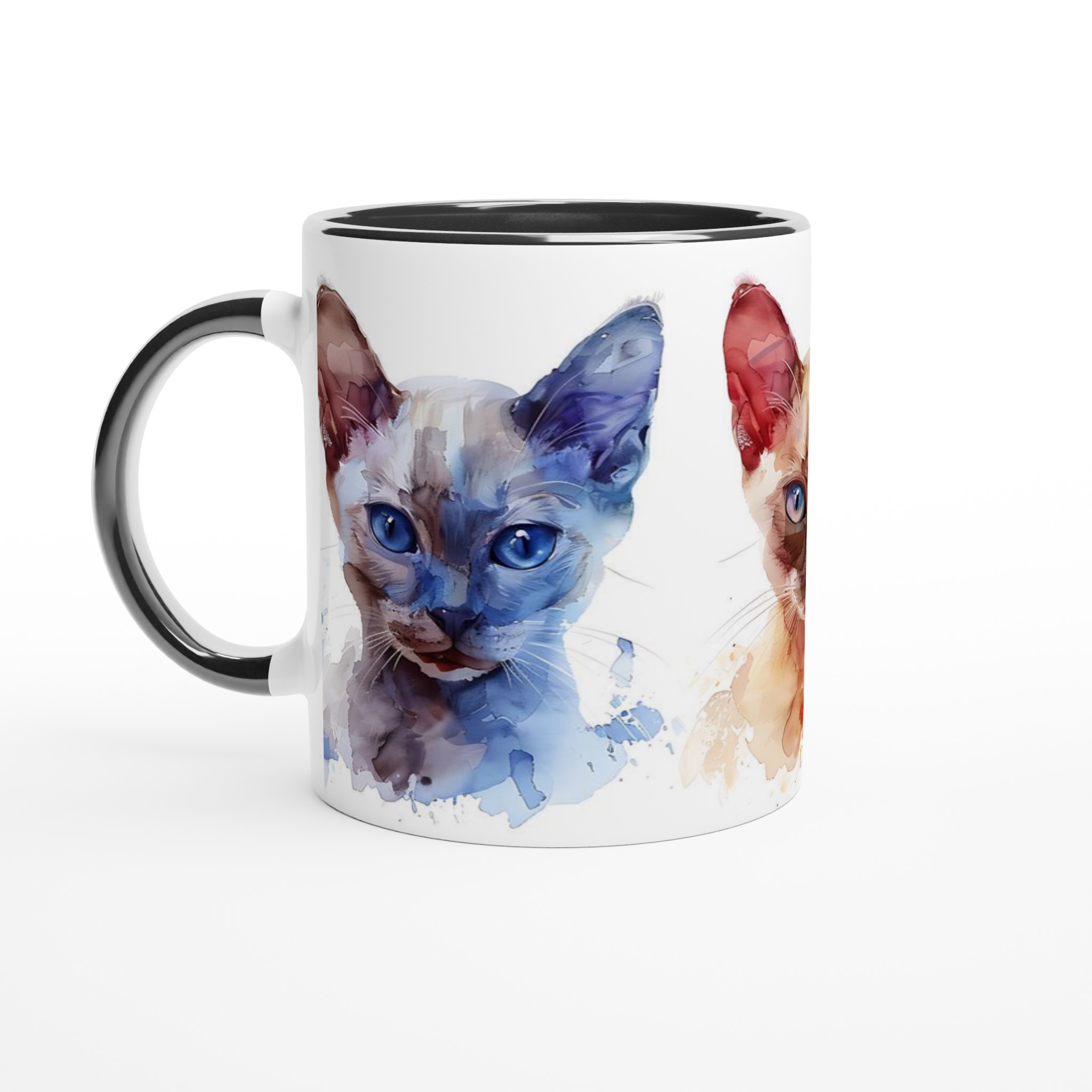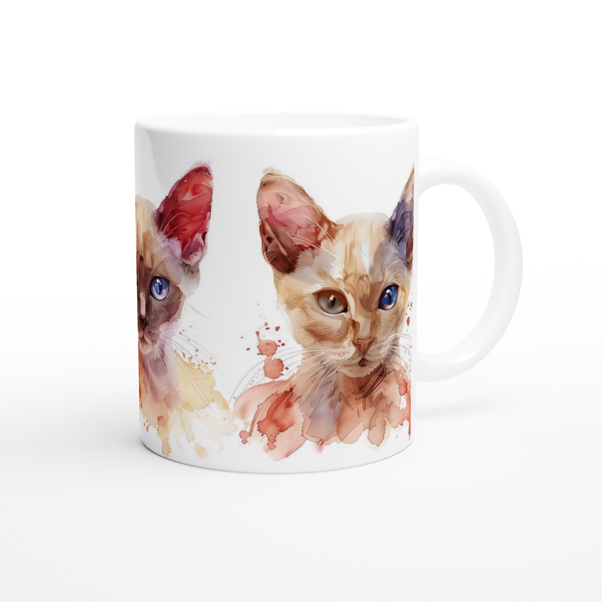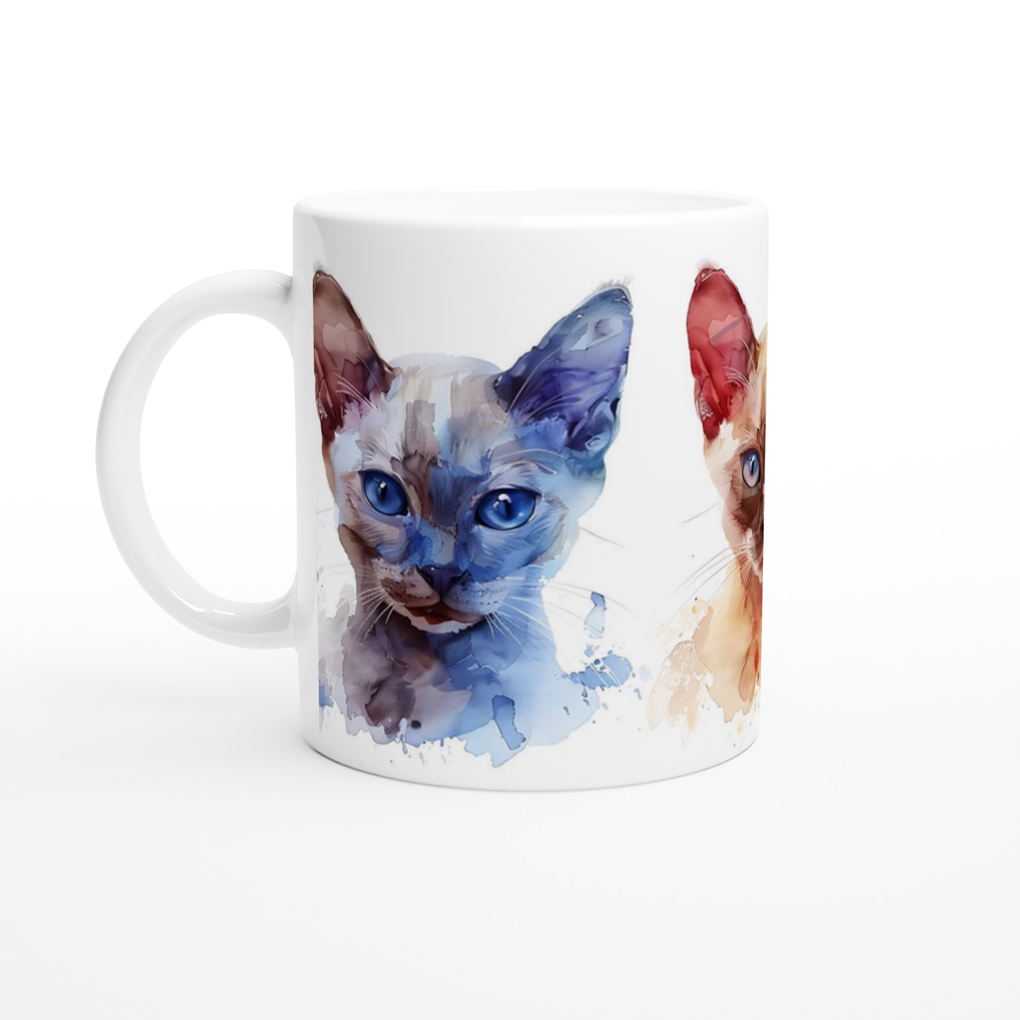 Låt dig förtrollas av dessa lekfulla akvarellkatter varje gång du tar en klunk! Den här stilrena keramiska muggen blir snabbt en vardagsfavorit. Perfekt för morgonkaffet, kvällens varma choklad eller när du bara vill njuta av en kopp te. Med sitt unika kattmotiv, målat i livliga akvarelltoner som påminner om vattnets klara färger och konstnärliga penseldrag, ger den en personlig touch till varje dryckesstund. Den blanka vita ytan gör att trycken framhävs med klara och levande färger, som håller sig fina även efter många turer i mikron och diskmaskinen.