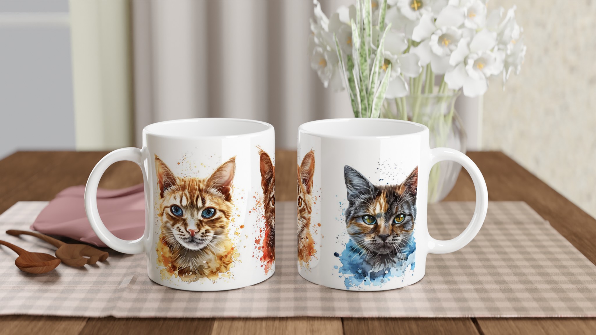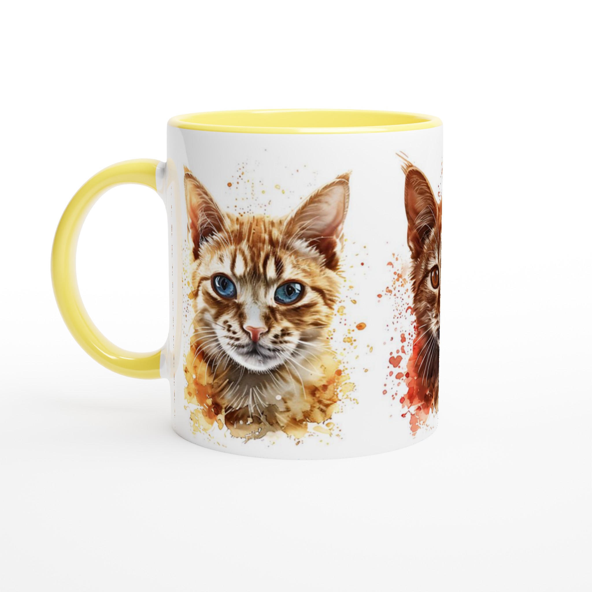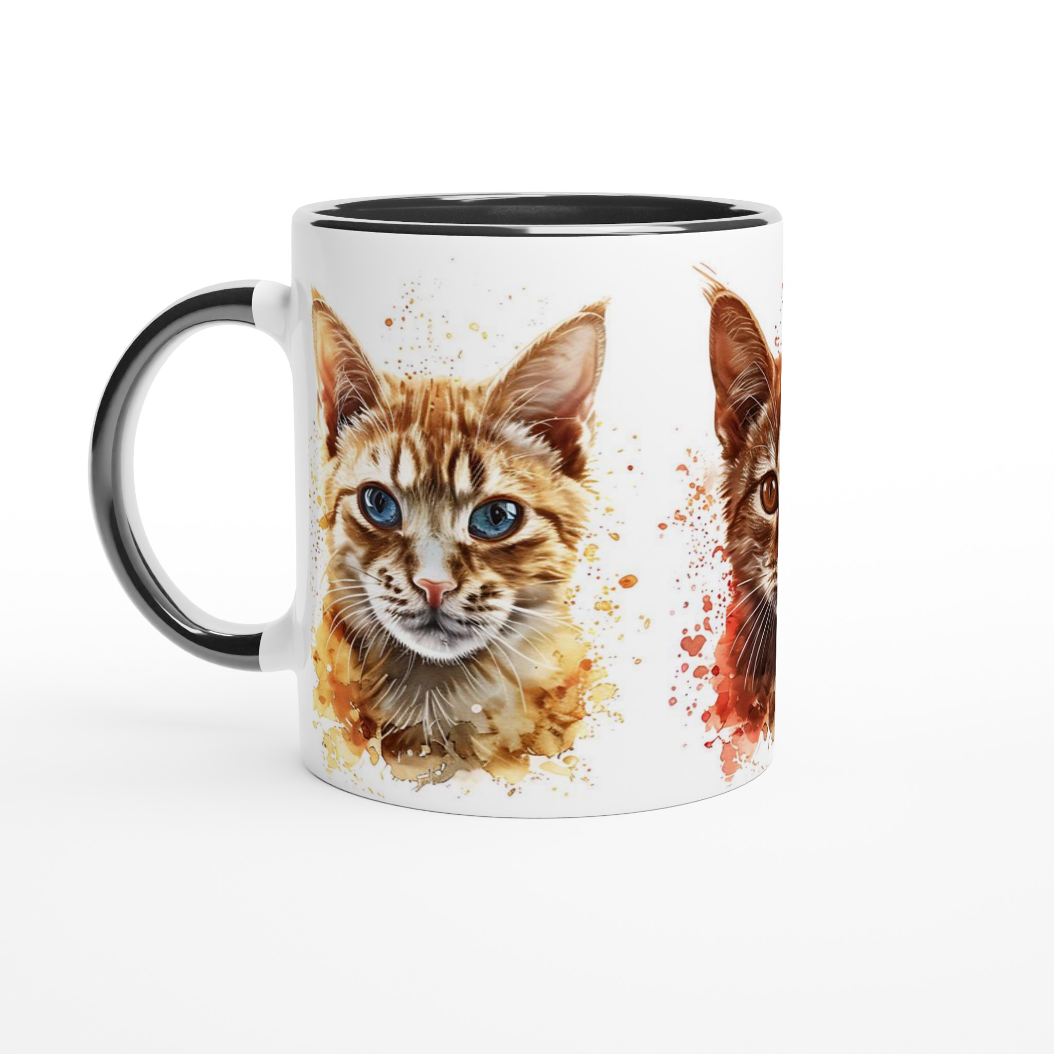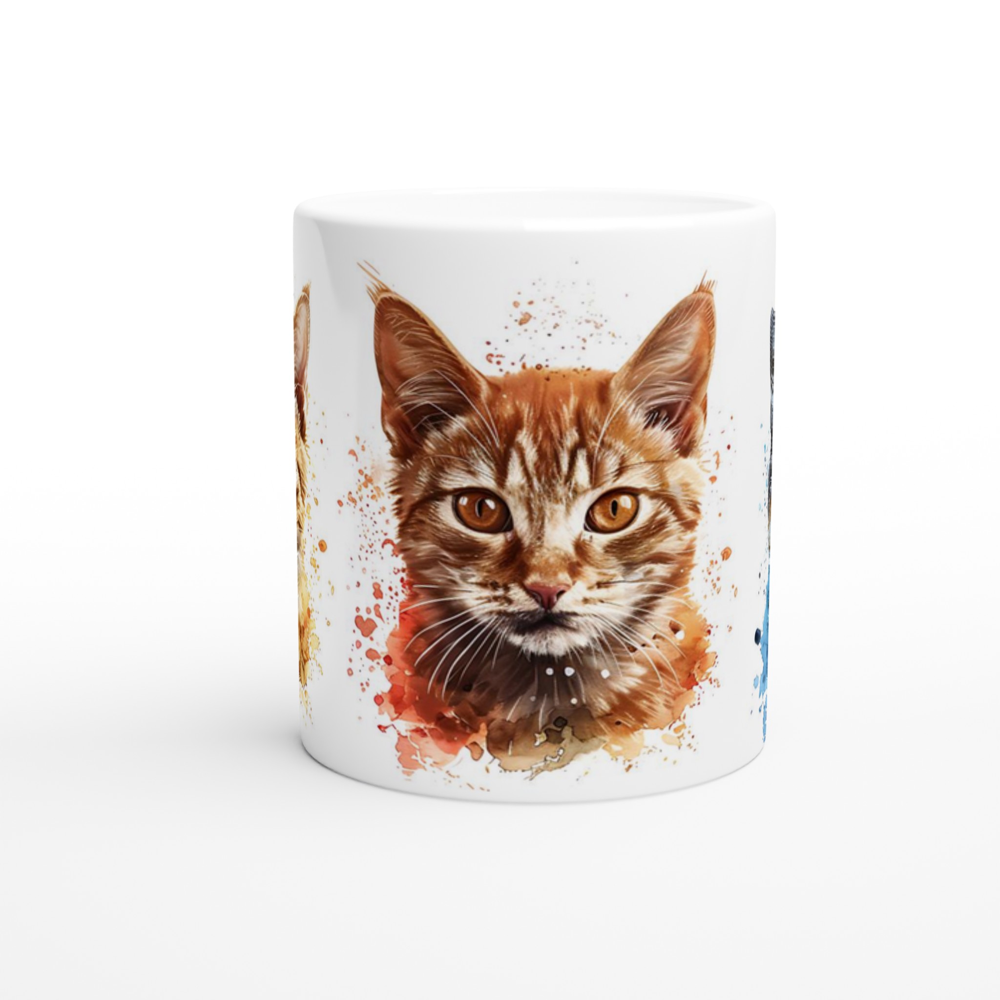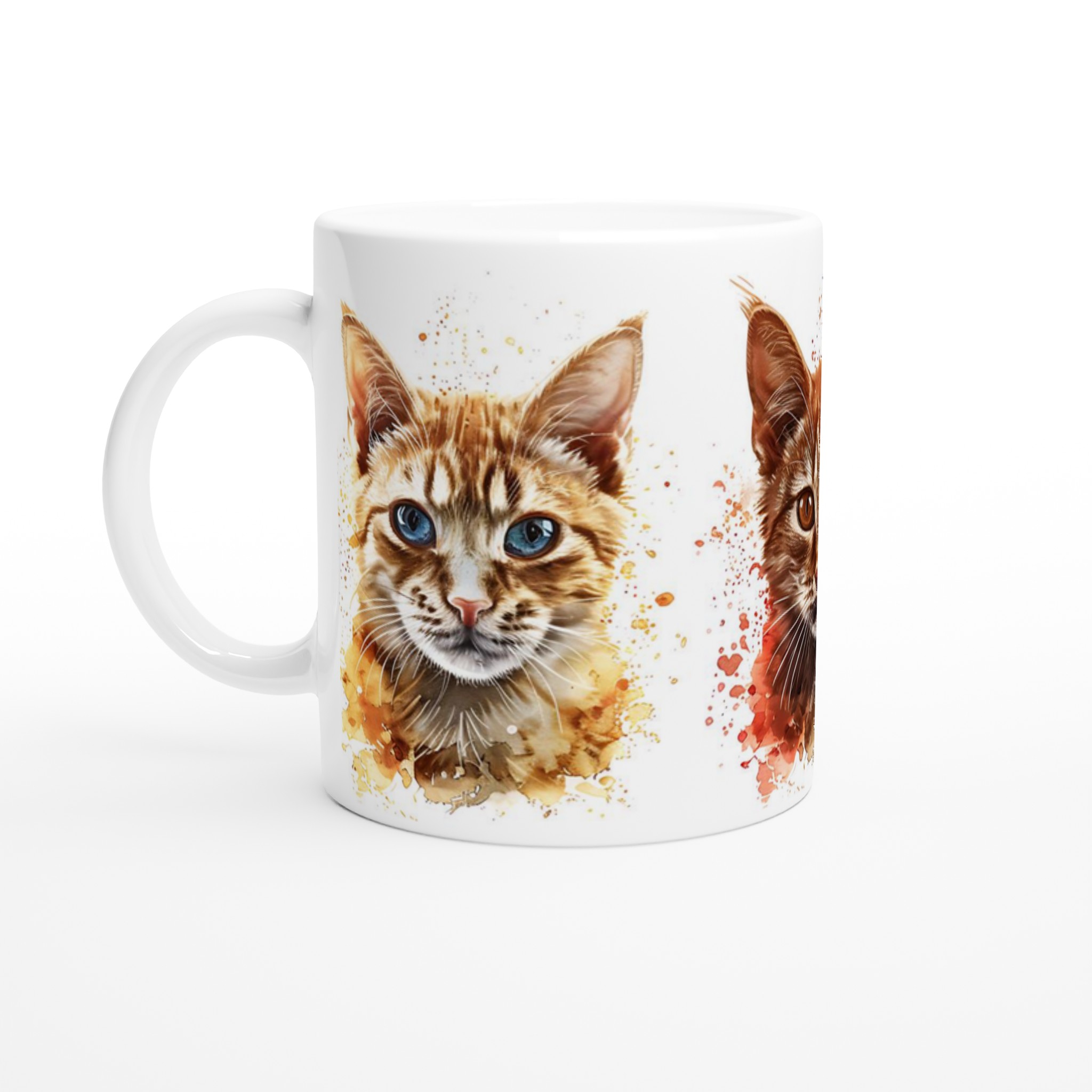 Denna stilrena keramiska mugg blir snabbt en vardagsfavorit, nu med ett förtrollande akvarellporträtt av lekfulla katter! Perfekt för morgonkaffet, kvällens varma choklad eller när du bara vill njuta av en kopp te. Varje kattporträtt är infärgat med dynamiska akvarellstänk, som ger en konstnärlig och livlig känsla som lyfter fram designen på ett unikt sätt. Den blanka vita ytan gör att trycken framhävs med klara och levande färger, som håller sig fina även efter många turer i mikron och diskmaskinen.
