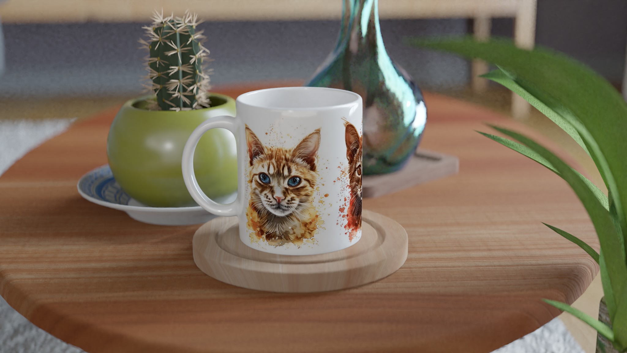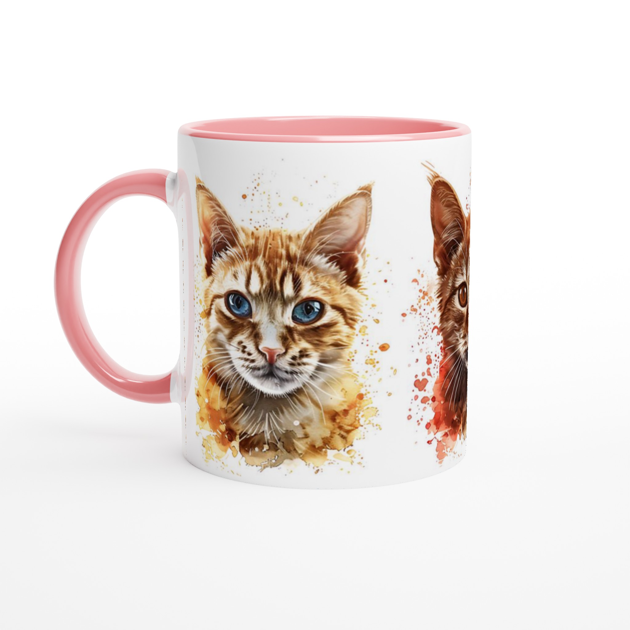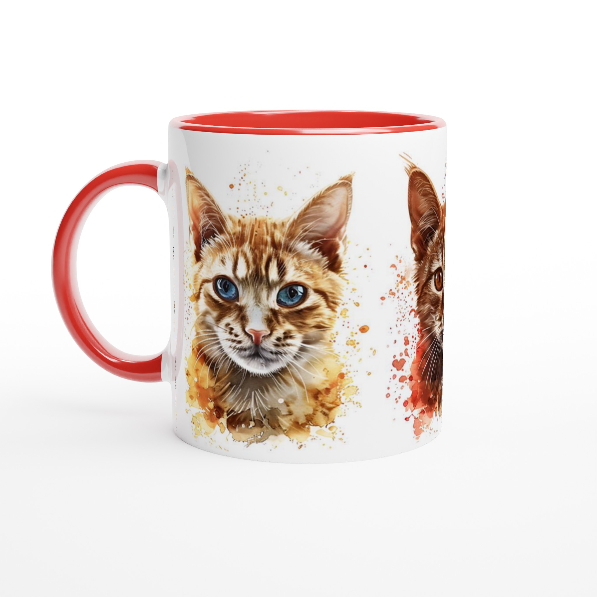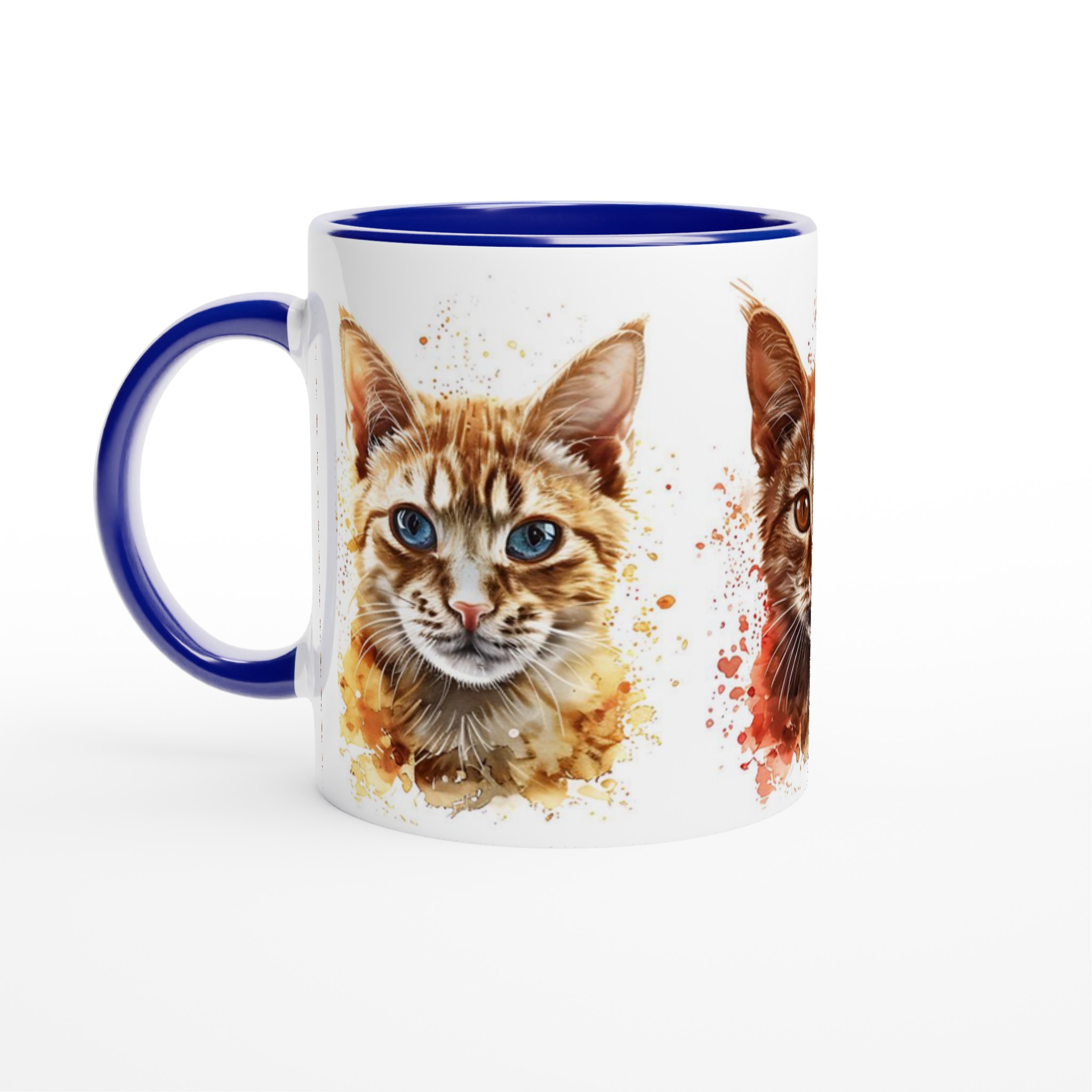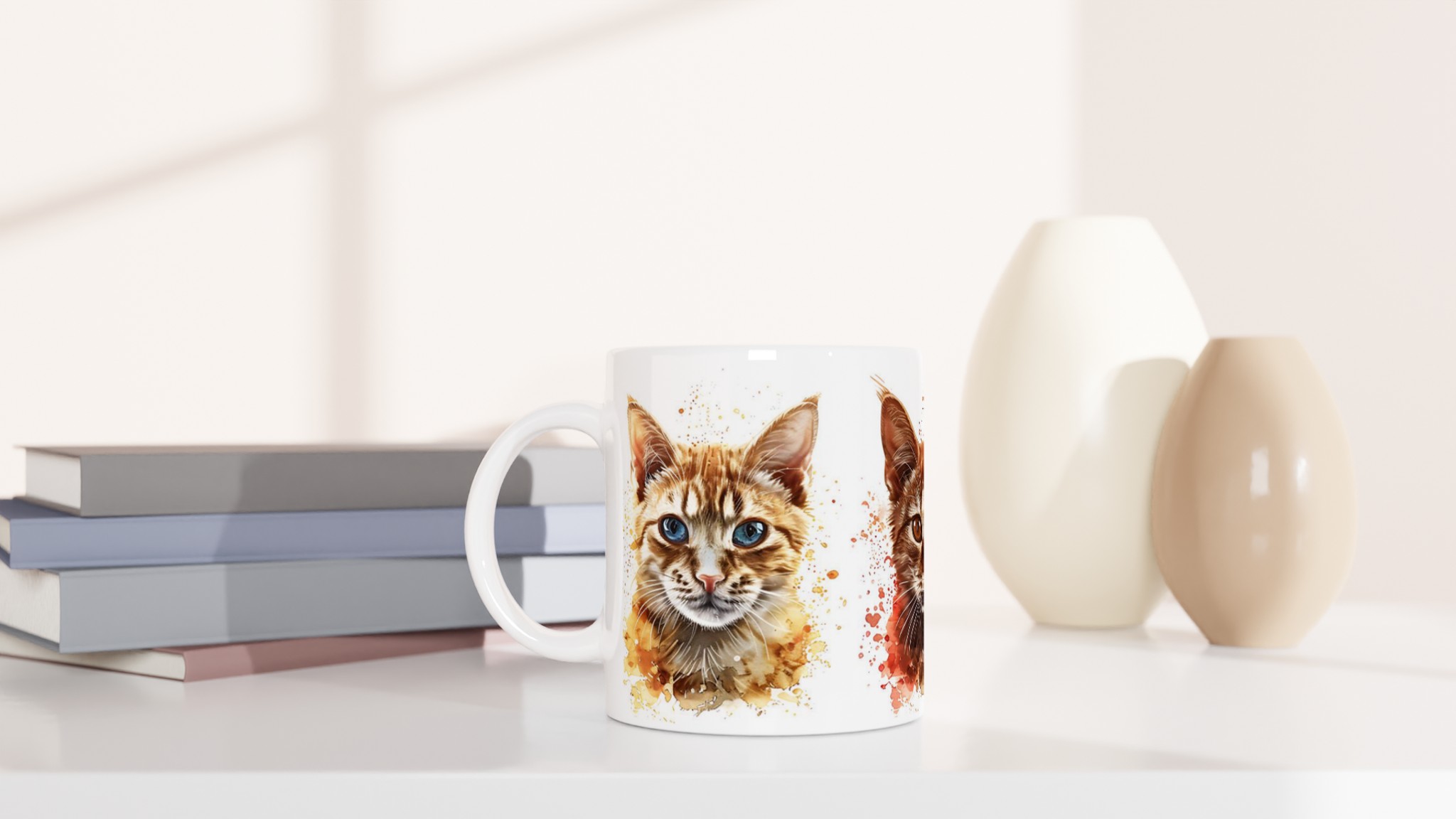 Denna stilrena keramiska mugg blir snabbt en vardagsfavorit, nu med ett förtrollande akvarellporträtt av lekfulla katter! Perfekt för morgonkaffet, kvällens varma choklad eller när du bara vill njuta av en kopp te. Varje kattporträtt är infärgat med dynamiska akvarellstänk, som ger en konstnärlig och livlig känsla som lyfter fram designen på ett unikt sätt. Den blanka vita ytan gör att trycken framhävs med klara och levande färger, som håller sig fina även efter många turer i mikron och diskmaskinen.