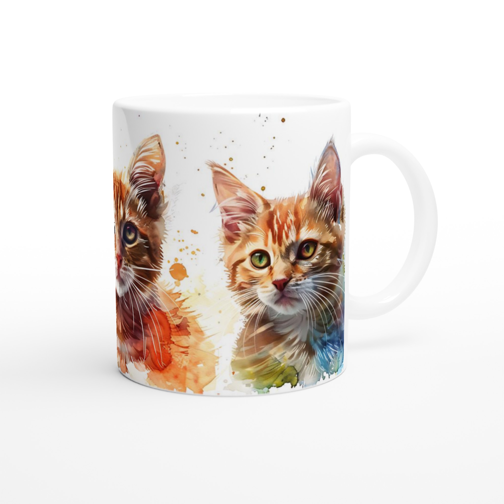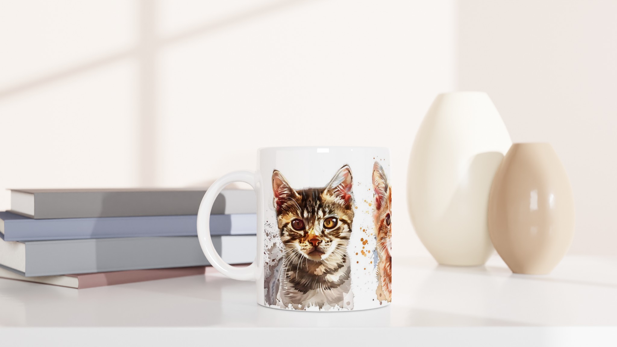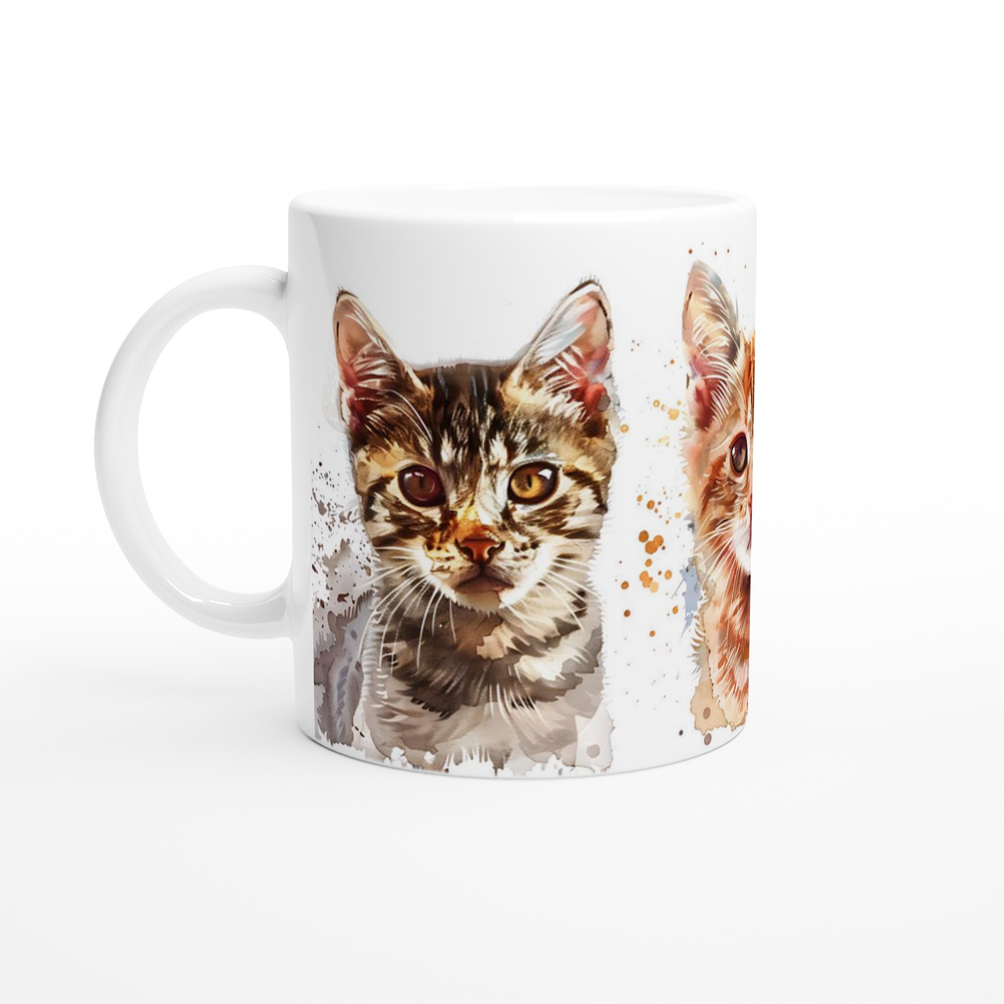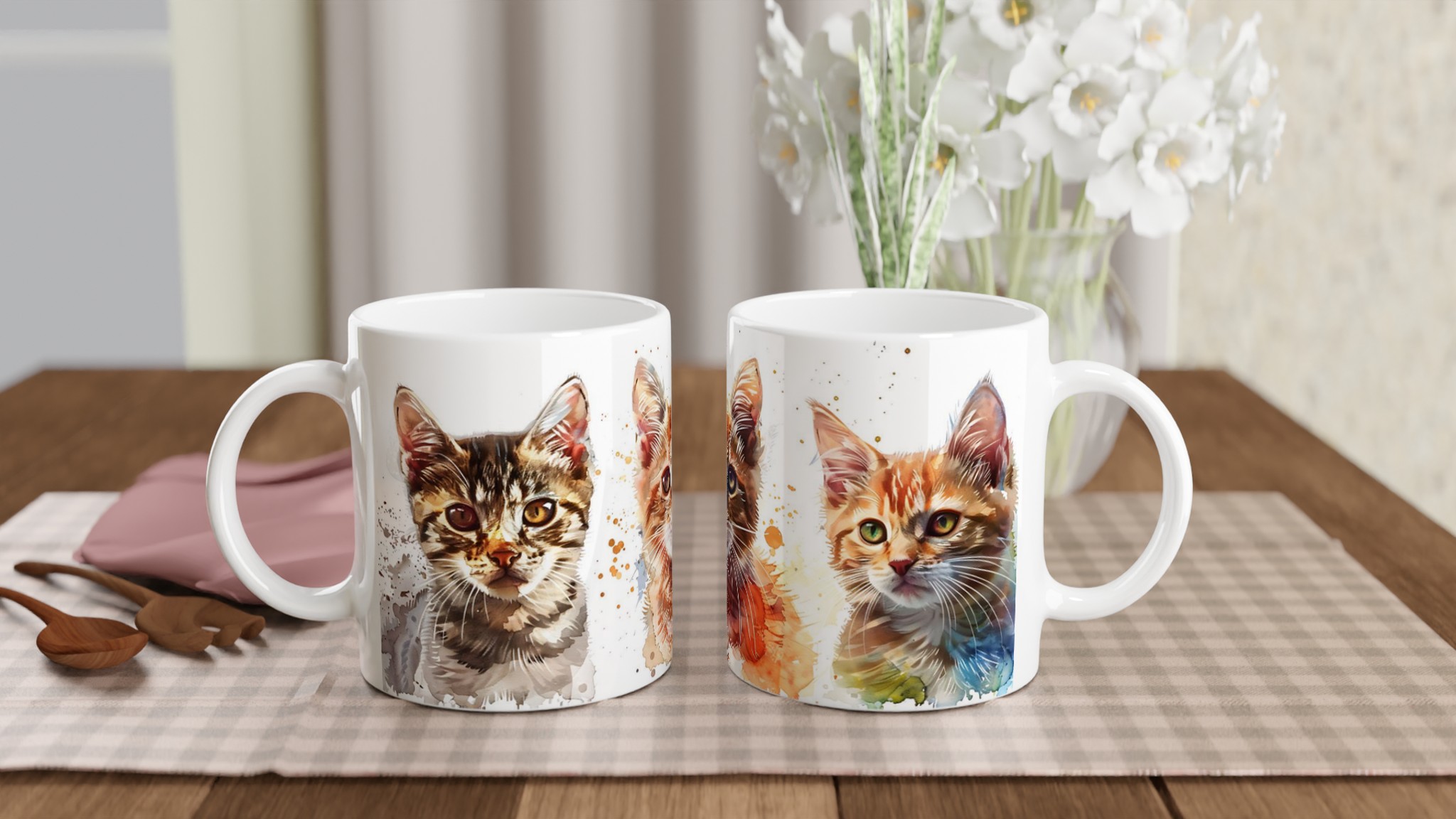 Väck liv i din morgonrutin med vår bedårande keramiska mugg, prydd med charmiga akvarellporträtt av kattungar. Varje klunk blir en fröjd när du omges av dessa lekfulla ansikten, fångade i livliga färgstänk. Denna stilrena mugg blir snabbt en vardagsfavorit, perfekt för morgonkaffet, kvällens varma choklad eller när du bara vill njuta av en kopp te. Den blanka vita ytan framhäver trycken med klara och levande färger, som håller sig fina även efter många turer i mikron och diskmaskinen.