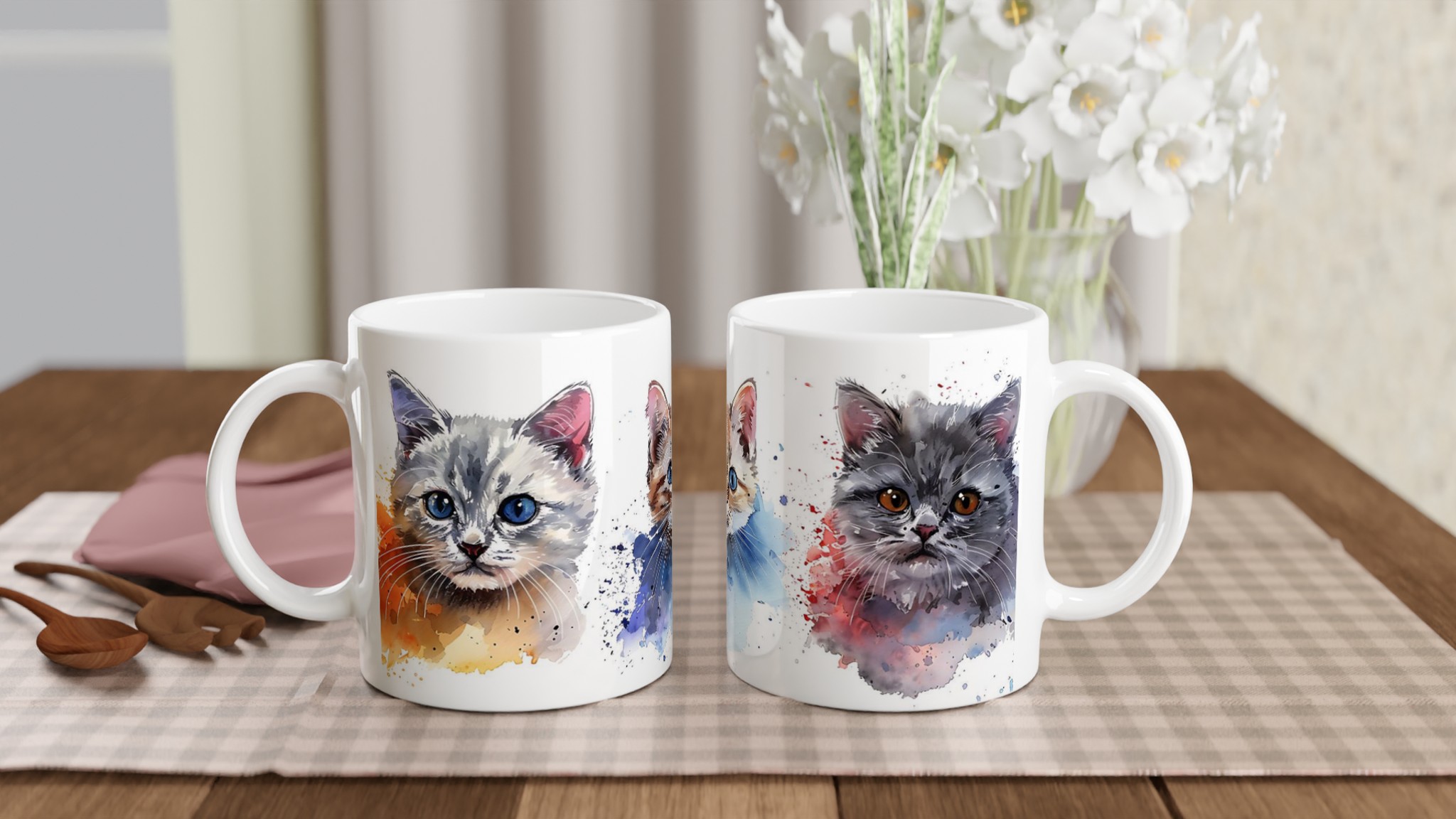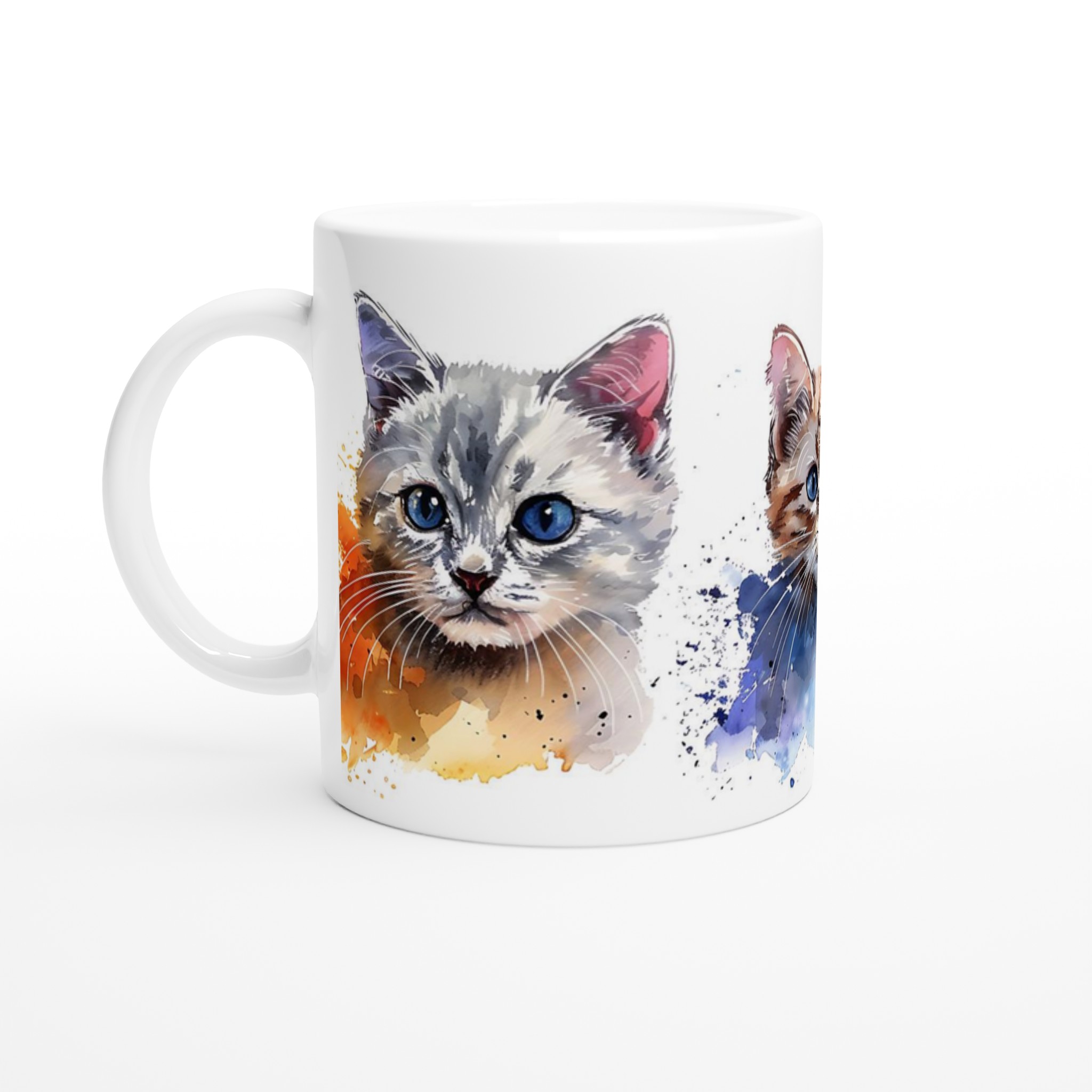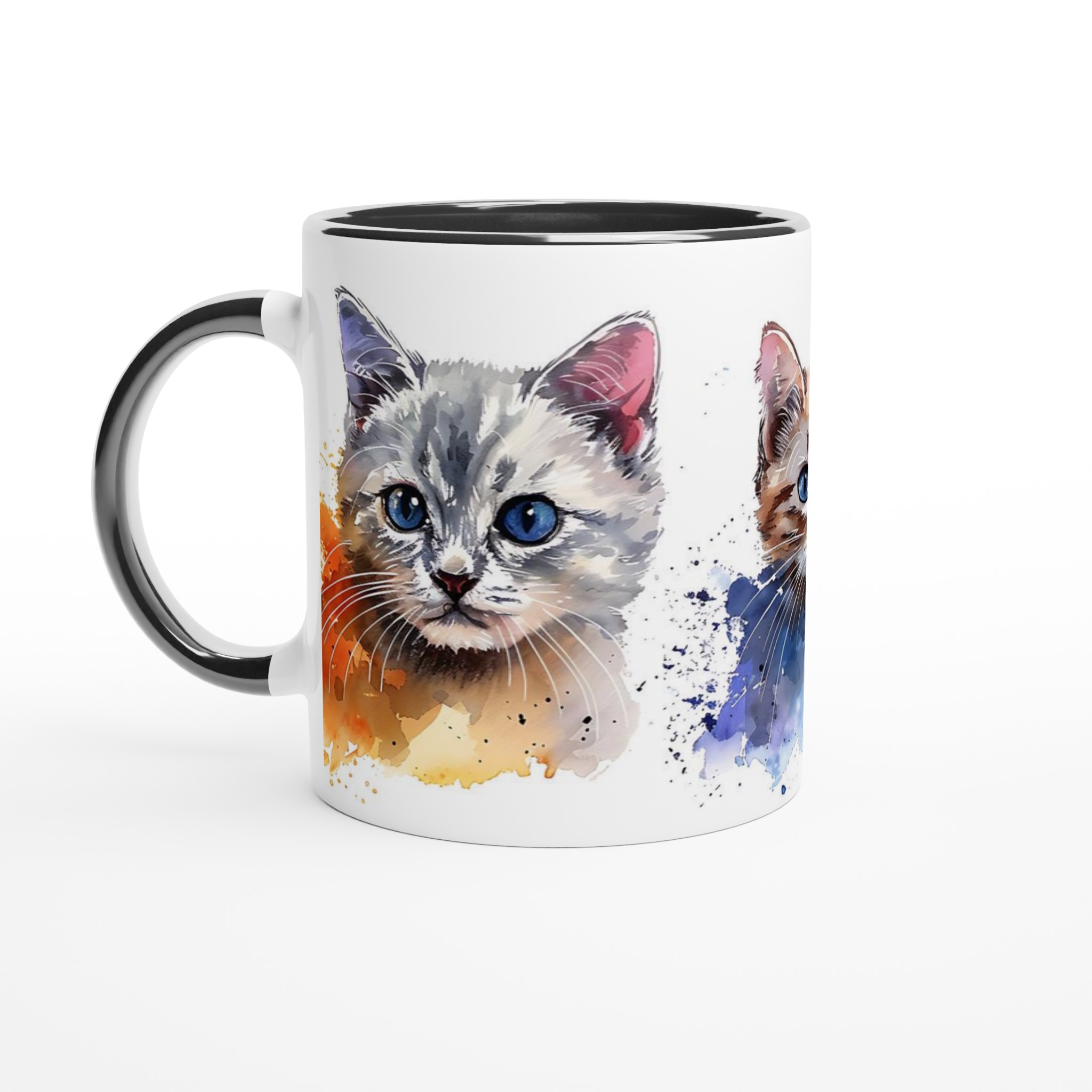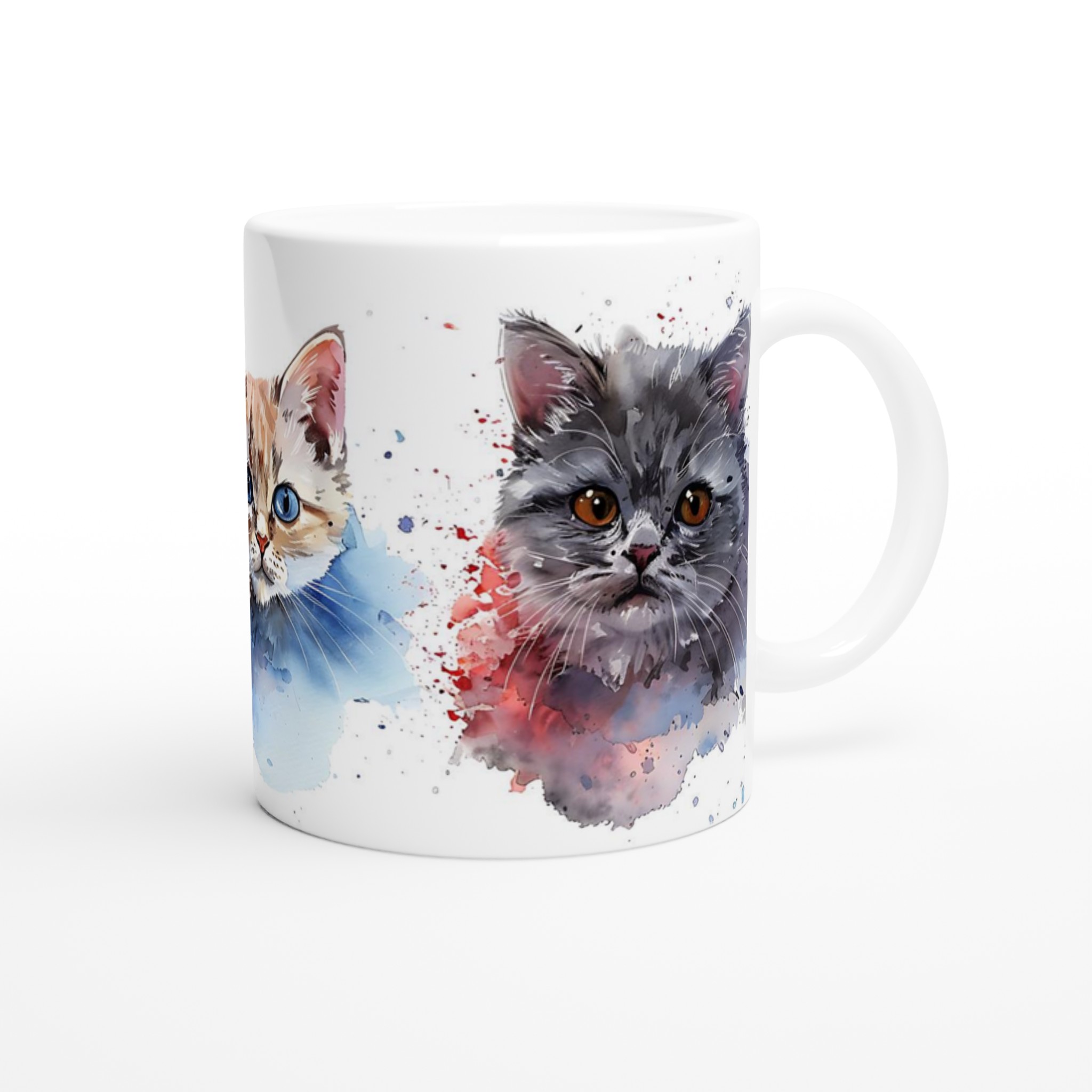Förvandla varje fikastund till en konstupplevelse med vår bedårande akvarell kattmugg. Föreställ dig att du sipprar ditt favoritkaffe eller te, omsluten av värmen från en mugg prydd med tre lekfulla kattungar, målade i en mjuk och drömsk akvarellstil. De uttrycksfulla ögonen och de subtila färgstänken ger liv åt varje kattunge, vilket skapar en känsla av lugn och glädje i din hand.