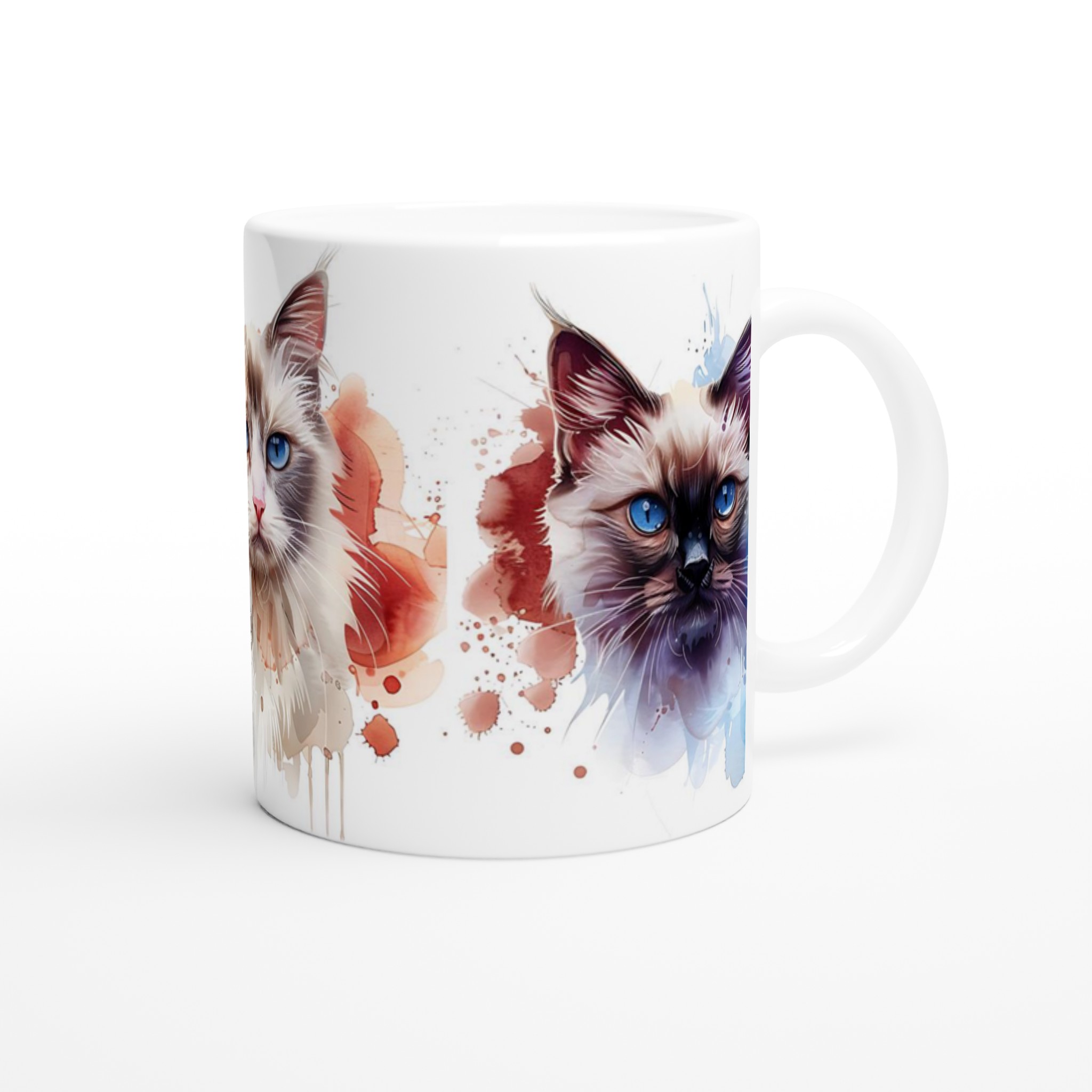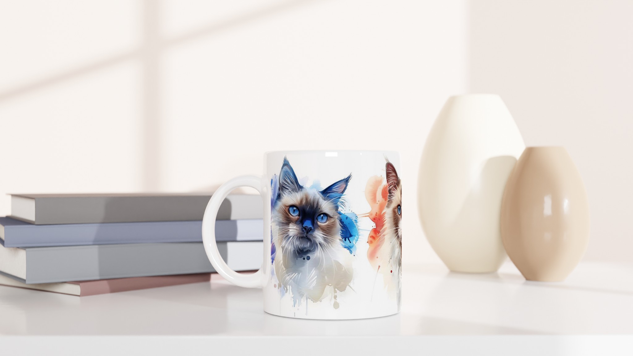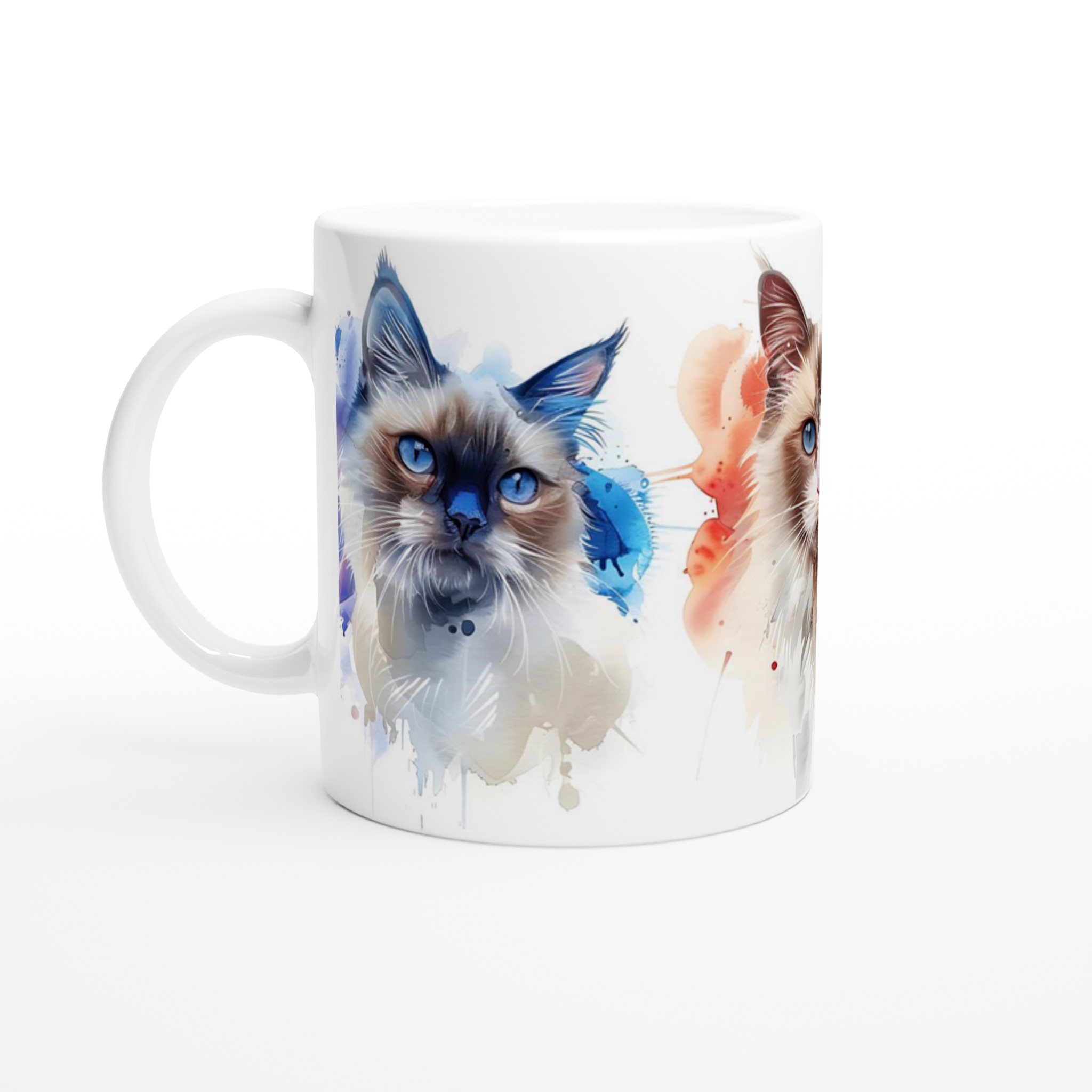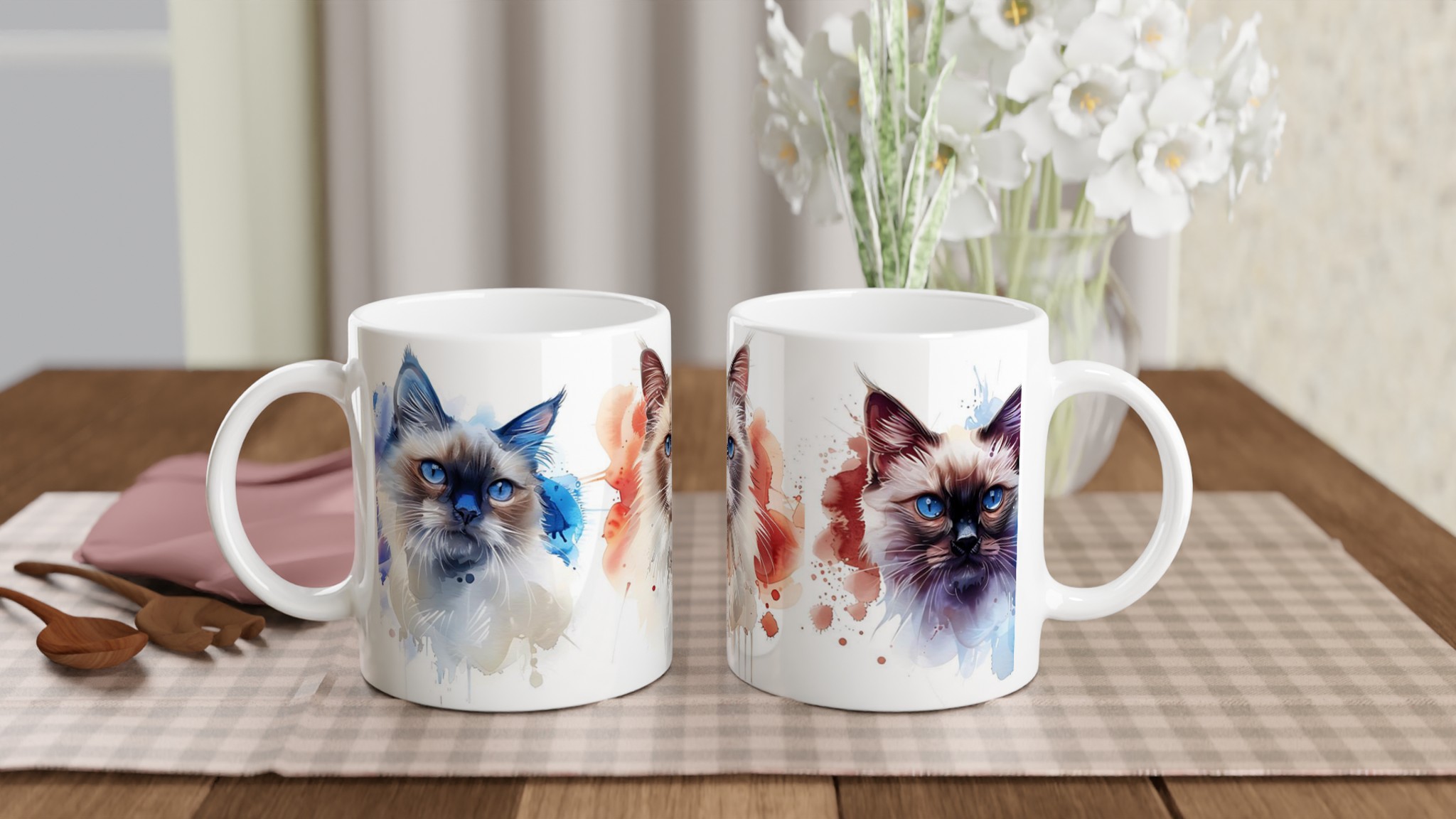 Fånga din kärlek till katter med denna stilrena keramiska mugg, som snabbt blir en vardagsfavorit. Varje mugg pryds av ett charmigt akvarellporträtt av en katt, där de uttrycksfulla blå ögonen och de mjuka färgskiftningarna framhäver den konstnärliga touchen. Perfekt för morgonkaffet, kvällens varma choklad eller när du bara vill njuta av en kopp te.