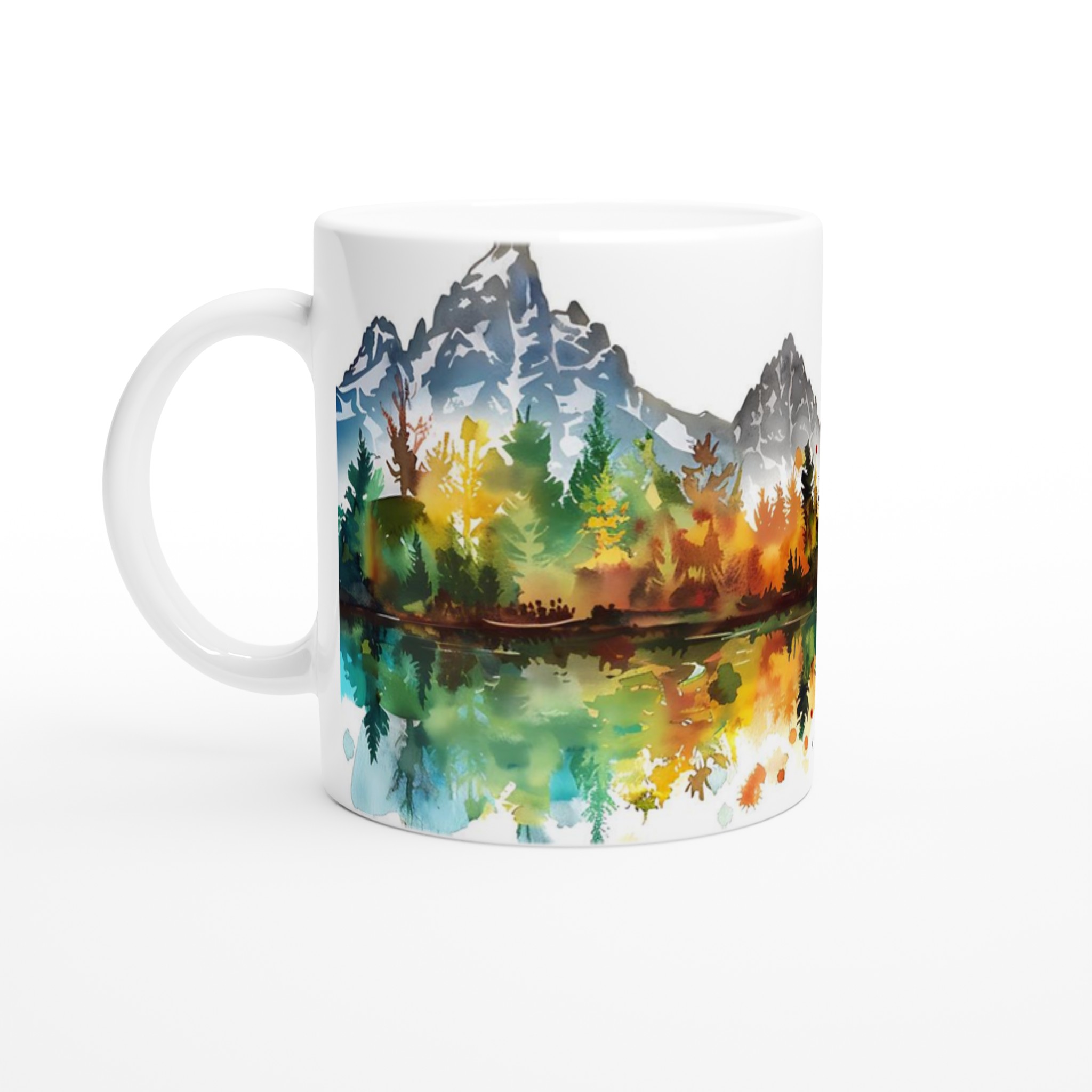 Lyft varje kaffestund med vår premium keramikmugg – stilren, hållbar och skapad för att låta ditt motiv glänsa. Denna fantastiska mugg är prydd med en konstnärlig akvarellmålning som föreställer majestätiska berg och en frodig skog som speglar sig i ett lugnt vatten. De varma höstfärgerna och de livfulla penseldragen ger en känsla av lugn och äventyr till din dag.