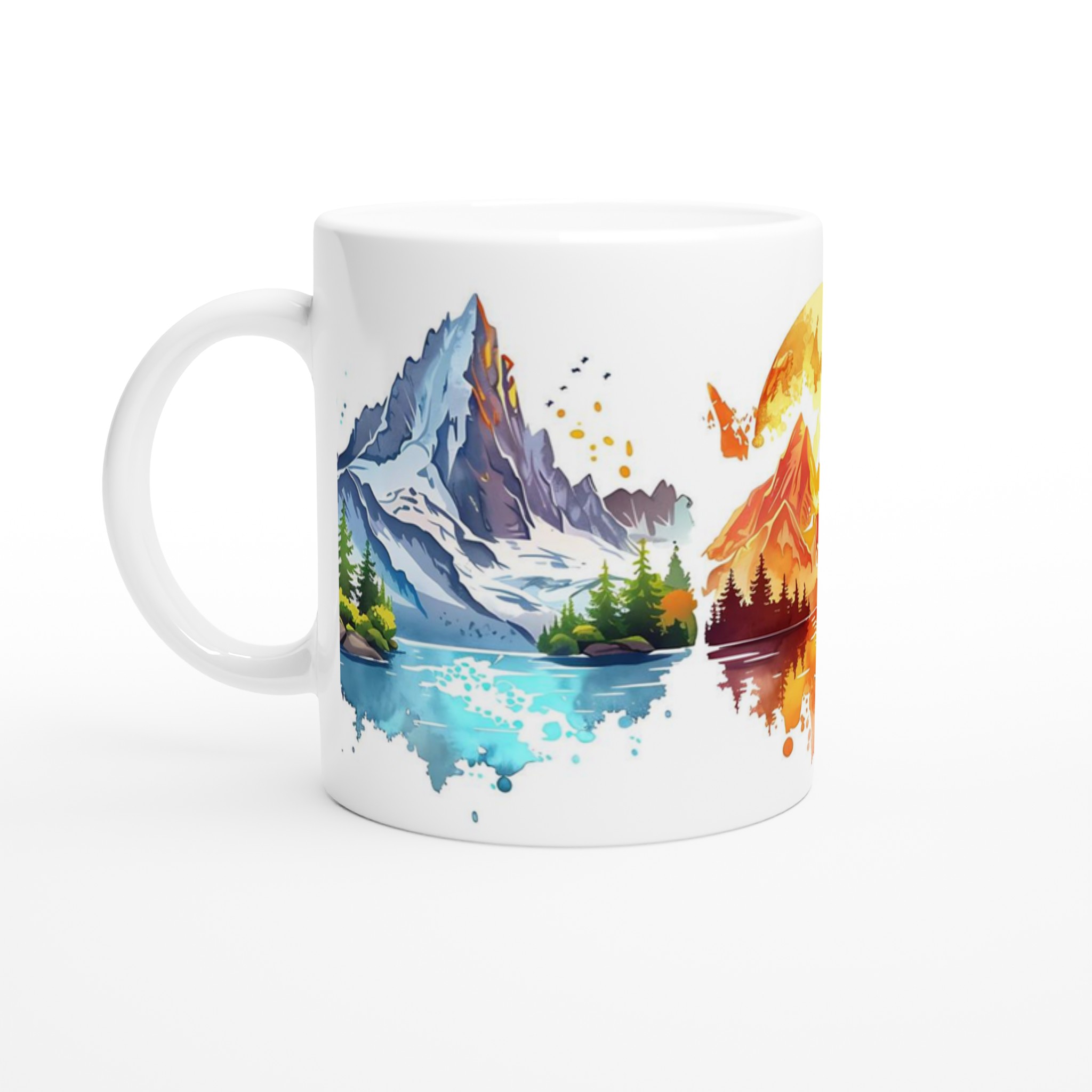 Inspirerad av naturens storslagenhet, med akvarellmålade berg och sjöar i tre unika stilar, ger denna mugg en touch av konst till din vardag. Den blanka vita ytan ger ett skarpt och levande tryck som verkligen sticker ut, oavsett om det är en personlig design, ett roligt citat eller en present till någon du tycker om.