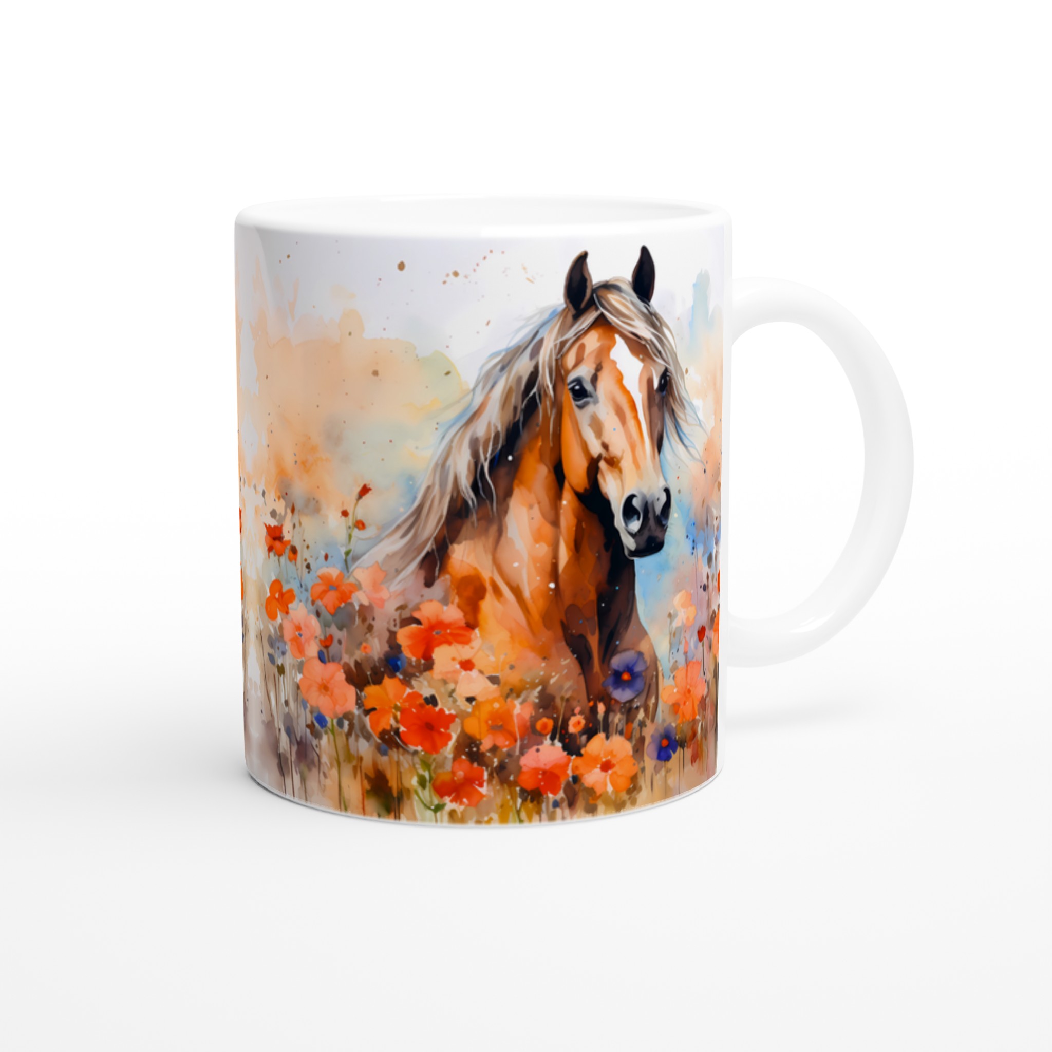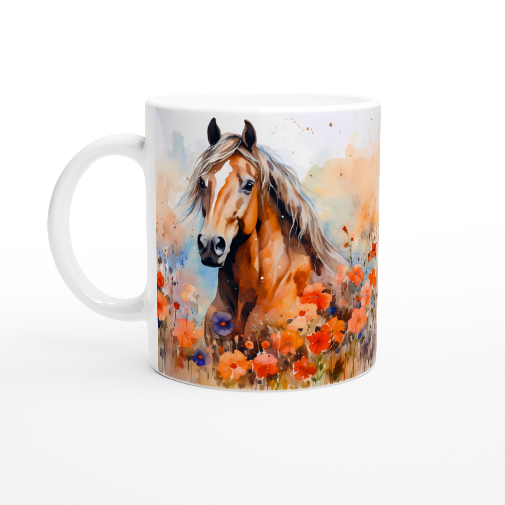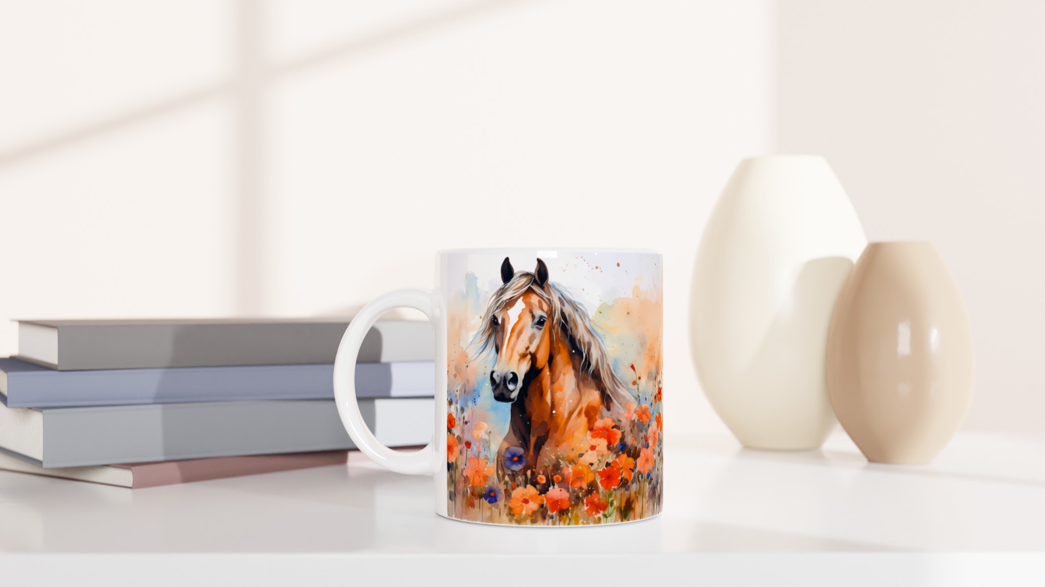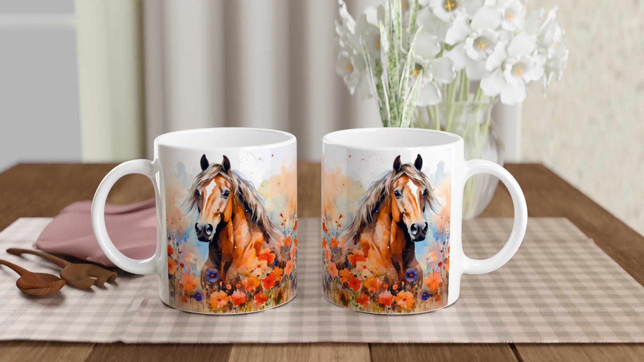Fånga den graciösa skönheten i en akvarellmålad häst, omgiven av levande vildblommor, varje gång du tar en klunk. Denna stilrena keramiska mugg blir snabbt en vardagsfavorit, perfekt för morgonkaffet, kvällens varma choklad eller när du bara vill njuta av en kopp te. Den blanka vita ytan, förutom de färgade alternativen, gör att det drömska trycket framhävs med klara och levande färger, som håller sig fina även efter många turer i mikron och diskmaskinen.
