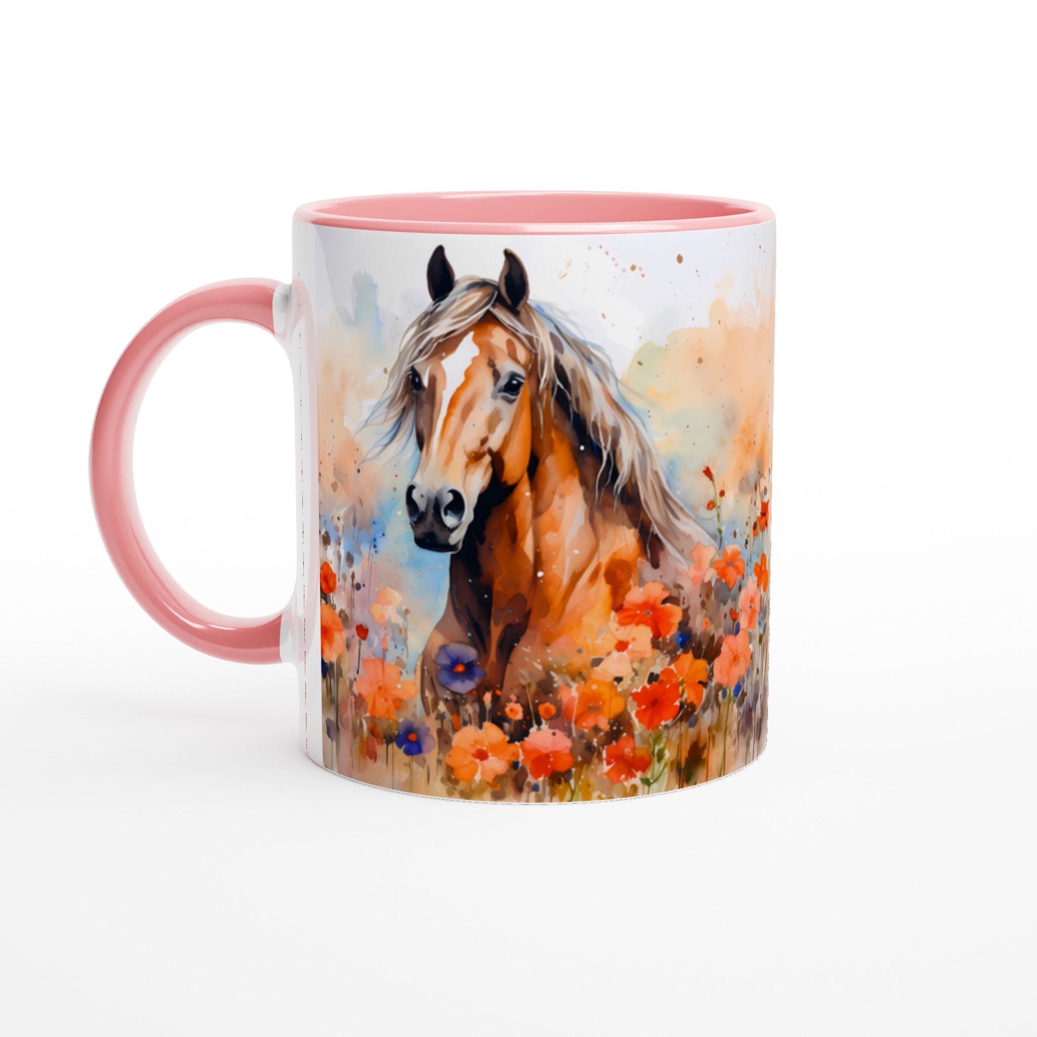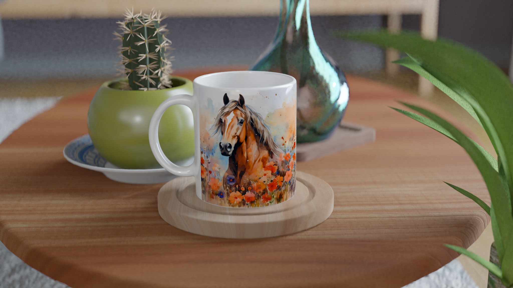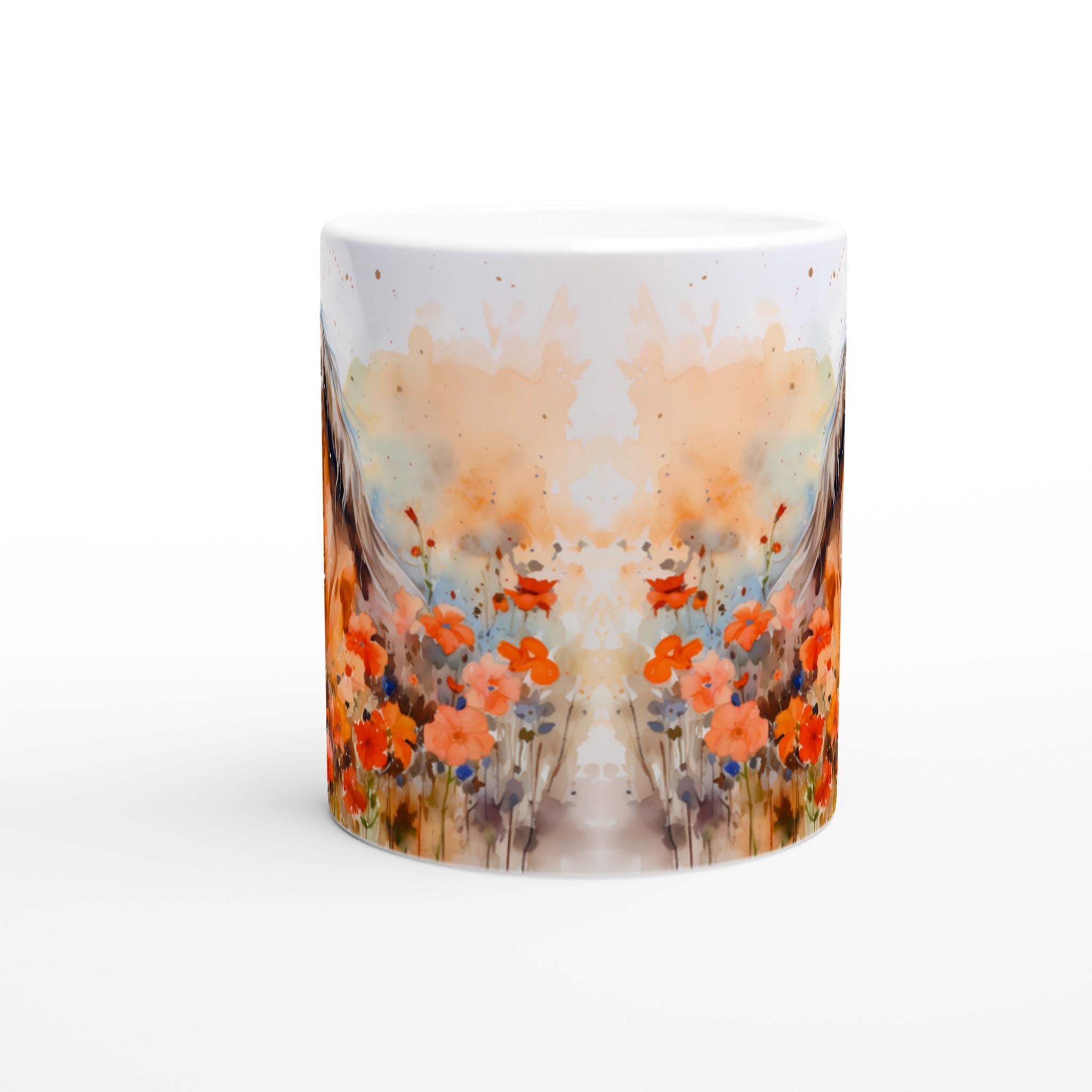 Fånga den graciösa skönheten i en akvarellmålad häst, omgiven av levande vildblommor, varje gång du tar en klunk. Denna stilrena keramiska mugg blir snabbt en vardagsfavorit, perfekt för morgonkaffet, kvällens varma choklad eller när du bara vill njuta av en kopp te. Den blanka vita ytan, förutom de färgade alternativen, gör att det drömska trycket framhävs med klara och levande färger, som håller sig fina även efter många turer i mikron och diskmaskinen.