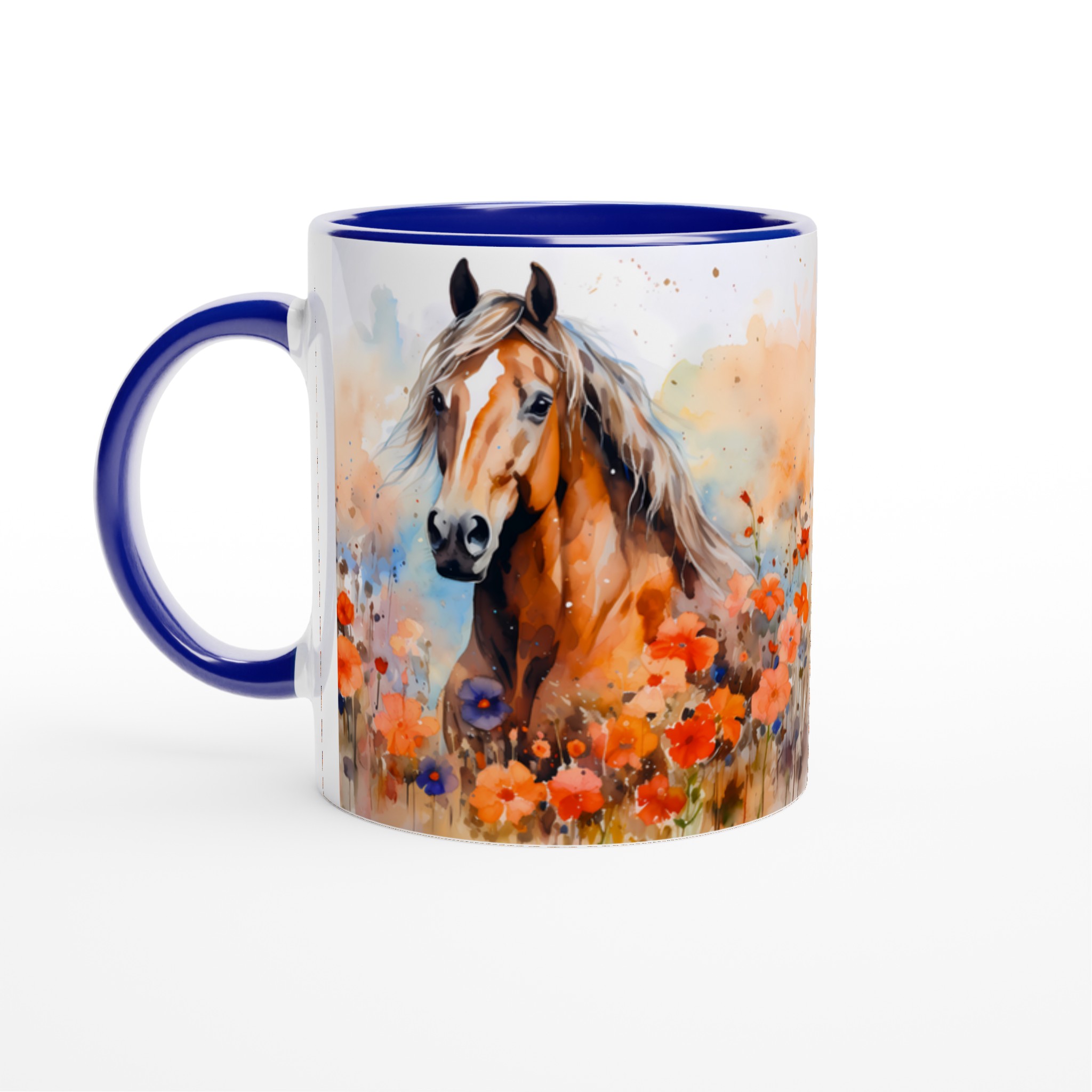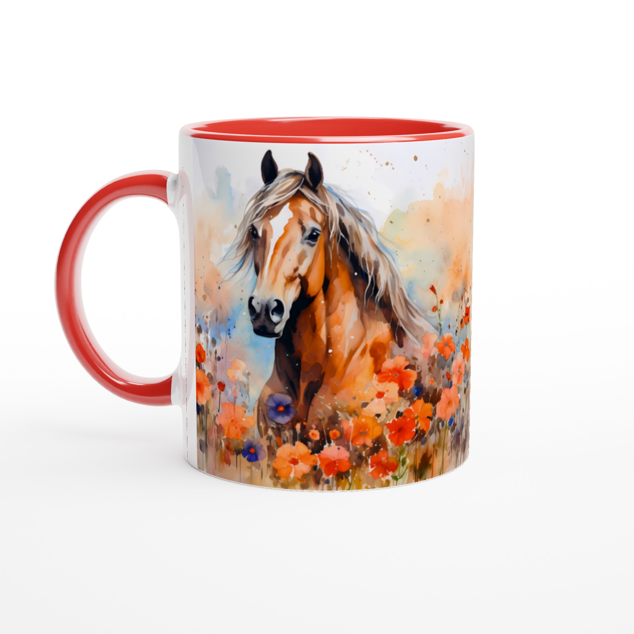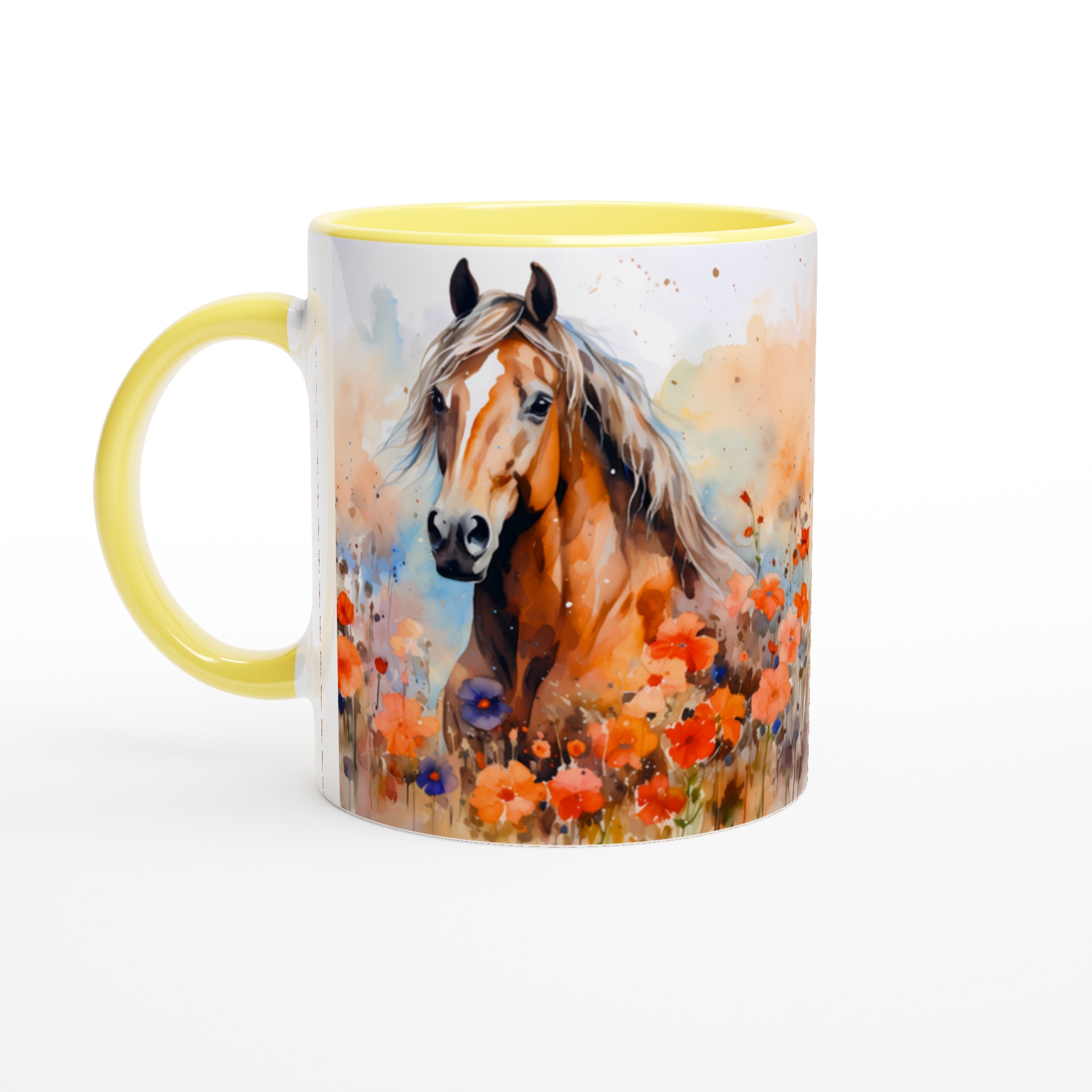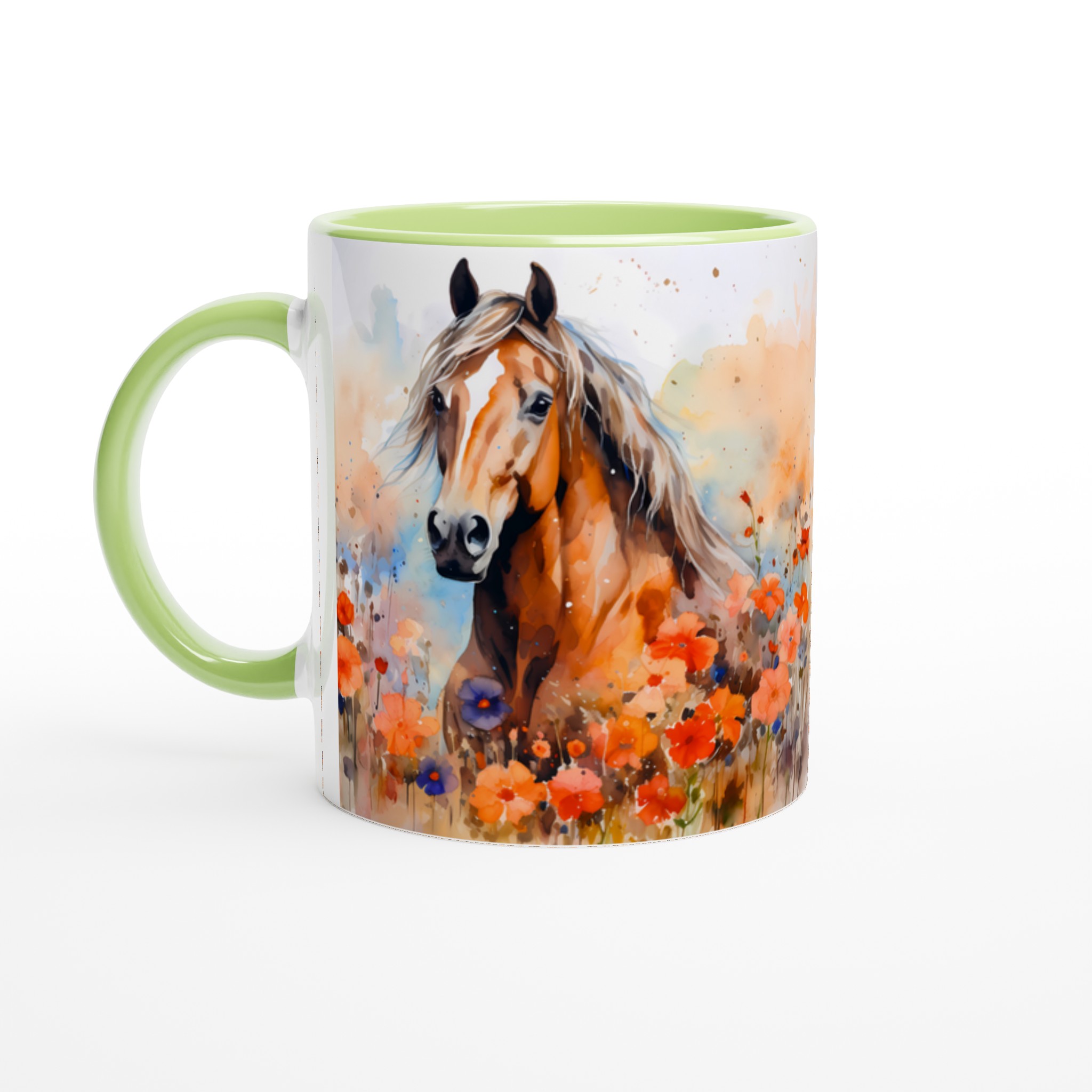Fånga den graciösa skönheten i en akvarellmålad häst, omgiven av levande vildblommor, varje gång du tar en klunk. Denna stilrena keramiska mugg blir snabbt en vardagsfavorit, perfekt för morgonkaffet, kvällens varma choklad eller när du bara vill njuta av en kopp te. Den blanka vita ytan, förutom de färgade alternativen, gör att det drömska trycket framhävs med klara och levande färger, som håller sig fina även efter många turer i mikron och diskmaskinen.