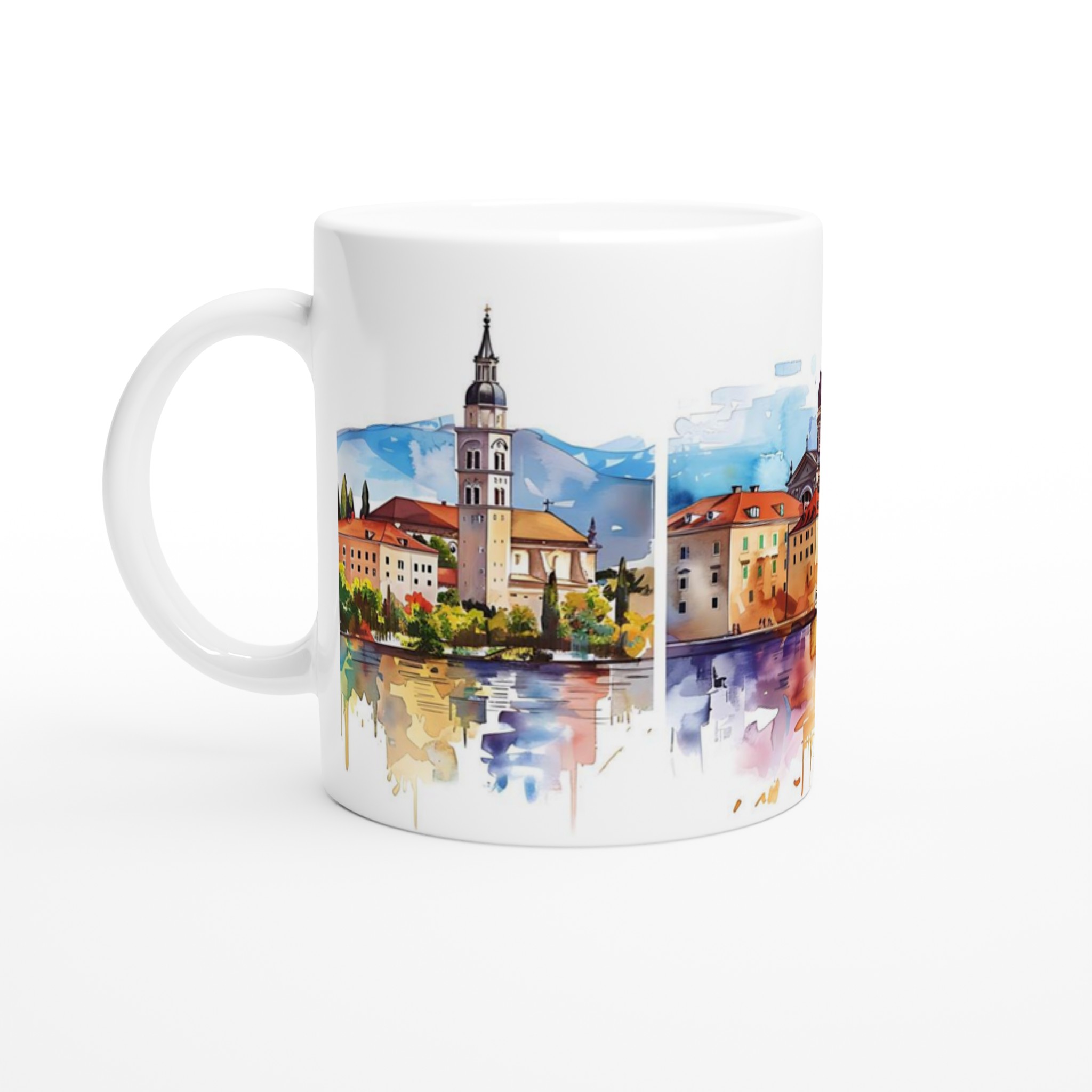 Dröm dig bort till soliga Medelhavsstäder med vår exklusiva akvarellmugg. Det konstnärliga motivet fångar charmen hos pittoreska byggnader och speglar sig i lugna vattenytor, allt målat med en levande palett av blått, orange och lila. Denna mugg är inte bara en drickbehållare, utan ett konstverk som förvandlar din fikapaus till en stund av inspiration. Välj bland en rad keramiska färger för att perfekt matcha din stil eller ge bort en oförglömlig present.