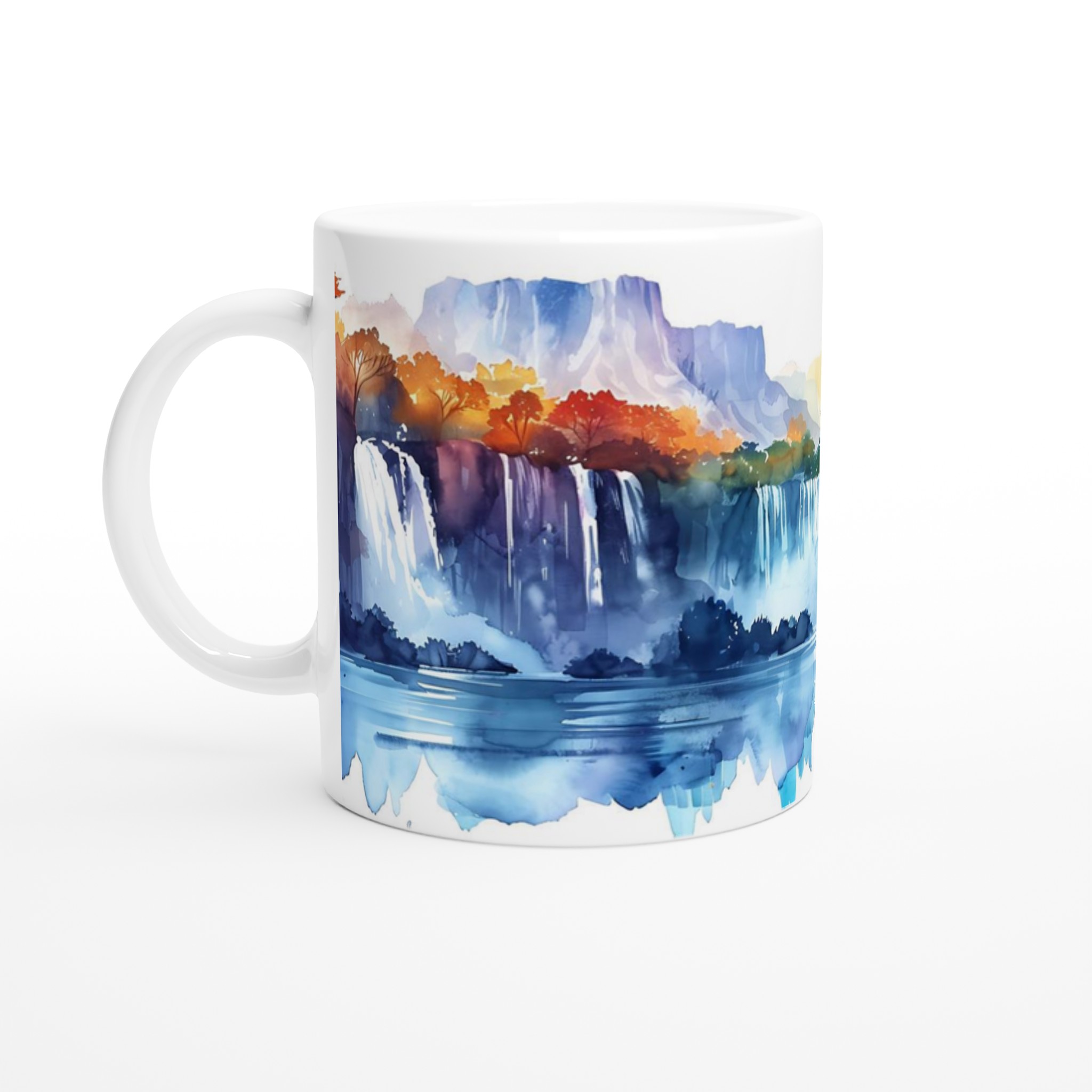 Denna förtrollande mugg pryds av ett akvarellinspirerat vattenfall som fångar ögats med sin lugnande palett av blått, lila och jordnära toner. Den blanka vita ytan ger ett skarpt och levande tryck som verkligen sticker ut, oavsett om det är en personlig design, ett roligt citat eller en present till någon du tycker om.