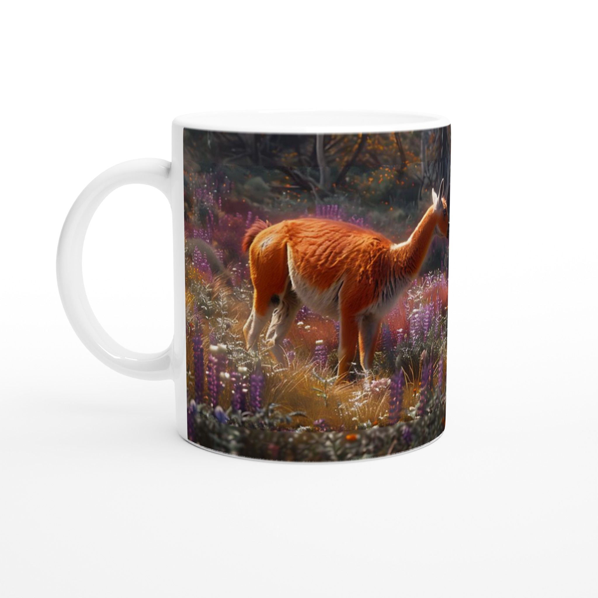 Föreställ dig en lugn solnedgång över lila ängar, där en majestätisk alpacka står bland vilda blommor. Denna förtrollande scen fångar naturens skönhet och ro, perfekt för att starta din dag med inspiration eller för att koppla av med din favoritdryck på kvällen.