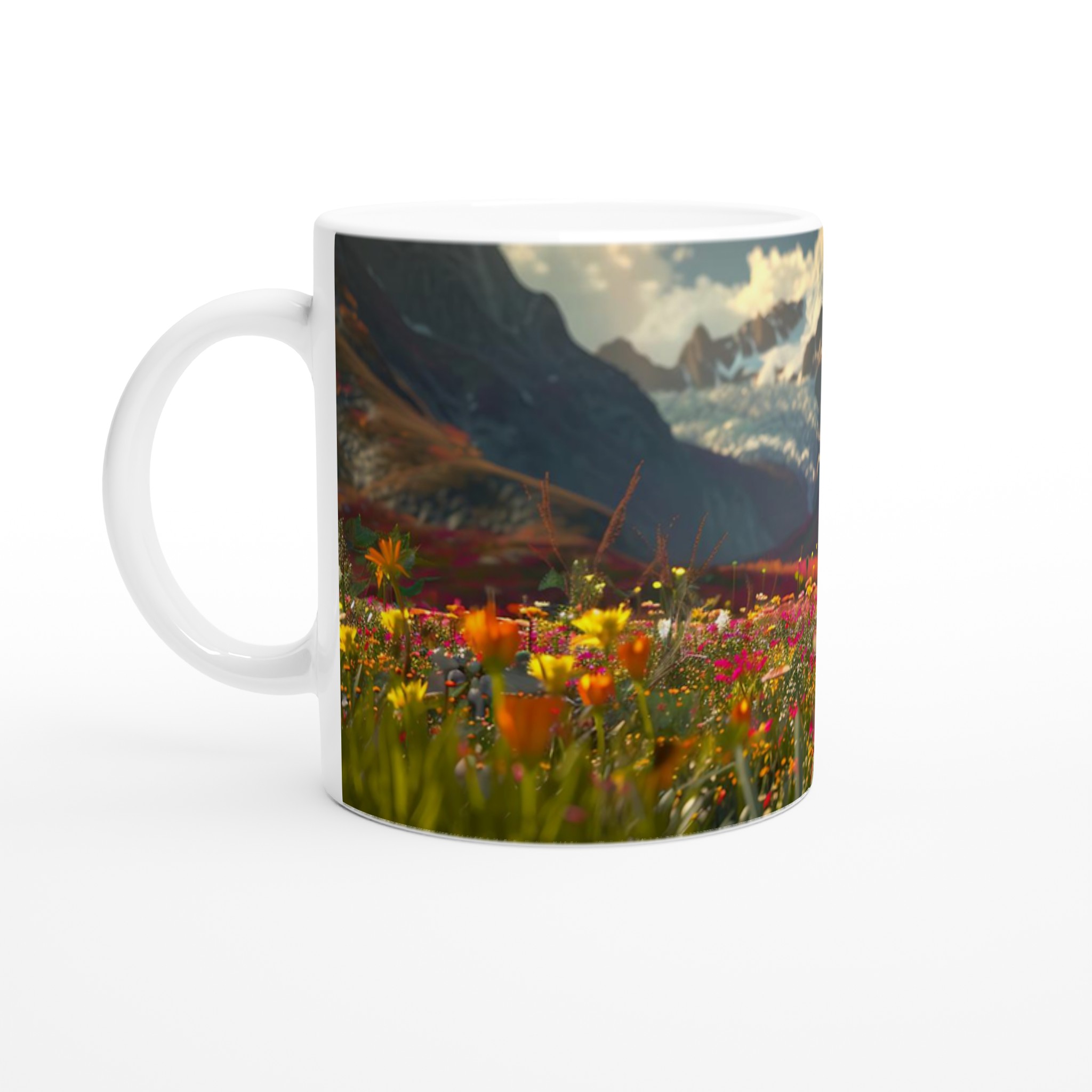 Lyft varje kaffestund med vår premium keramikmugg – stilren, hållbar och skapad för att låta ditt motiv glänsa. Föreställ dig en vacker alpinsk äng, fylld med färgglada vildblommor och en charmig alpacka, fångad på din alldeles egen mugg.