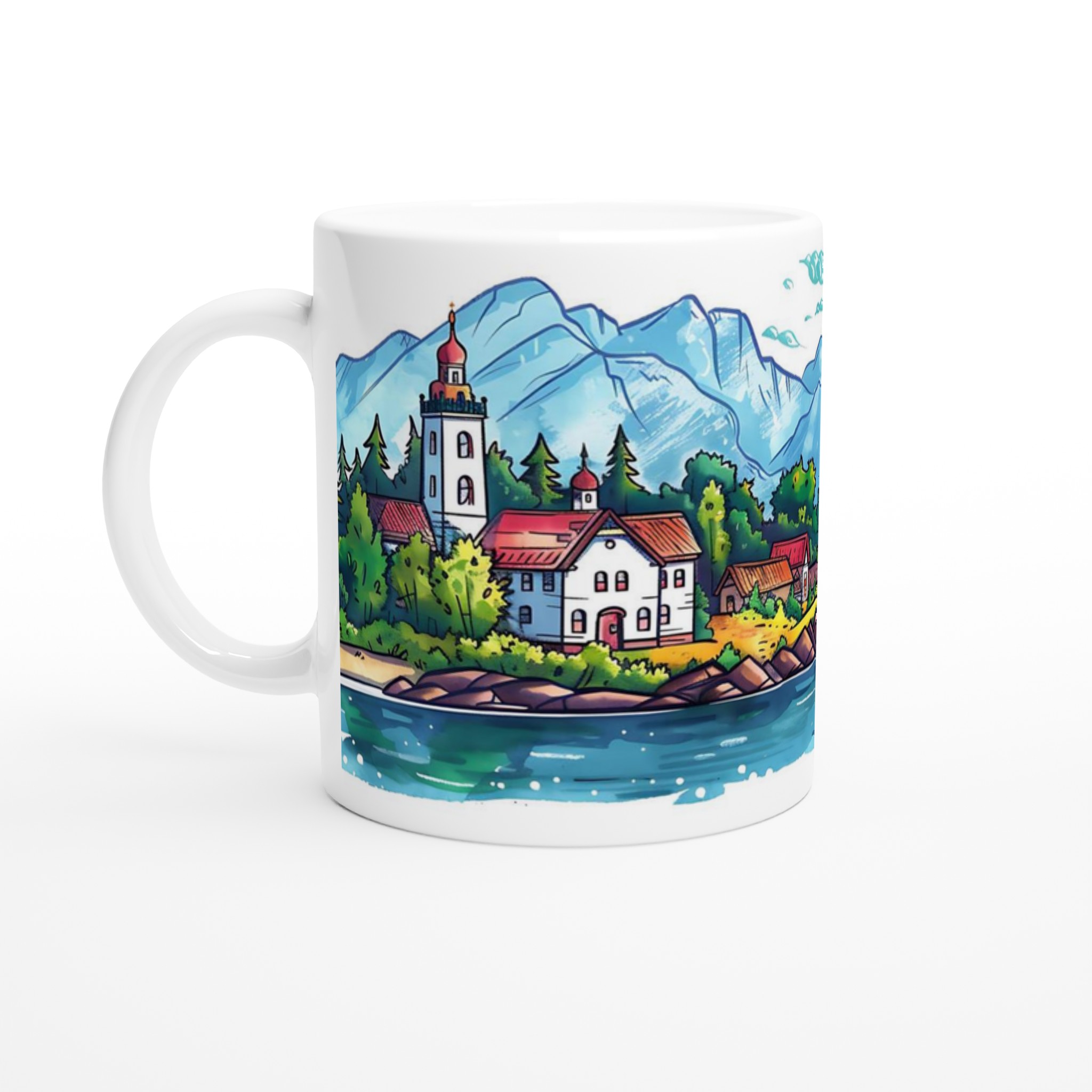 Inspirerad av lugnet och skönheten i en skandinavisk bergsby vid vattnet, är denna mugg en perfekt blandning av konst och funktionalitet. Den akvarell-inspirerade designen med sina klara linjer och naturnära färger, från de majestätiska bergen till det fridfulla vattnet, gör varje klunk till en upplevelse.