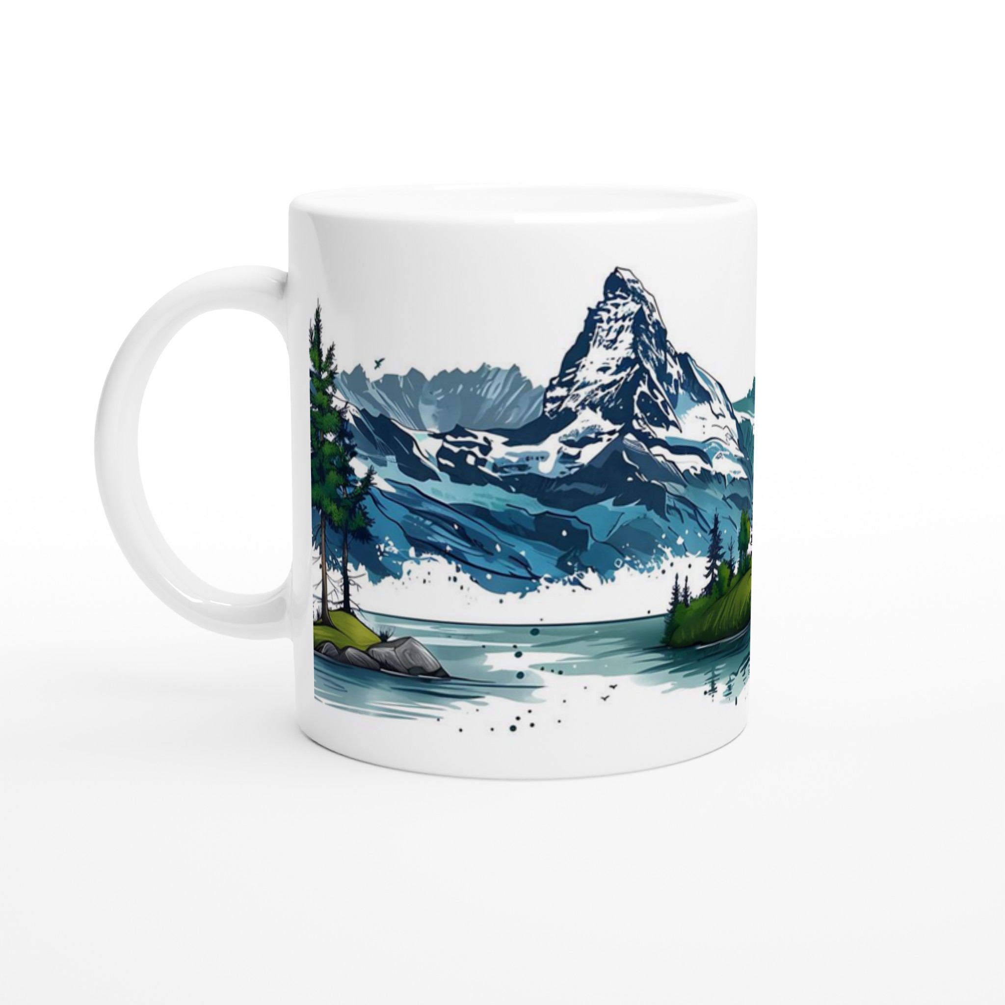 Den blanka vita ytan ger ett skarpt och levande tryck som verkligen sticker ut, oavsett om det är en personlig design, ett roligt citat eller en present till någon du tycker om. Vår exklusiva alpina drömmar-design fångar den lugna skönheten i snötäckta berg och fridfulla sjöar, allt med en modern, skandinavisk twist som ger en känsla av lugn och äventyr till din dag. Varje detalj, från de majestätiska topparna till de spegelblanka vattnen, är framhävd med en konstnärlig palett som balanserar nordisk enkelhet med djup karaktär.