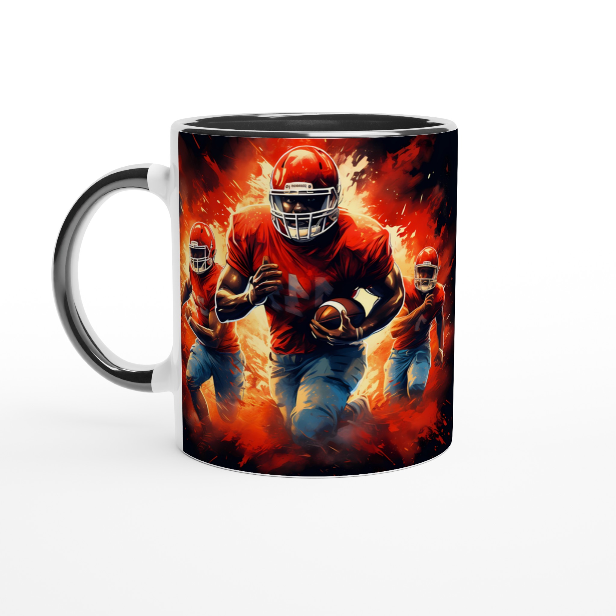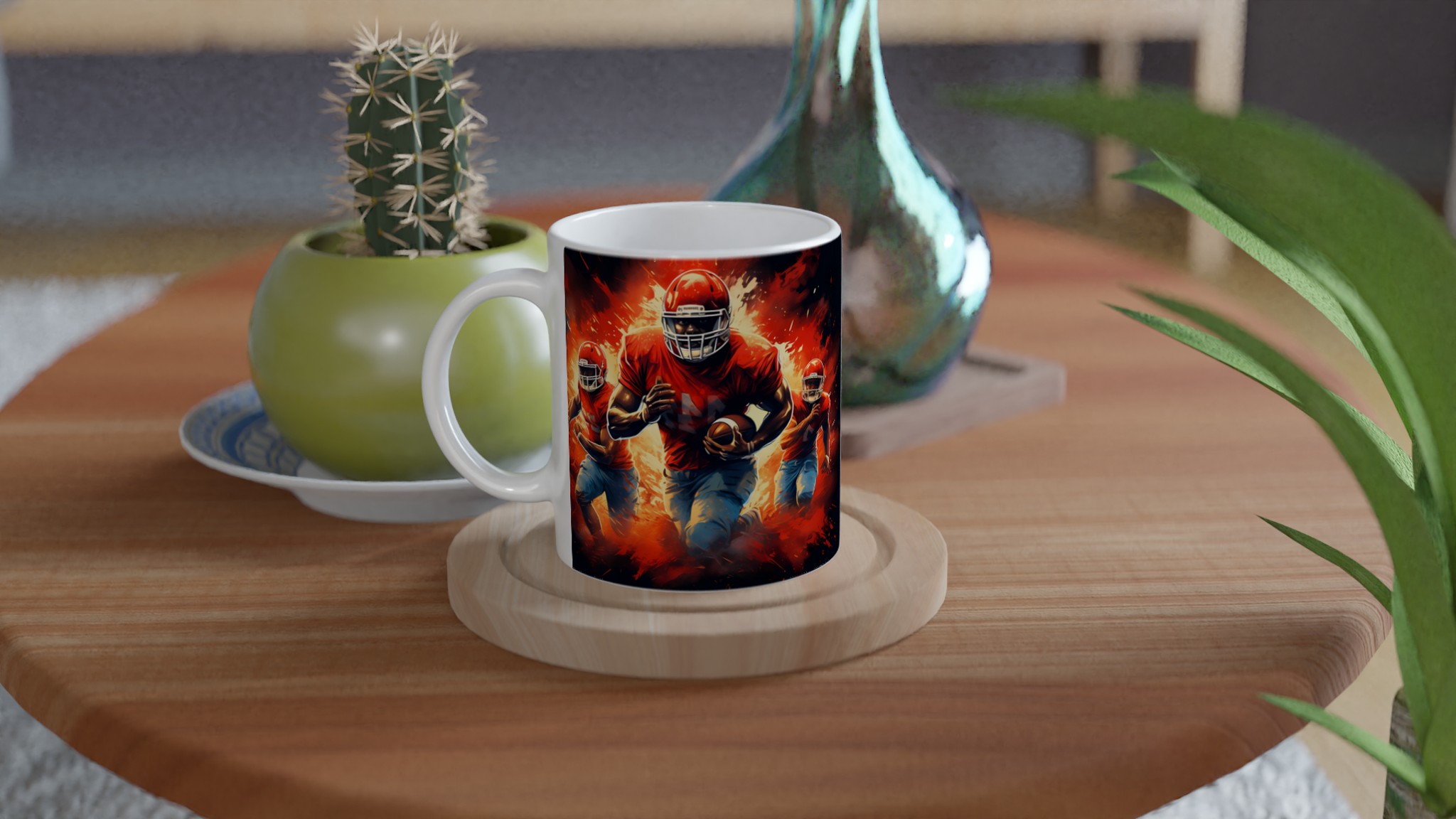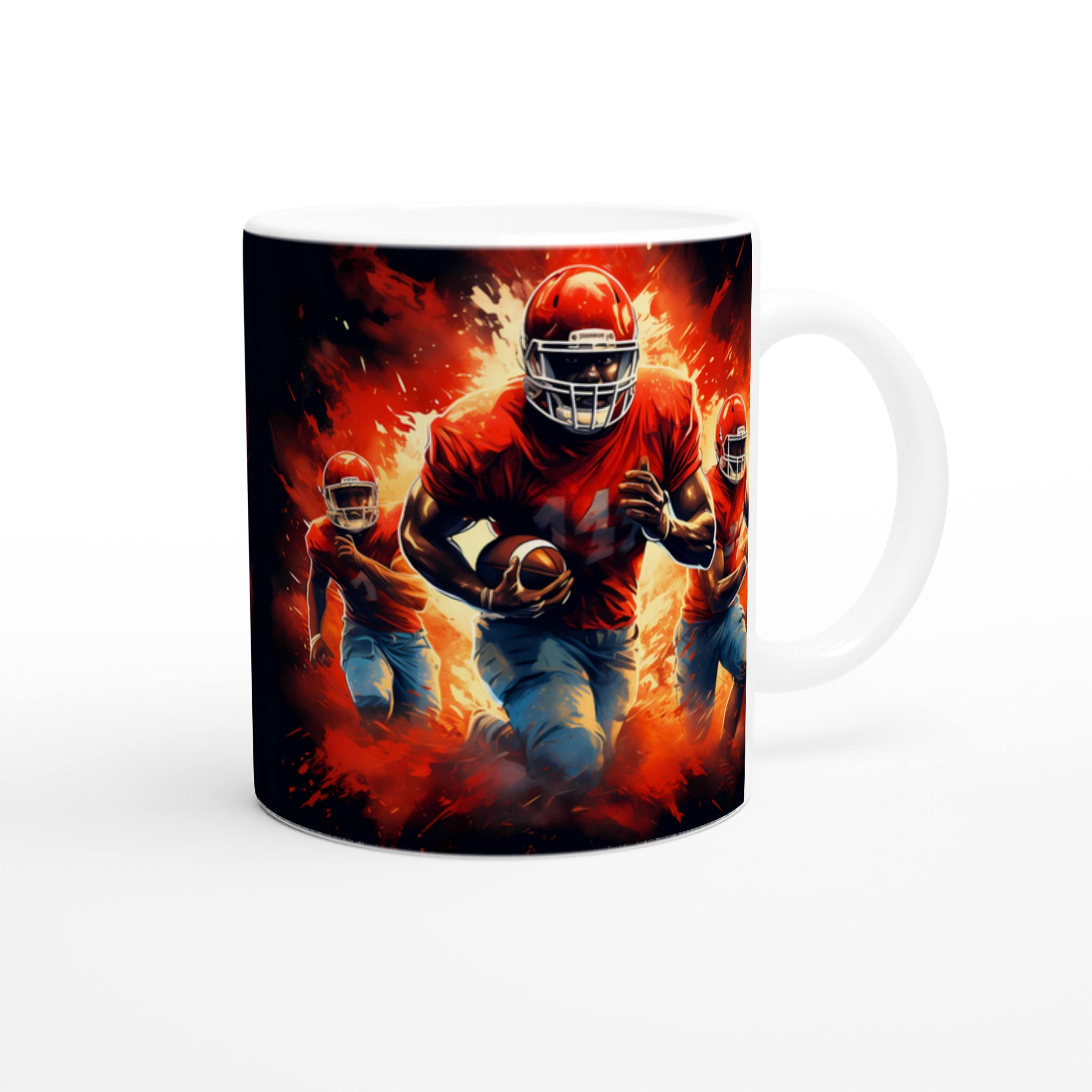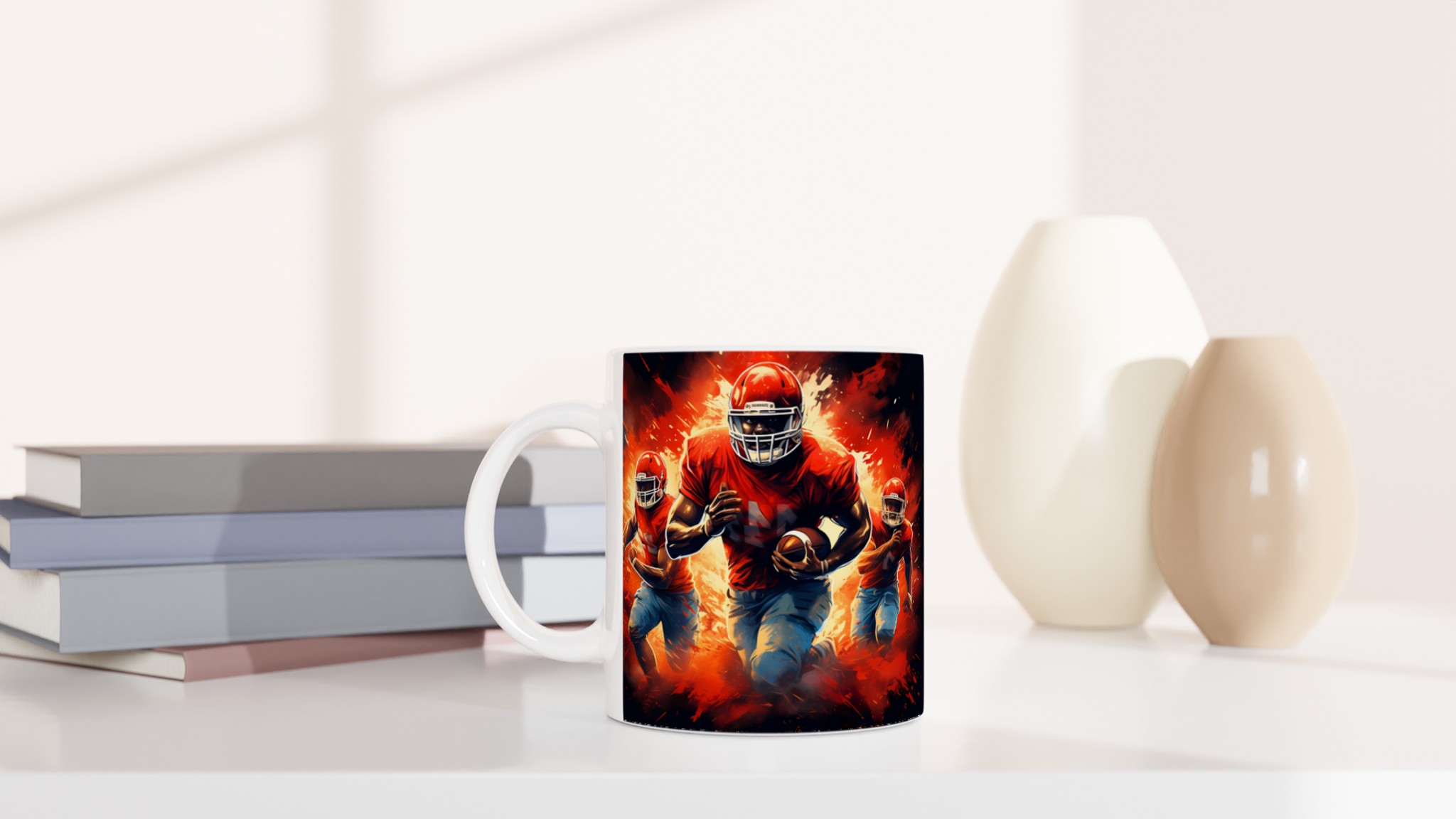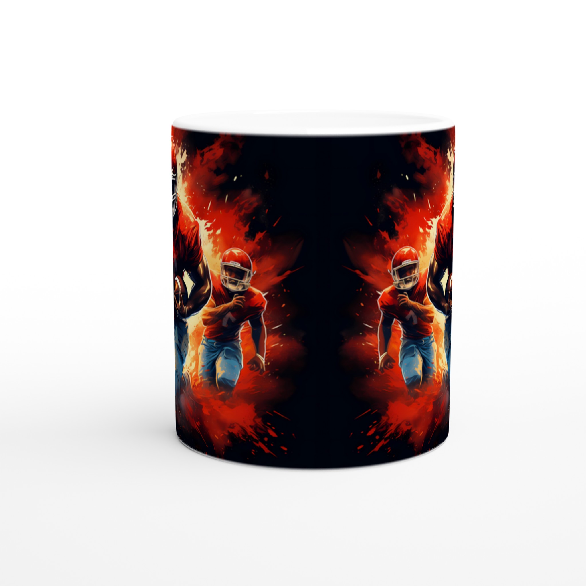 Den här stilrena keramiska muggen blir snabbt en vardagsfavorit. Perfekt för morgonkaffet, kvällens varma choklad eller när du bara vill njuta av en kopp te. Den blanka vita ytan gör att trycken framhävs med klara och levande färger, som håller sig fina även efter många turer i mikron och diskmaskinen. Vår American Football Hero Mugg fångar den råa energin och spänningen från spelet, med dynamiska illustrationer som exploderar i eldiga röda och orangea toner mot en djup, mystisk bakgrund. Perfekt för sportfantasten!