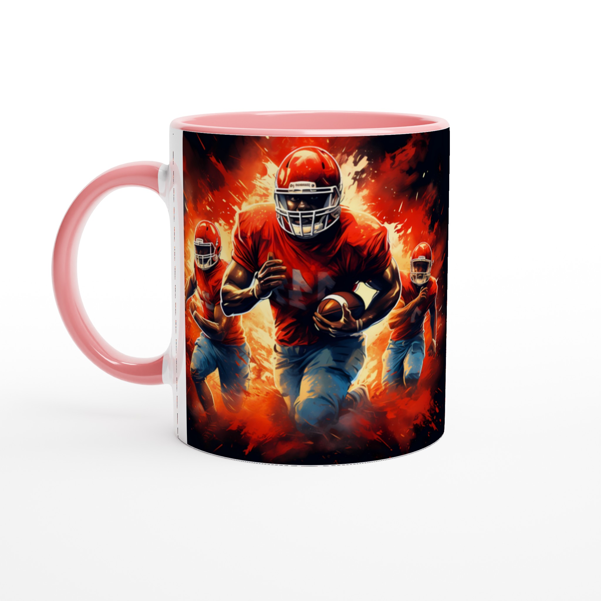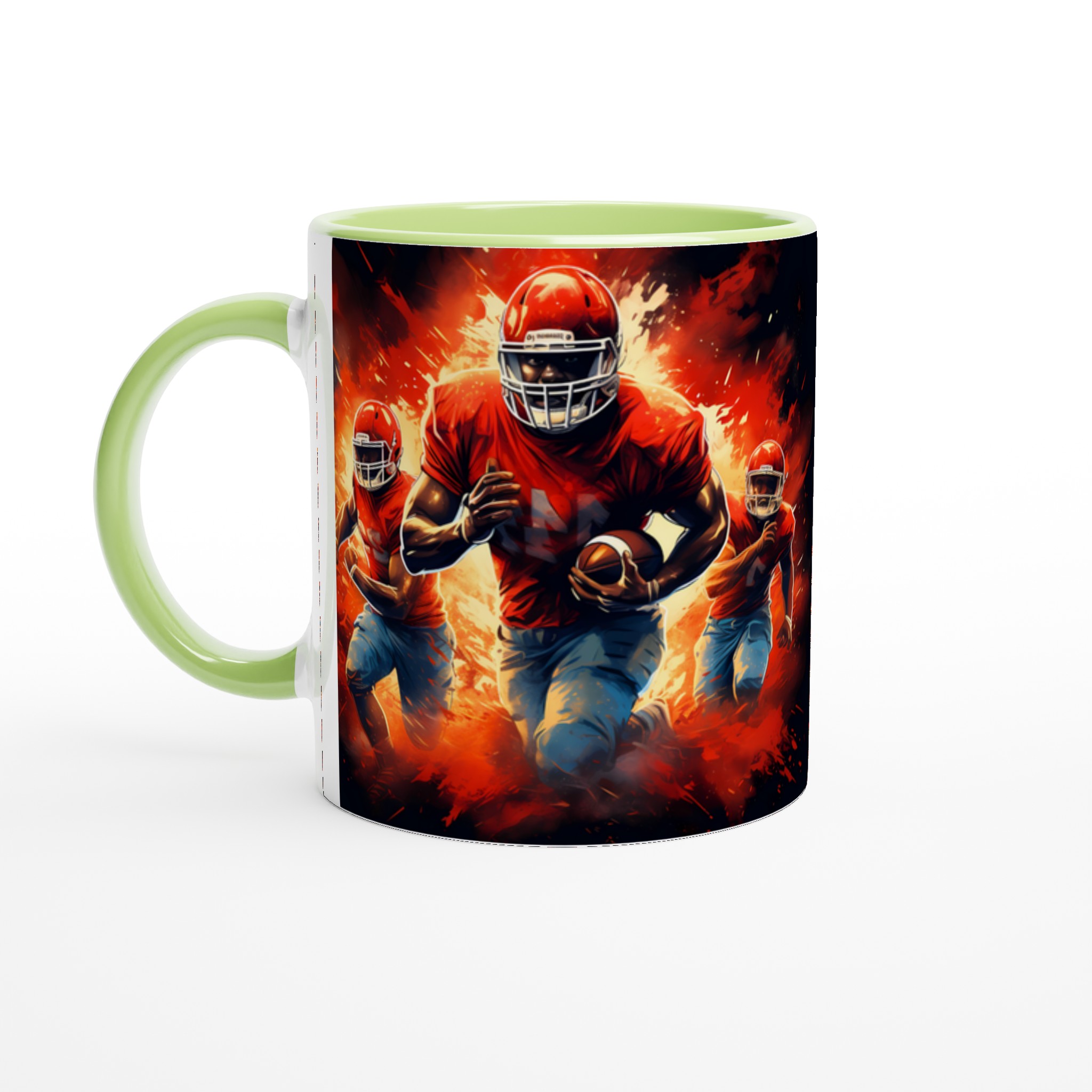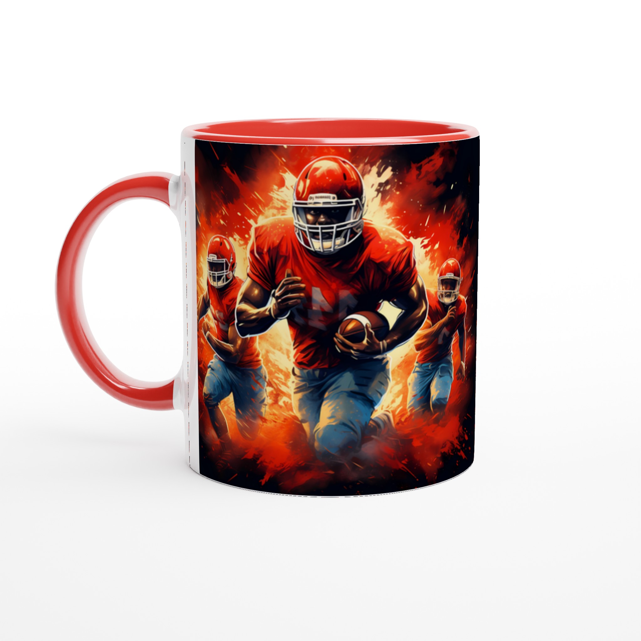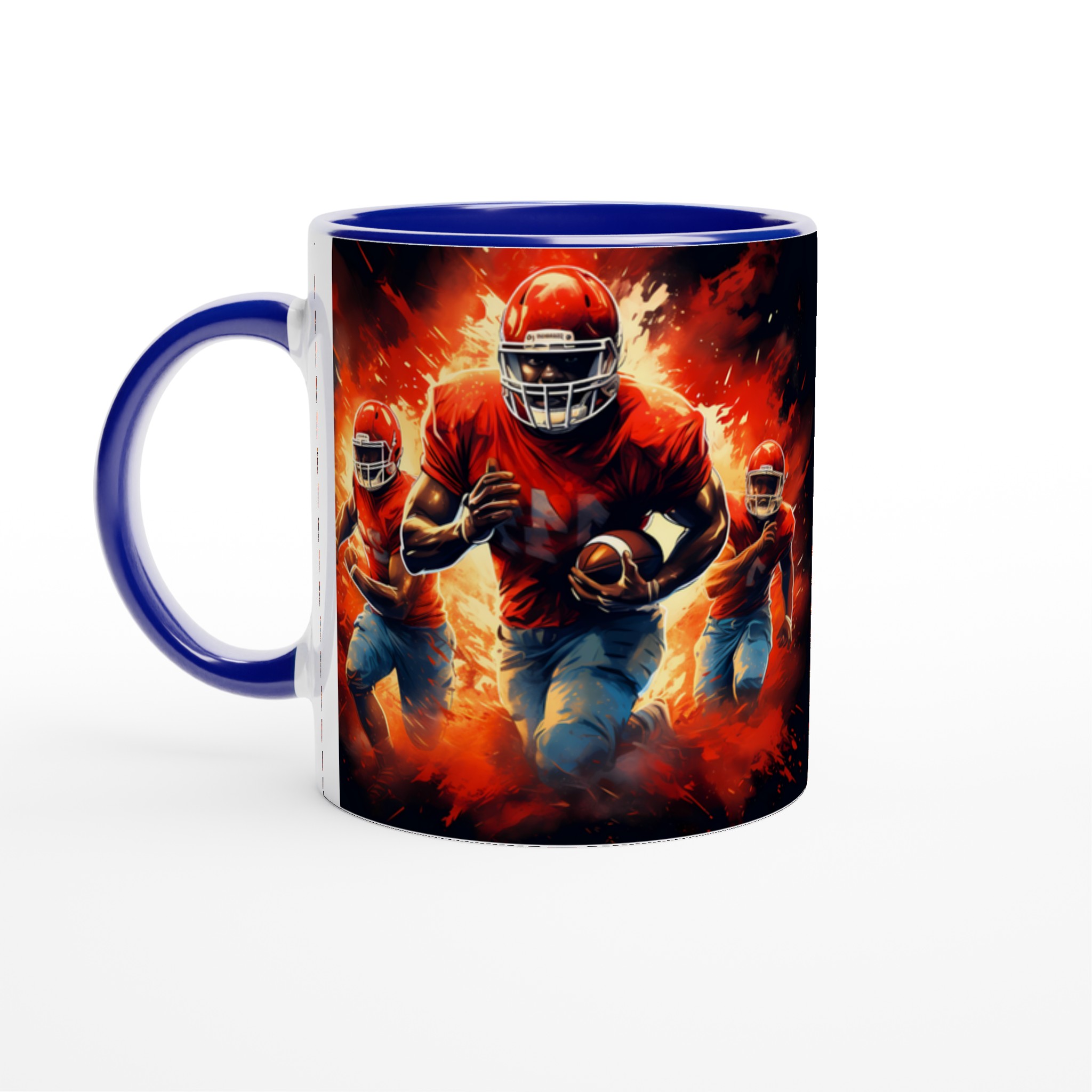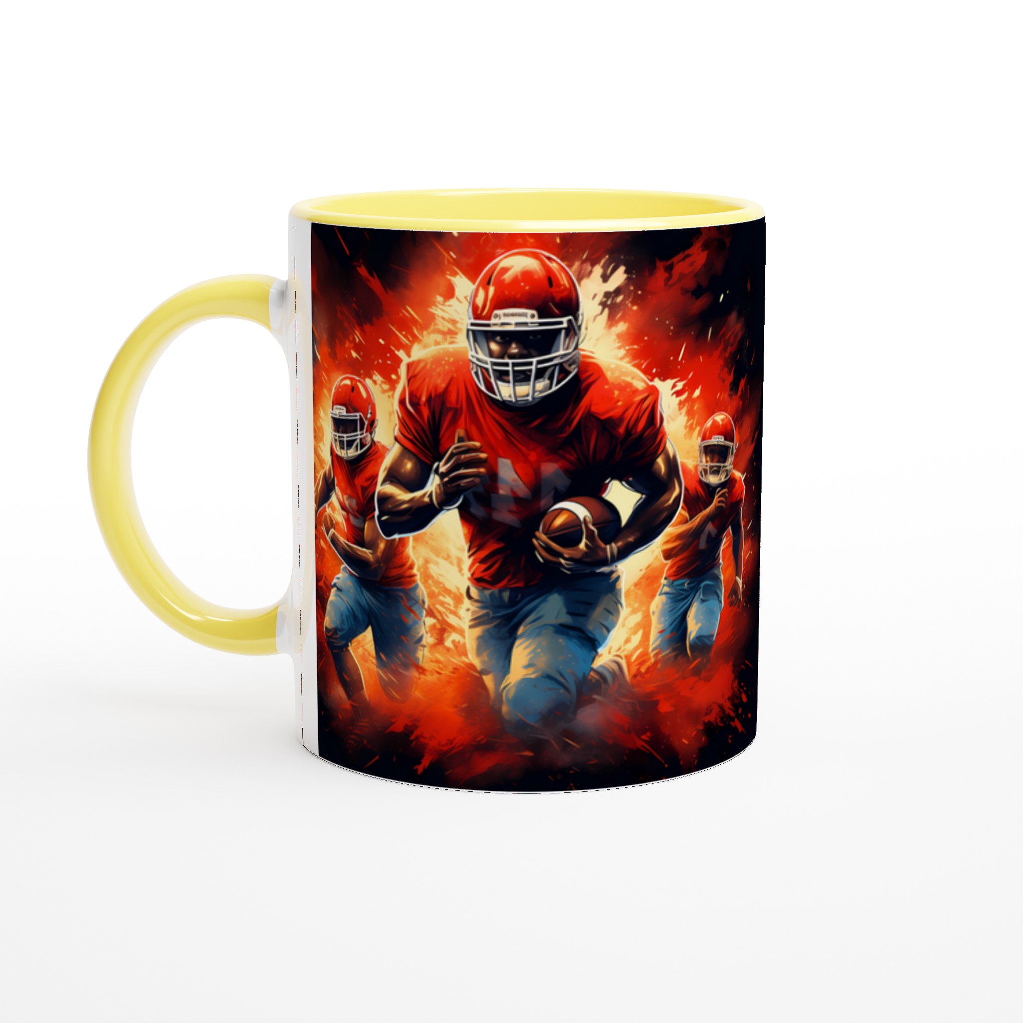 Den här stilrena keramiska muggen blir snabbt en vardagsfavorit. Perfekt för morgonkaffet, kvällens varma choklad eller när du bara vill njuta av en kopp te. Den blanka vita ytan gör att trycken framhävs med klara och levande färger, som håller sig fina även efter många turer i mikron och diskmaskinen. Vår American Football Hero Mugg fångar den råa energin och spänningen från spelet, med dynamiska illustrationer som exploderar i eldiga röda och orangea toner mot en djup, mystisk bakgrund. Perfekt för sportfantasten!