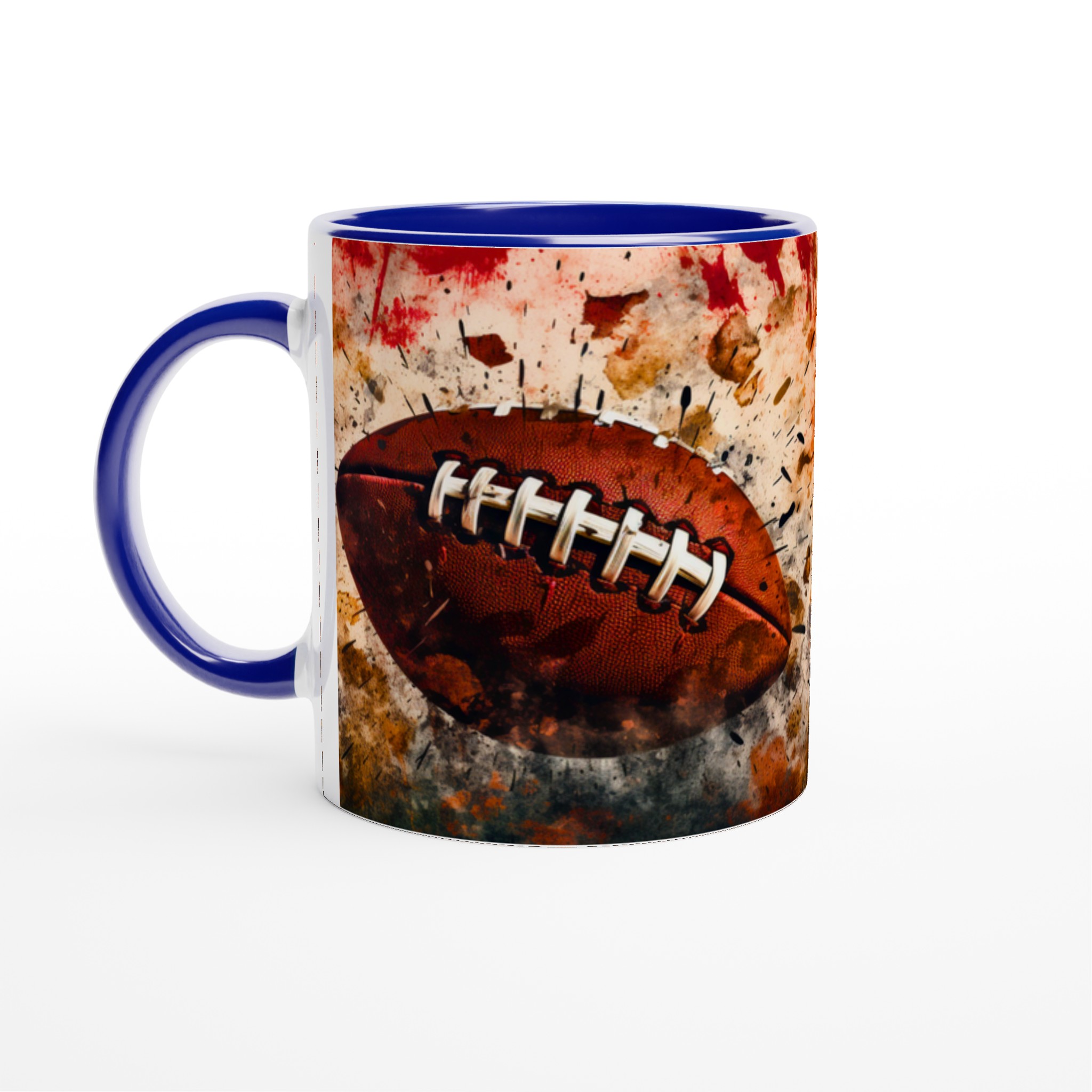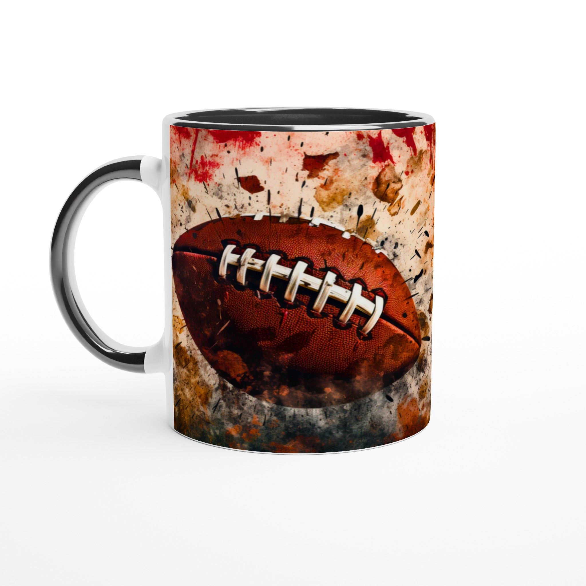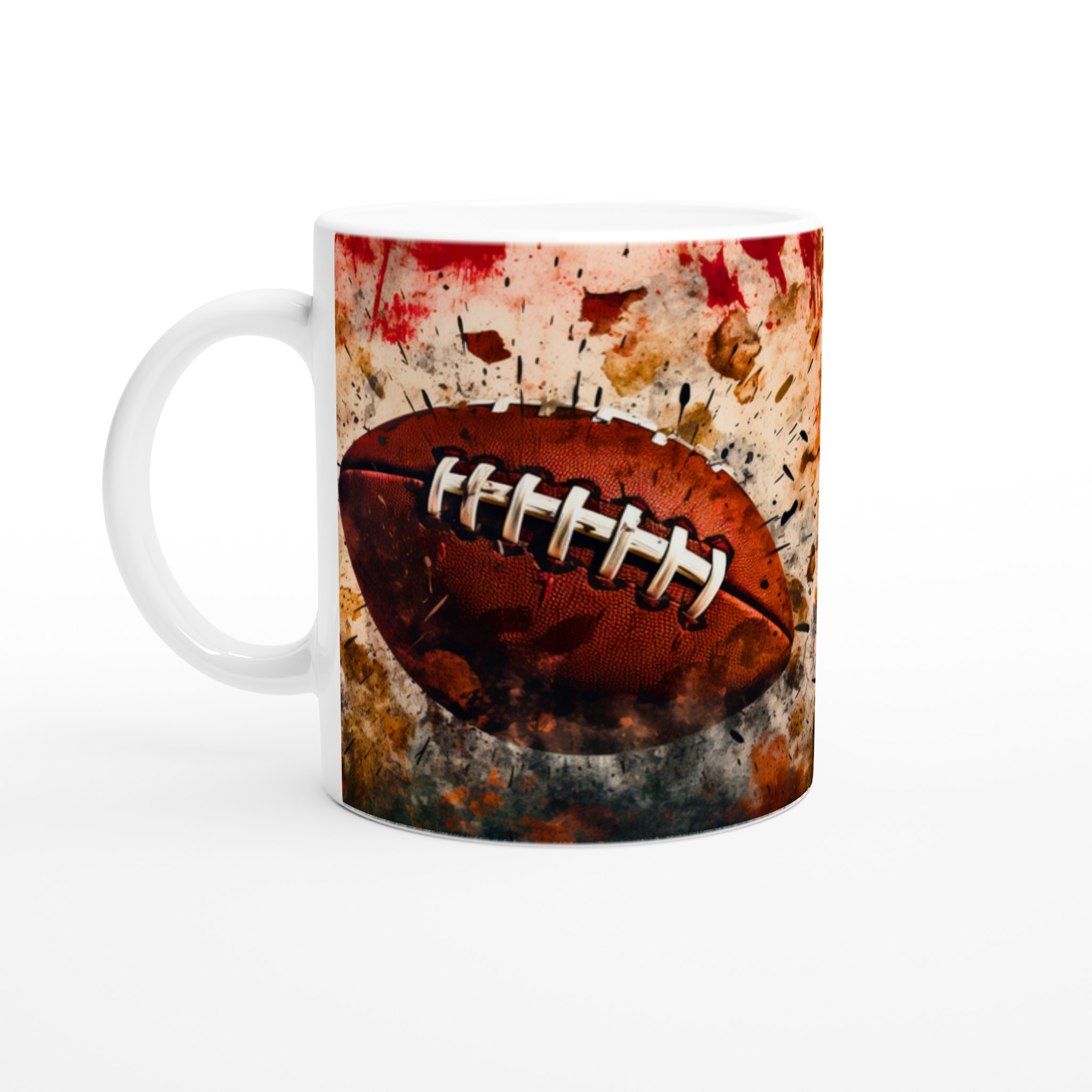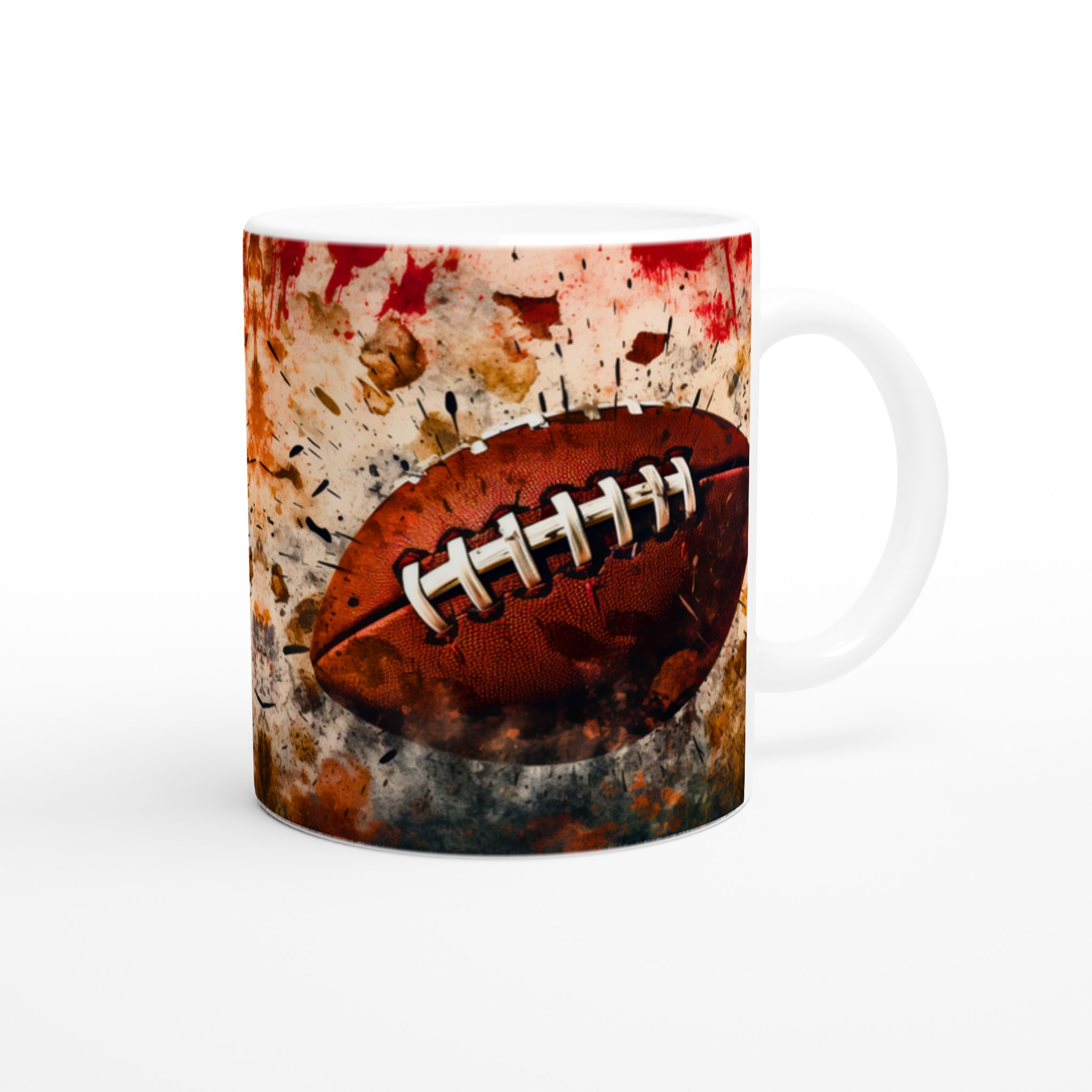 Lyft din matchdagskänsla eller ge din vardagsrutin en energiboost med denna unika keramiska mugg, som fångar spänningen från amerikansk fotboll i en levande, konstnärlig stil. Perfekt för morgonkaffet, kvällens varma choklad eller när du bara vill njuta av en kopp te. Den blanka vita ytan framhäver trycken med klara och levande färger, som håller sig fina även efter många turer i mikron och diskmaskinen, vilket garanterar att den dynamiska designen med fotbollen och dess bakgrund av färgstänk och action bibehålls över tid.