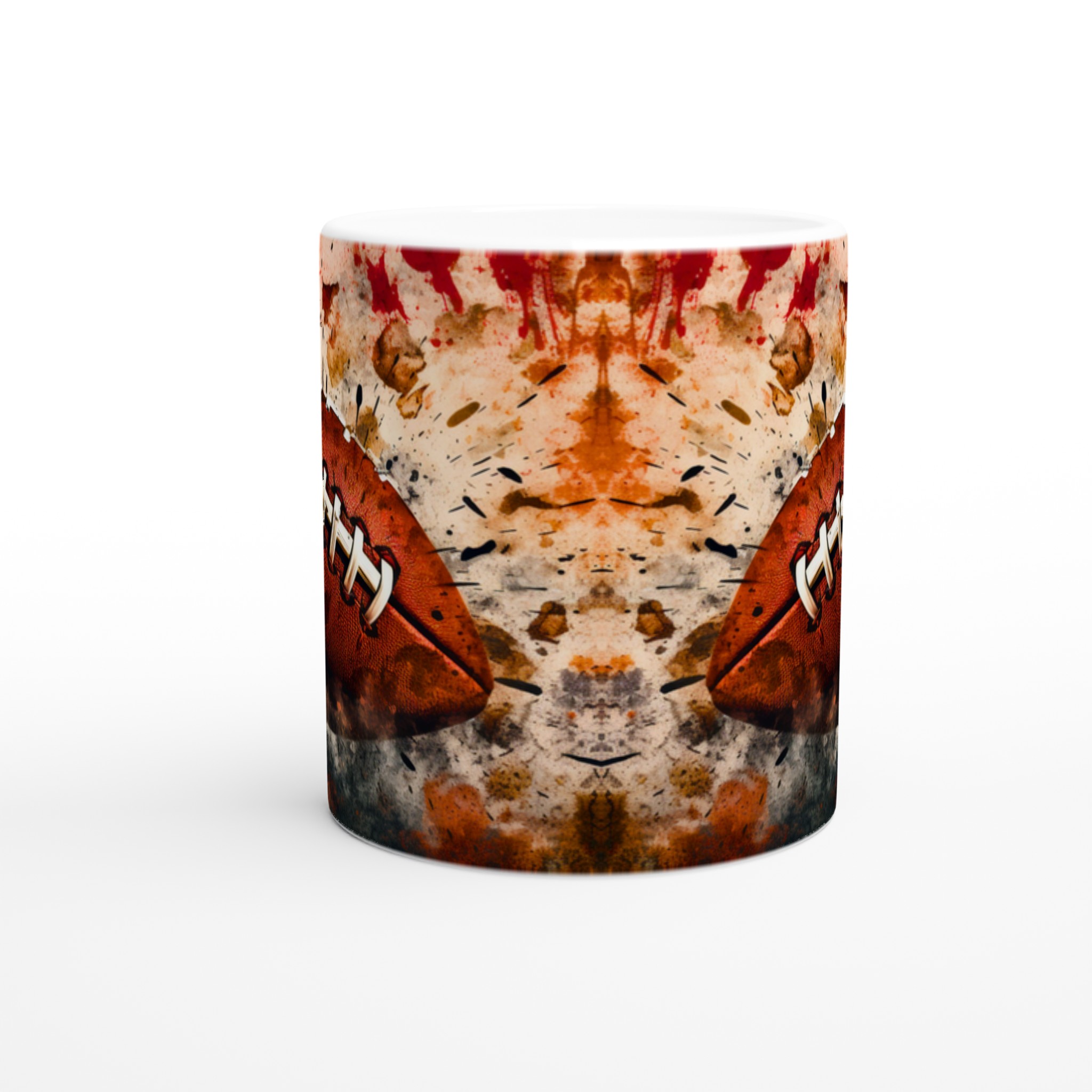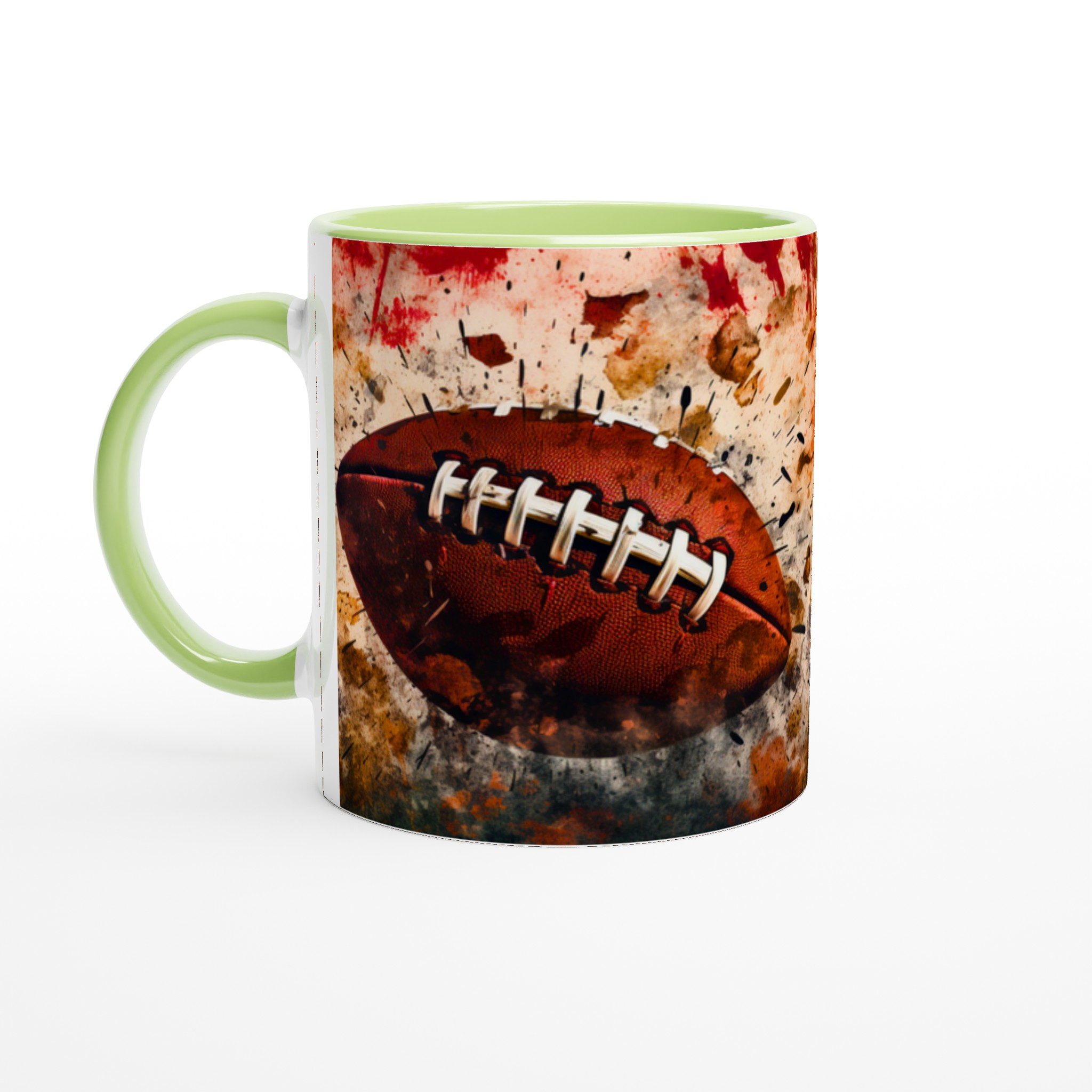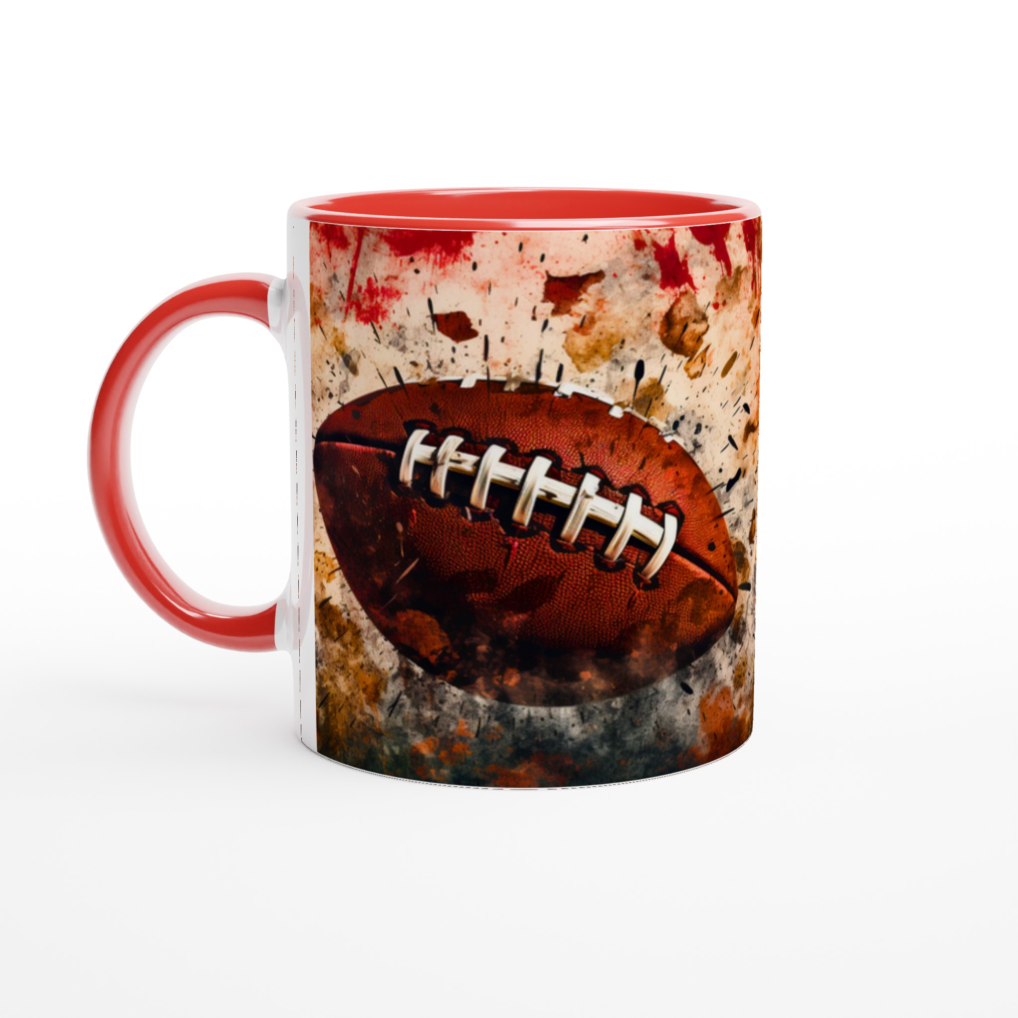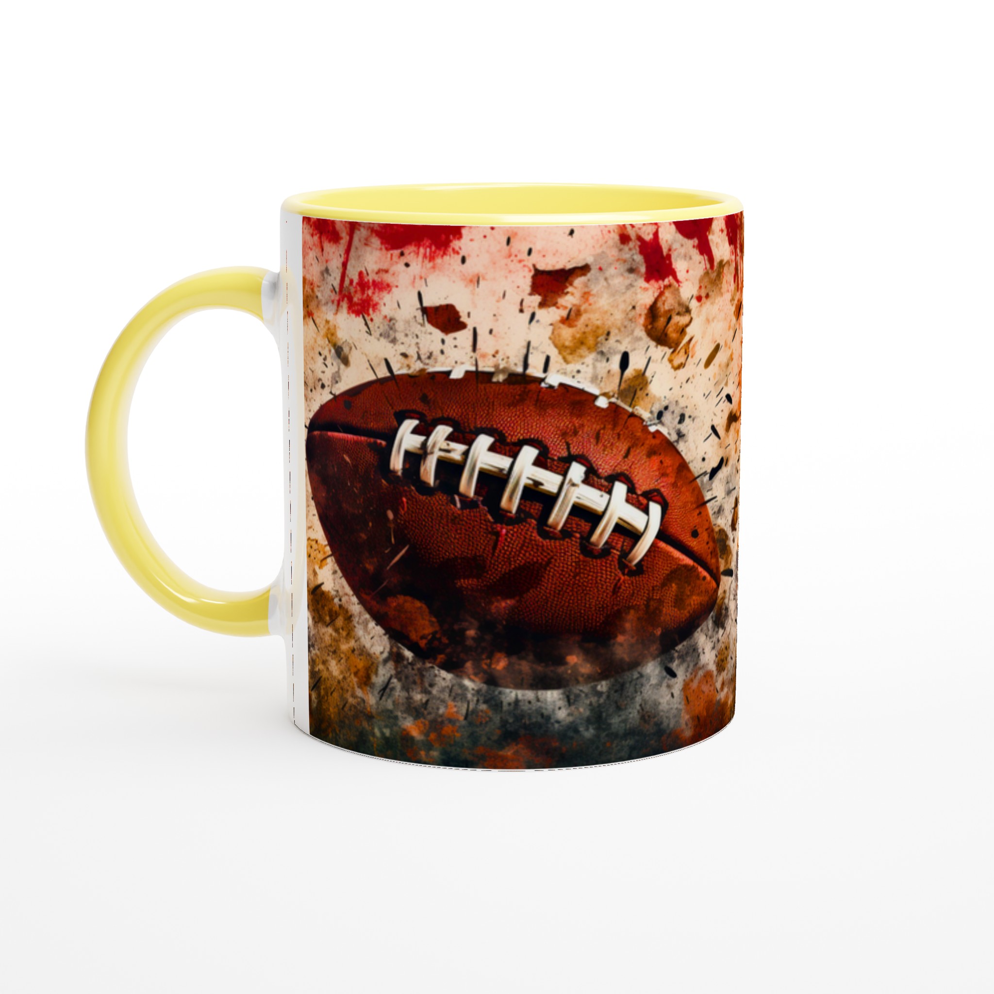 Lyft din matchdagskänsla eller ge din vardagsrutin en energiboost med denna unika keramiska mugg, som fångar spänningen från amerikansk fotboll i en levande, konstnärlig stil. Perfekt för morgonkaffet, kvällens varma choklad eller när du bara vill njuta av en kopp te. Den blanka vita ytan framhäver trycken med klara och levande färger, som håller sig fina även efter många turer i mikron och diskmaskinen, vilket garanterar att den dynamiska designen med fotbollen och dess bakgrund av färgstänk och action bibehålls över tid.