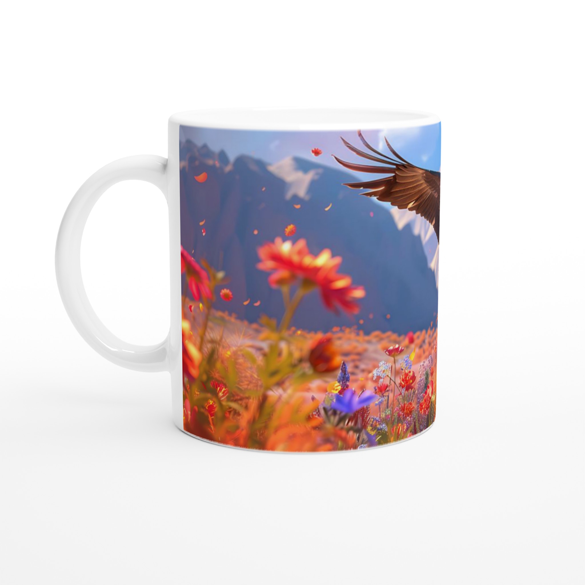 Inspirerad av den majestätiska Andiska Kondoren som svävar över blomstrande dalar och snötäckta bergstoppar, fångar denna mugg naturens storslagenhet och frihet. Den blanka vita ytan ger ett skarpt och levande tryck som verkligen sticker ut, oavsett om det är en personlig design, ett roligt citat eller en present till någon du tycker om.