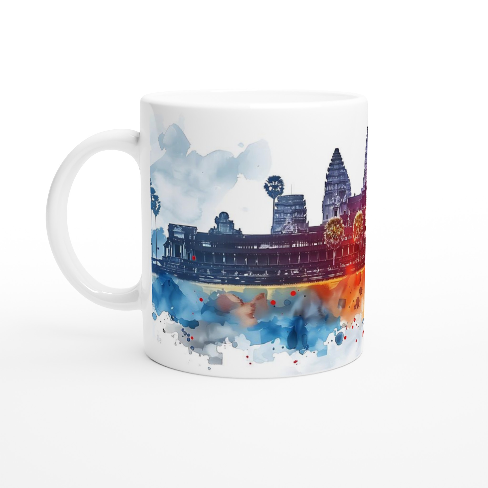 Dröm dig bort till de majestätiska templen i Angkor Wat med varje klunk från denna unika akvarellmugg. Med en färgpalett som sträcker sig från svala blå toner till glödande orange solnedgångsnyanser, fångar denna mugg den mystiska skönheten och den eteriska känslan av det antika underverket. Det konstnärliga trycket, inspirerat av akvarellmålningens mjuka övergångar och stänk, förvandlar din fika till en liten flykt till en exotisk destination.