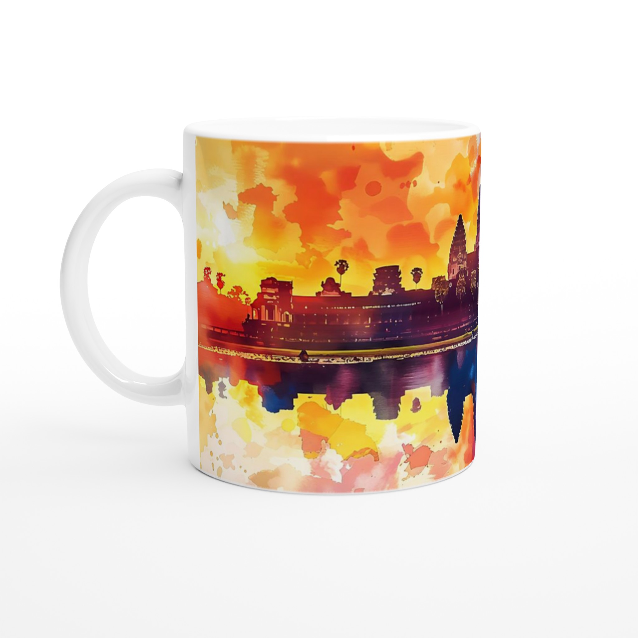 Inspirerad av Angkor Wats majestätiska skönhet och den dramatiska färgpaletten från soluppgång och solnedgång, är denna mugg ett konstverk. Den fångar essensen av en akvarellmålning, med varma orangea och gula nyanser som smälter samman med lugnande blått, reflekterandes i vattnet. Den blanka vita ytan ger ett skarpt och levande tryck som verkligen sticker ut, oavsett om det är en personlig design, ett roligt citat eller en present till någon du tycker om.