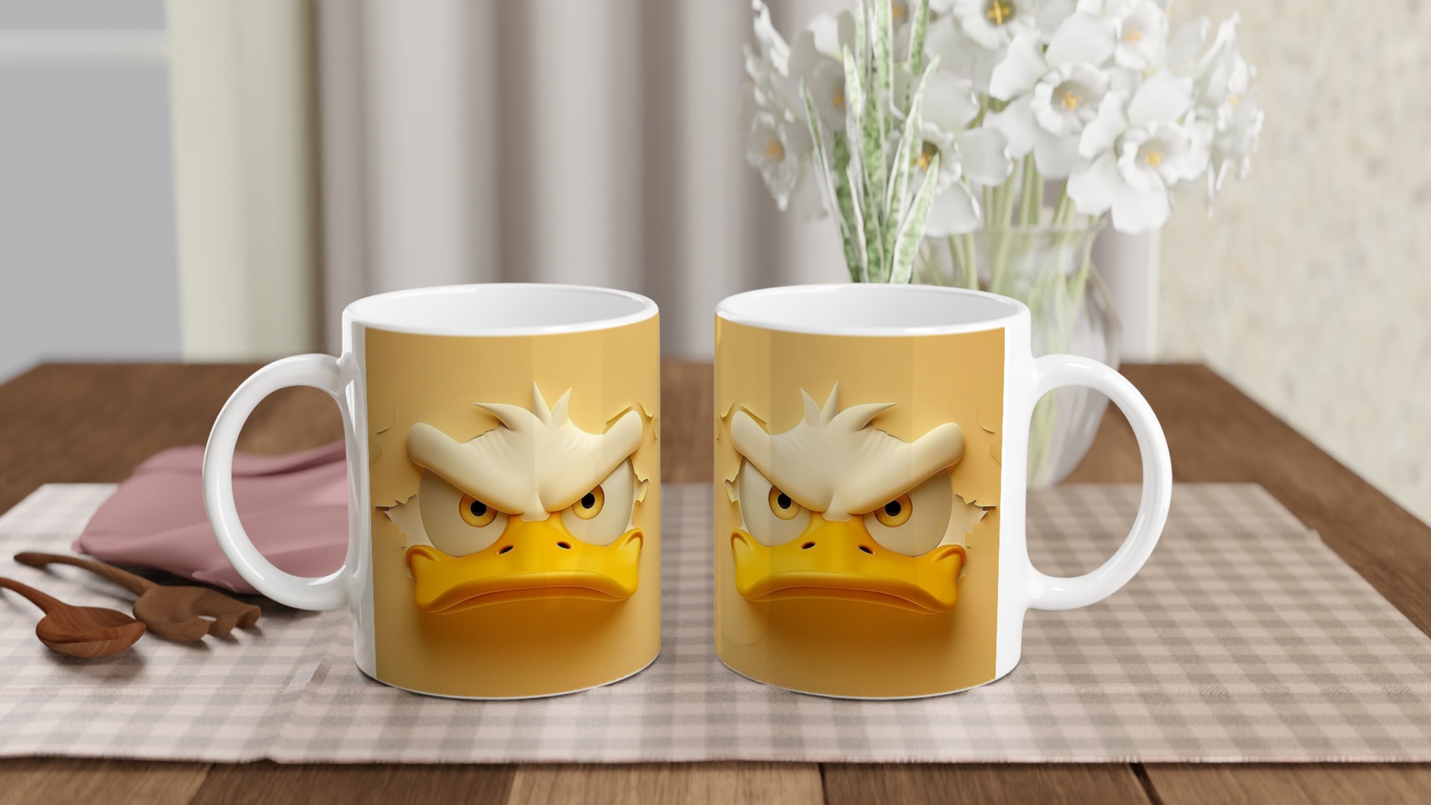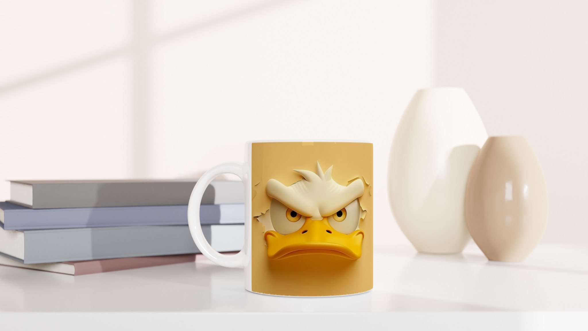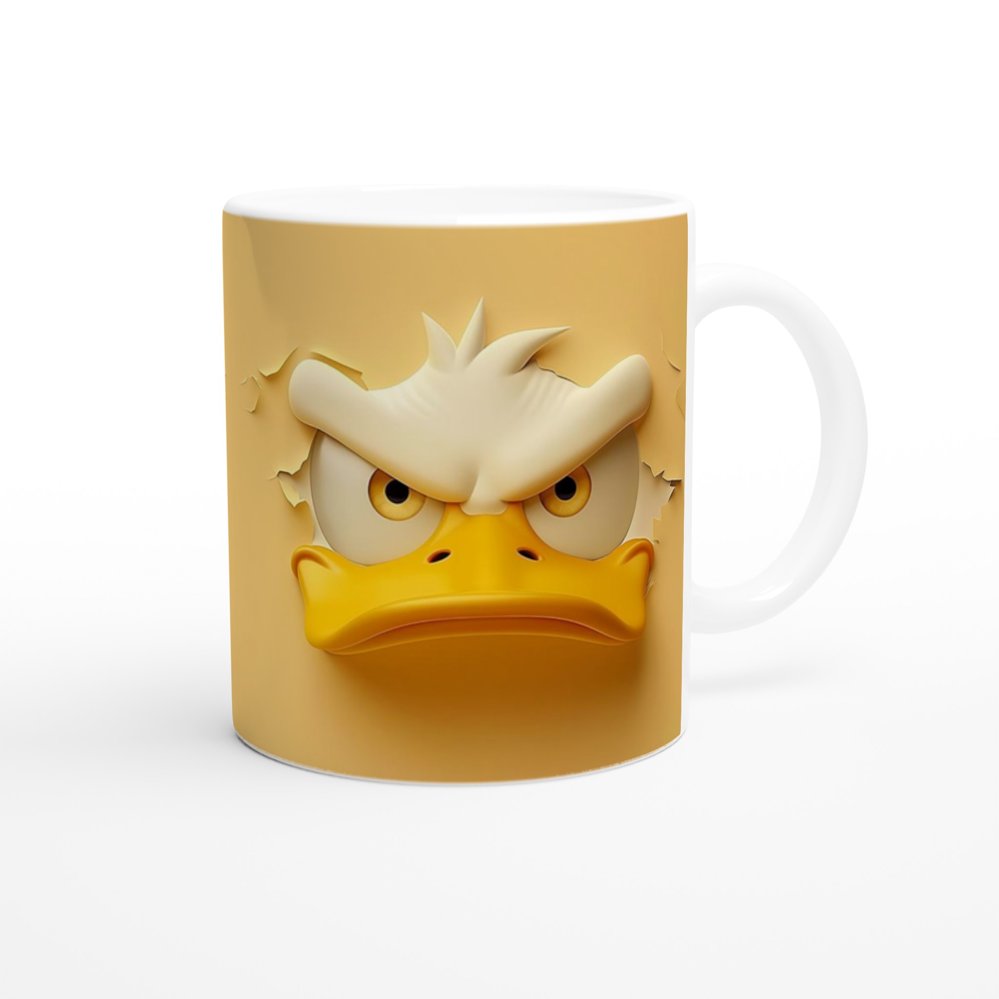 Denna unika mugg har ett iögonfallande 3D-inspirerat motiv av en arg anka, som bryter sig igenom ytan med karaktär och charm. Den blanka vita ytan ger ett skarpt och levande tryck som verkligen sticker ut, oavsett om det är en personlig design, ett roligt citat eller en present till någon du tycker om.