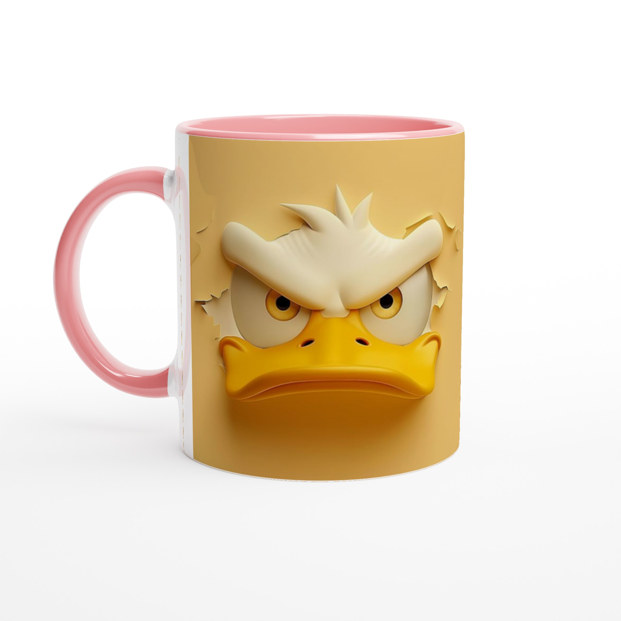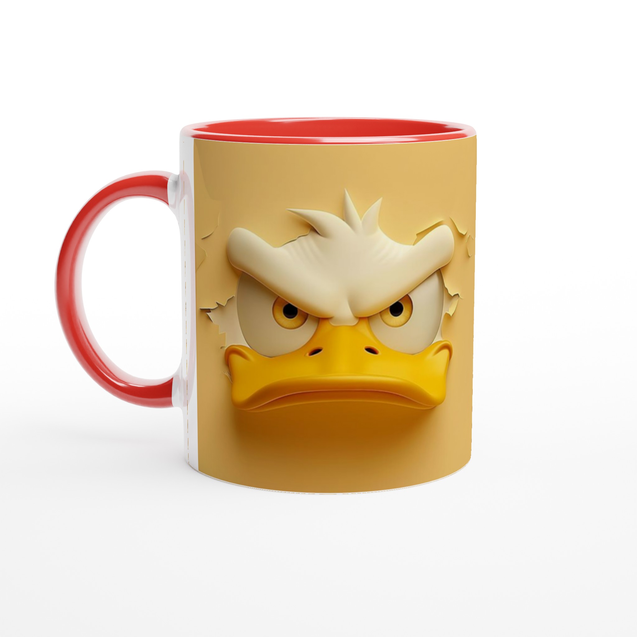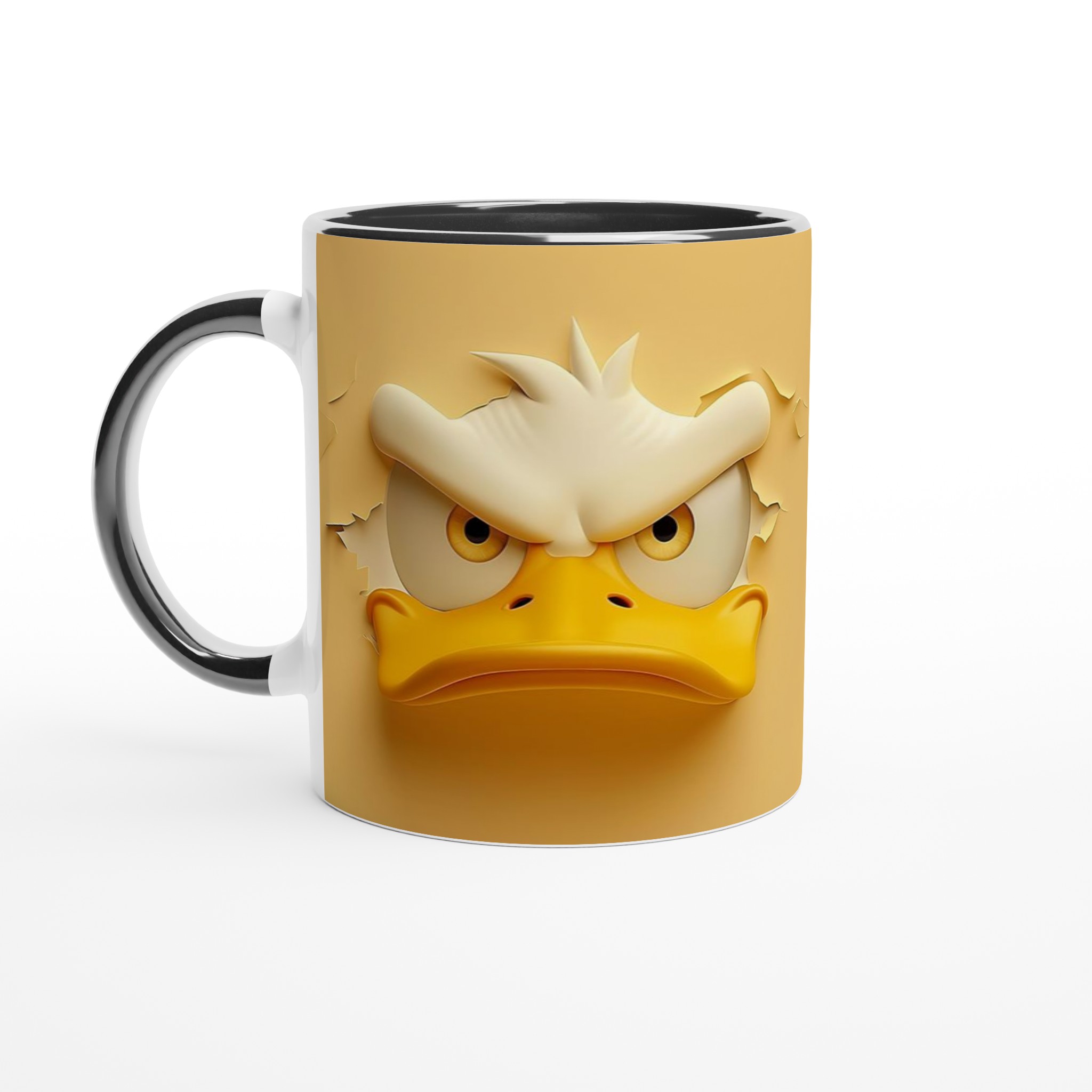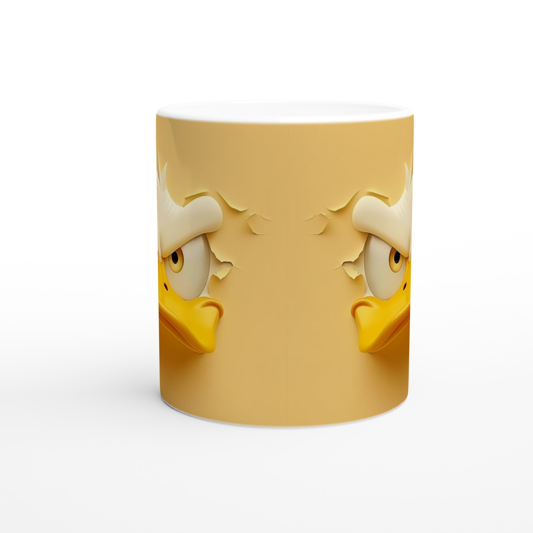 Denna unika mugg har ett iögonfallande 3D-inspirerat motiv av en arg anka, som bryter sig igenom ytan med karaktär och charm. Den blanka vita ytan ger ett skarpt och levande tryck som verkligen sticker ut, oavsett om det är en personlig design, ett roligt citat eller en present till någon du tycker om.