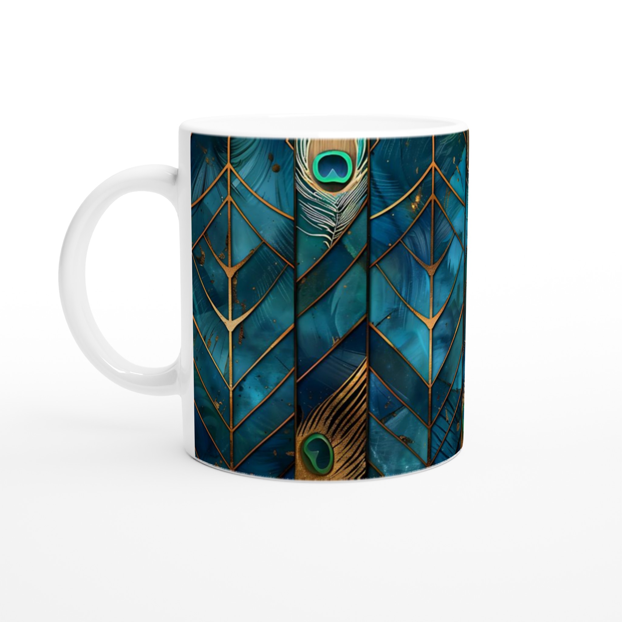 Inspirerad av Art Deco-eran och påfågelns majestätiska skönhet, denna mugg förvandlar din dryckesupplevelse till en stund av lyx. De djupa turkosa och tealblå tonerna, accentuerade med skimrande guldlinjer och inslag av påfågelfjädrar, ger ett skarpt och levande tryck som verkligen sticker ut. Oavsett om det är en personlig design, ett roligt citat eller en present till någon du tycker om, kommer detta eleganta motiv att fängsla.