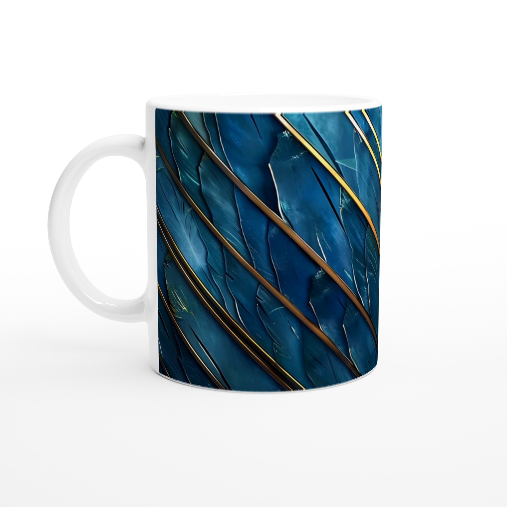Inspirerad av Art Deco-eran, med en design som påminner om eleganta vingmönster i djupa midnattsblå nyanser och glänsande guldaccenter, ger denna mugg en touch av sofistikation till din dag. Den blanka vita ytan ger ett skarpt och levande tryck som verkligen sticker ut, oavsett om det är en personlig design, ett roligt citat eller en present till någon du tycker om.