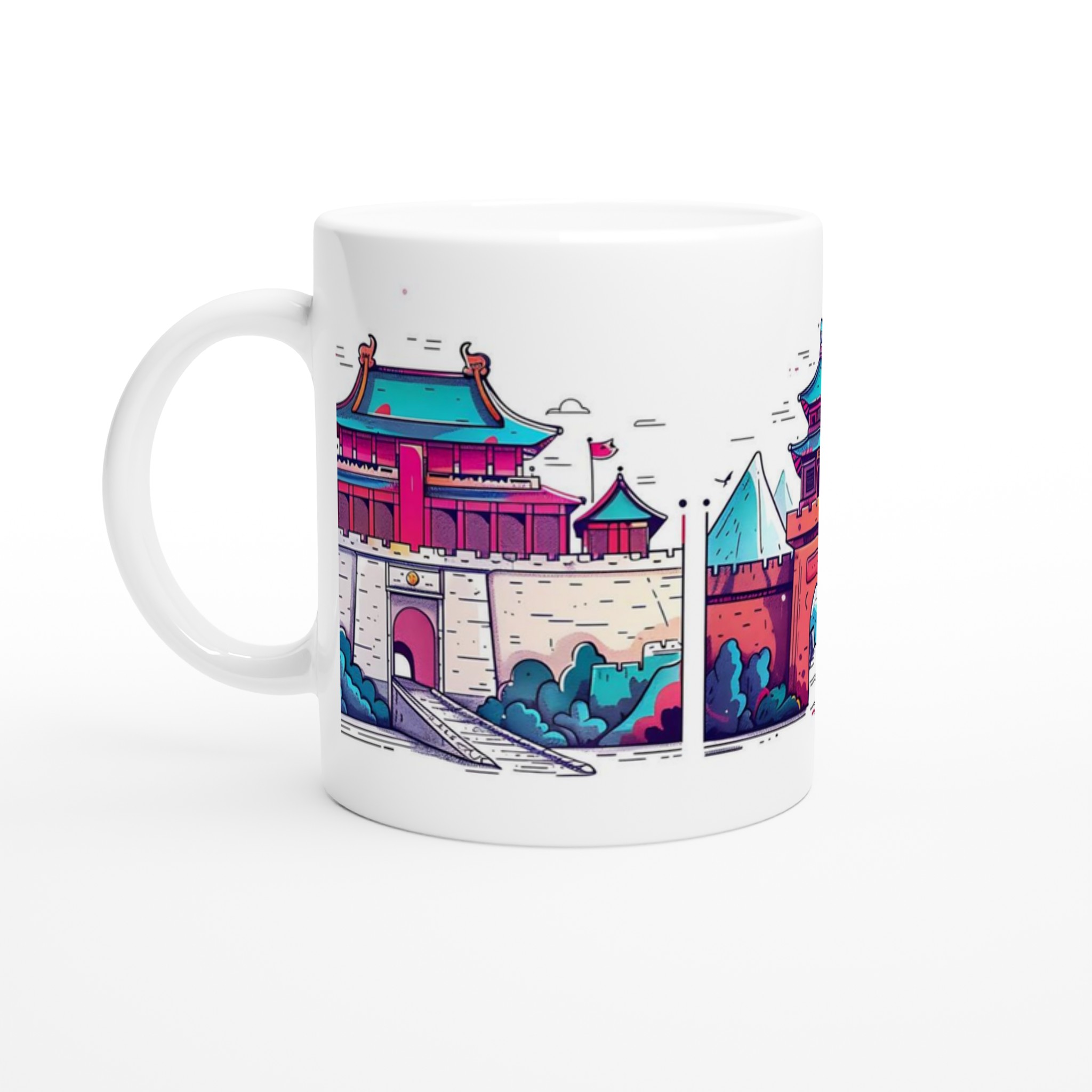 Denna livfulla mugg fångar essensen av asiatisk arkitektur med sina detaljerade kinesiska tempel, pagoder och majestätiska berg, allt illustrerat i en unik och lekfull stil med en rik färgpalett. En sol med ett charmigt leende och flygande fåglar bidrar till en känsla av lugn och äventyr. Varje sip blir en resa till fjärran österns skönhet. Den blanka vita ytan ger ett skarpt och levande tryck som verkligen sticker ut, oavsett om det är en personlig design, ett roligt citat eller en present till någon du tycker om.