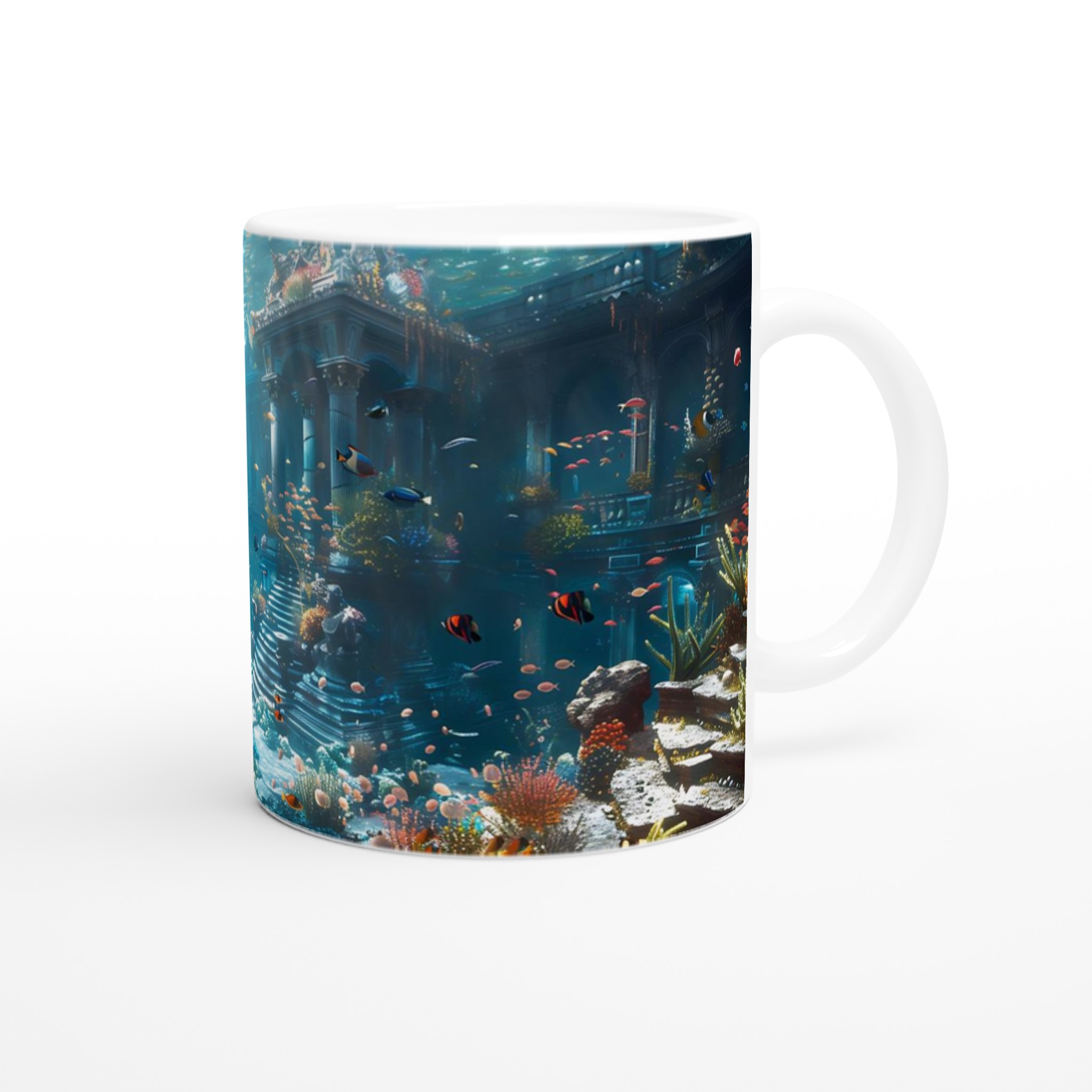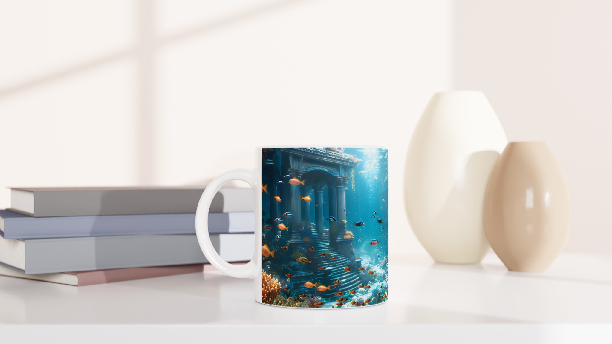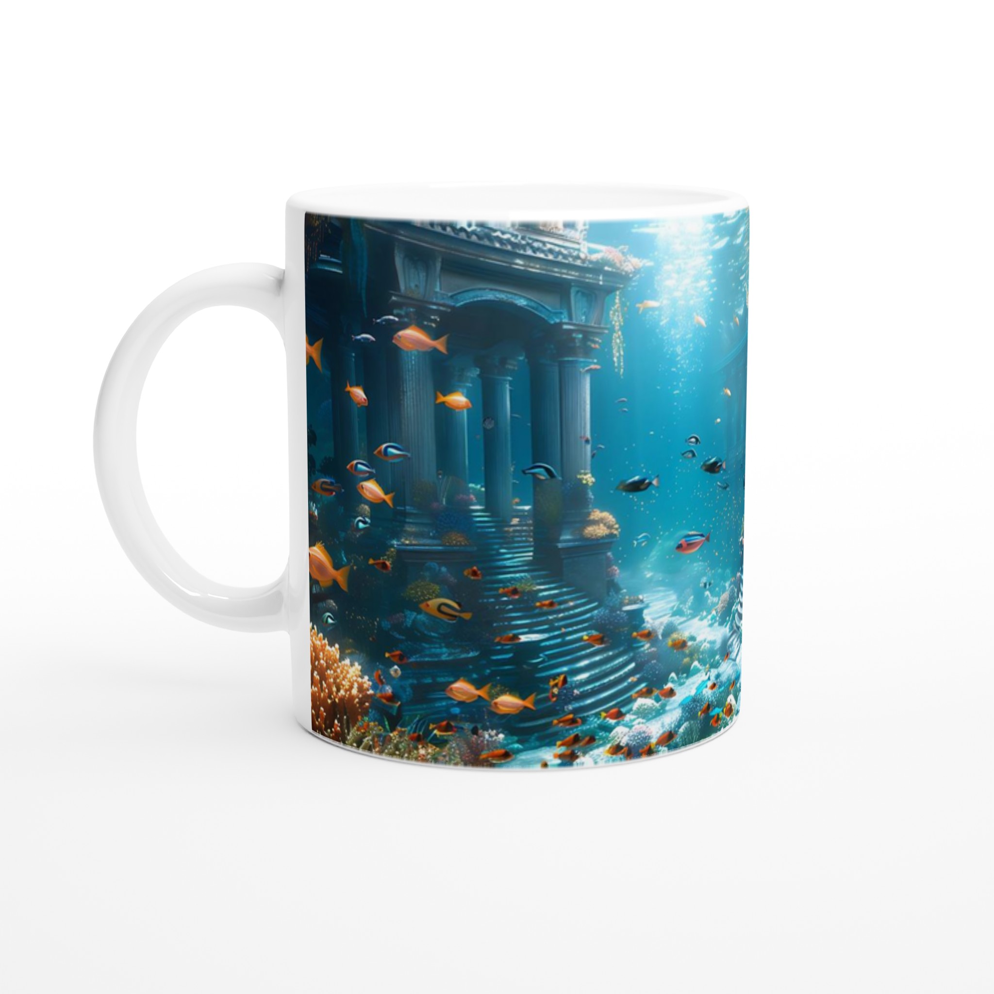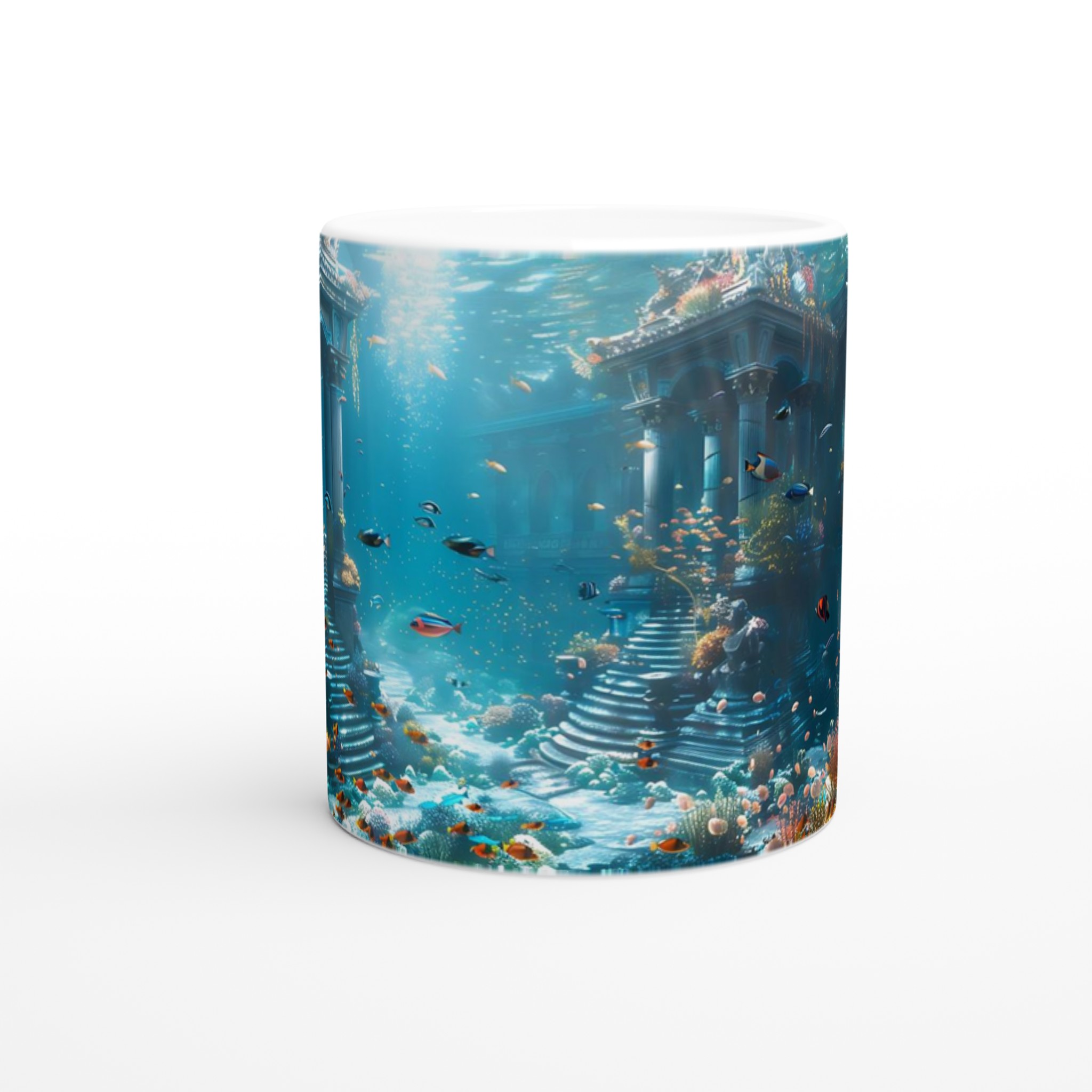 Föreställ dig en värld under ytan, där antika ruiner möter pulserande marint liv. Denna keramikmugg fångar den hisnande skönheten av ett Atlantis korallrev, fyllt med simmande fiskar och solens glittrande strålar som dansar genom vattnet. Det är den perfekta muggen för dig som drömmer om havet och vill addera en touch av magi till din fikastund.