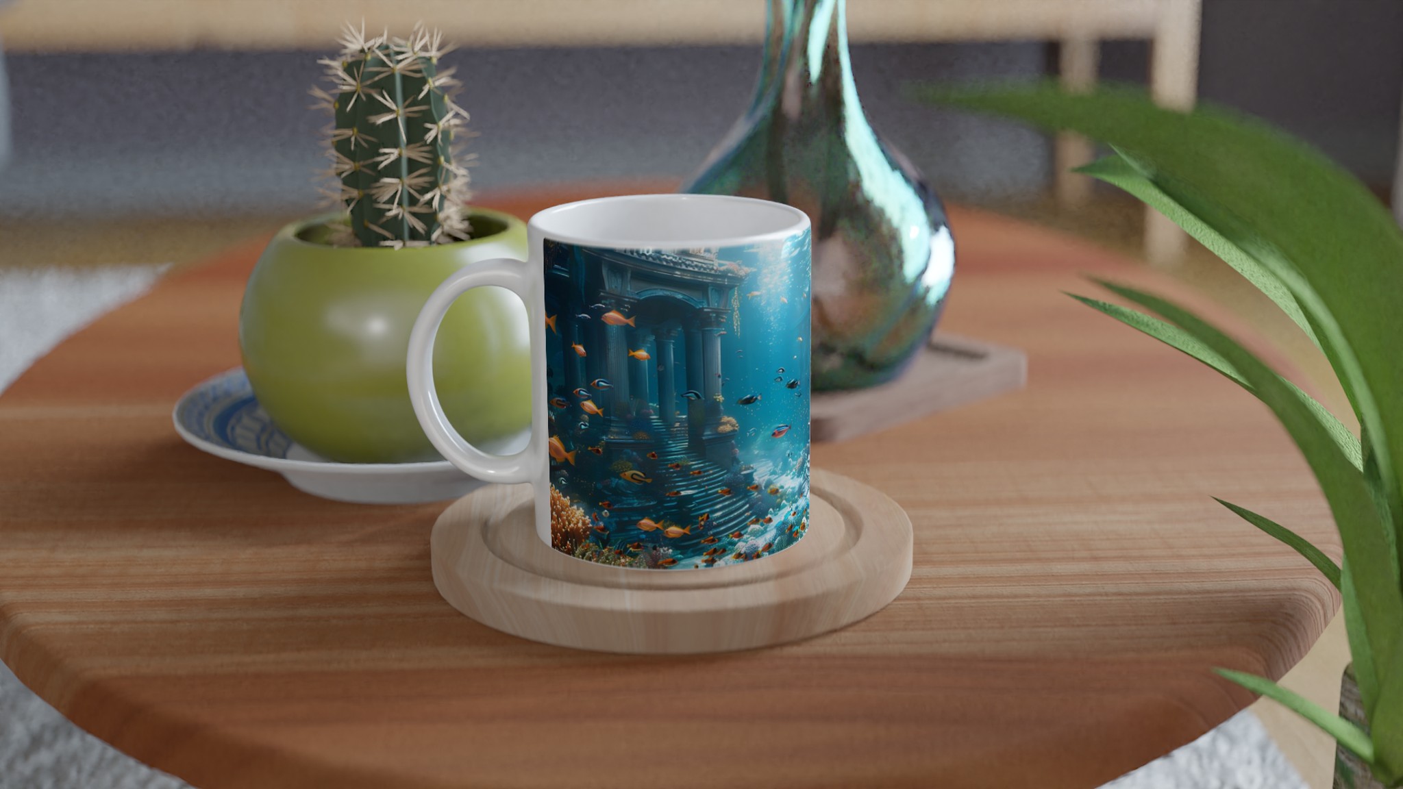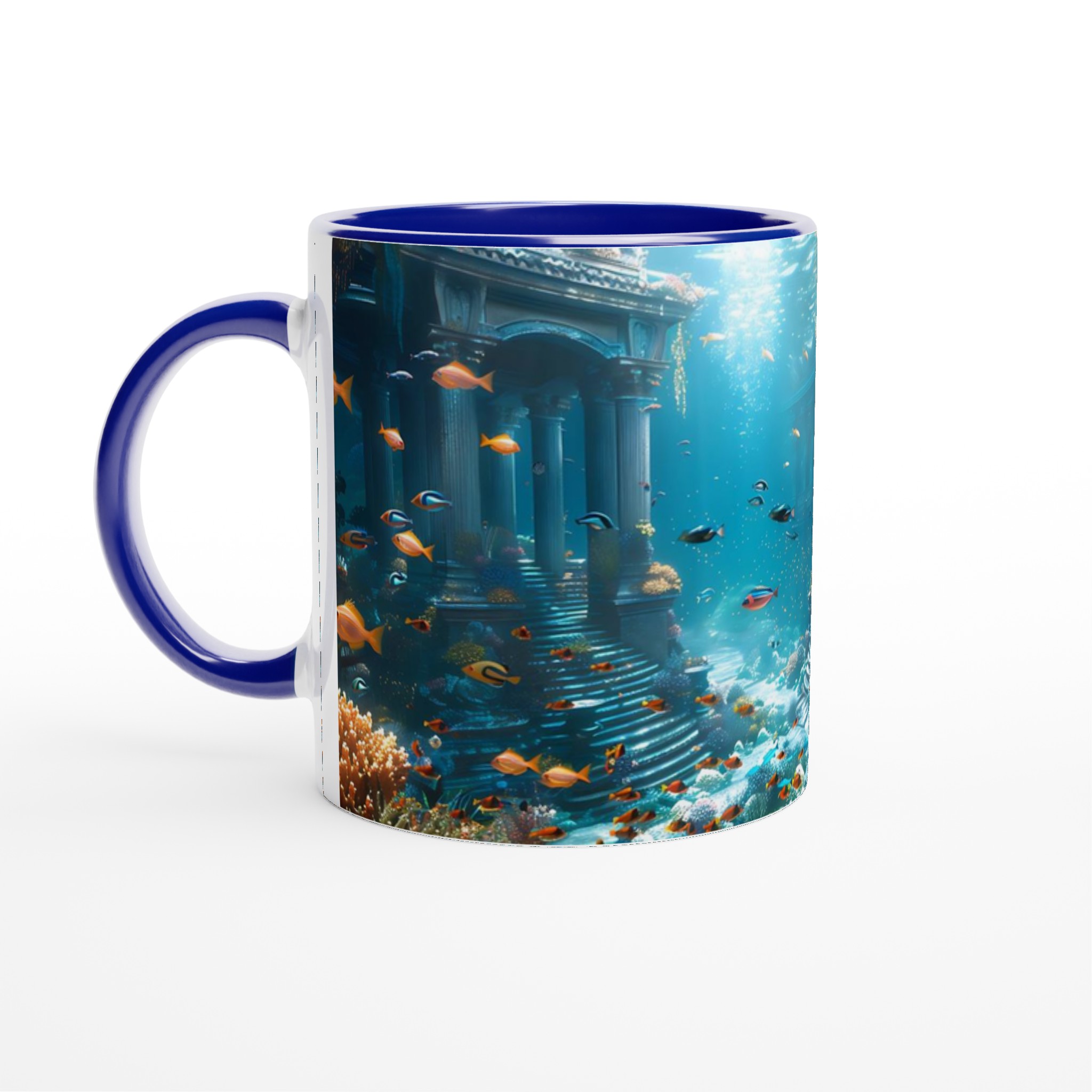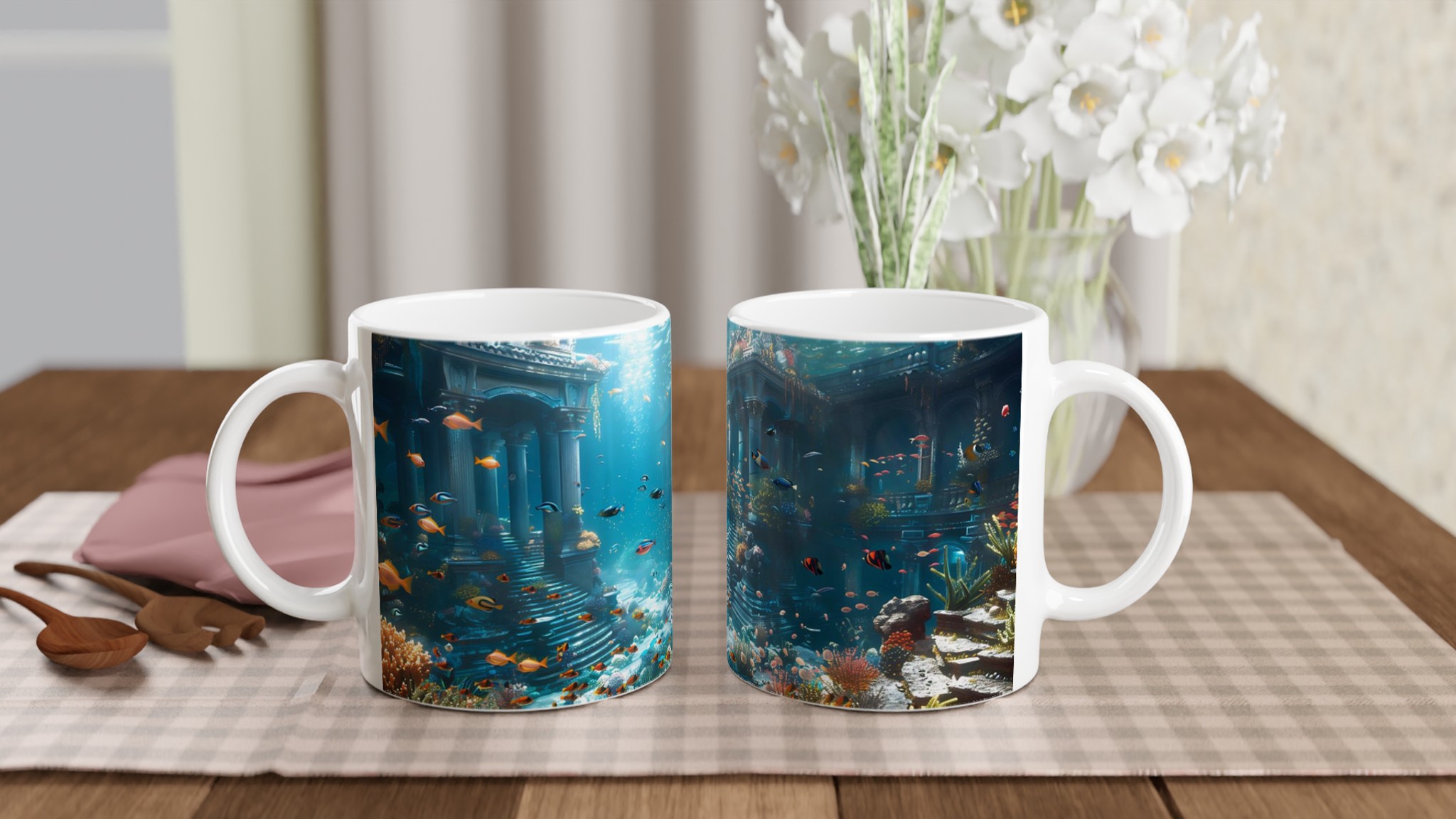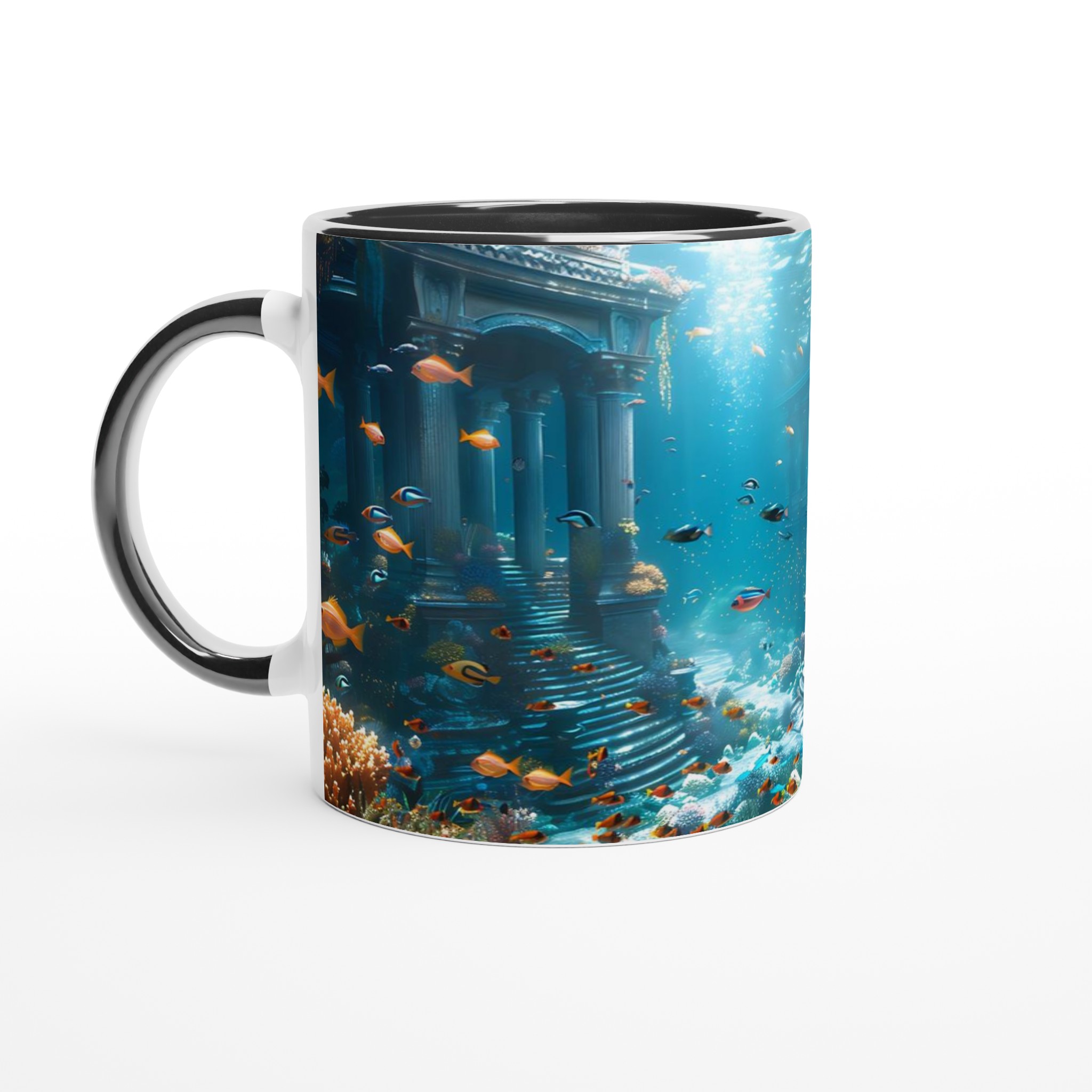 Föreställ dig en värld under ytan, där antika ruiner möter pulserande marint liv. Denna keramikmugg fångar den hisnande skönheten av ett Atlantis korallrev, fyllt med simmande fiskar och solens glittrande strålar som dansar genom vattnet. Det är den perfekta muggen för dig som drömmer om havet och vill addera en touch av magi till din fikastund.