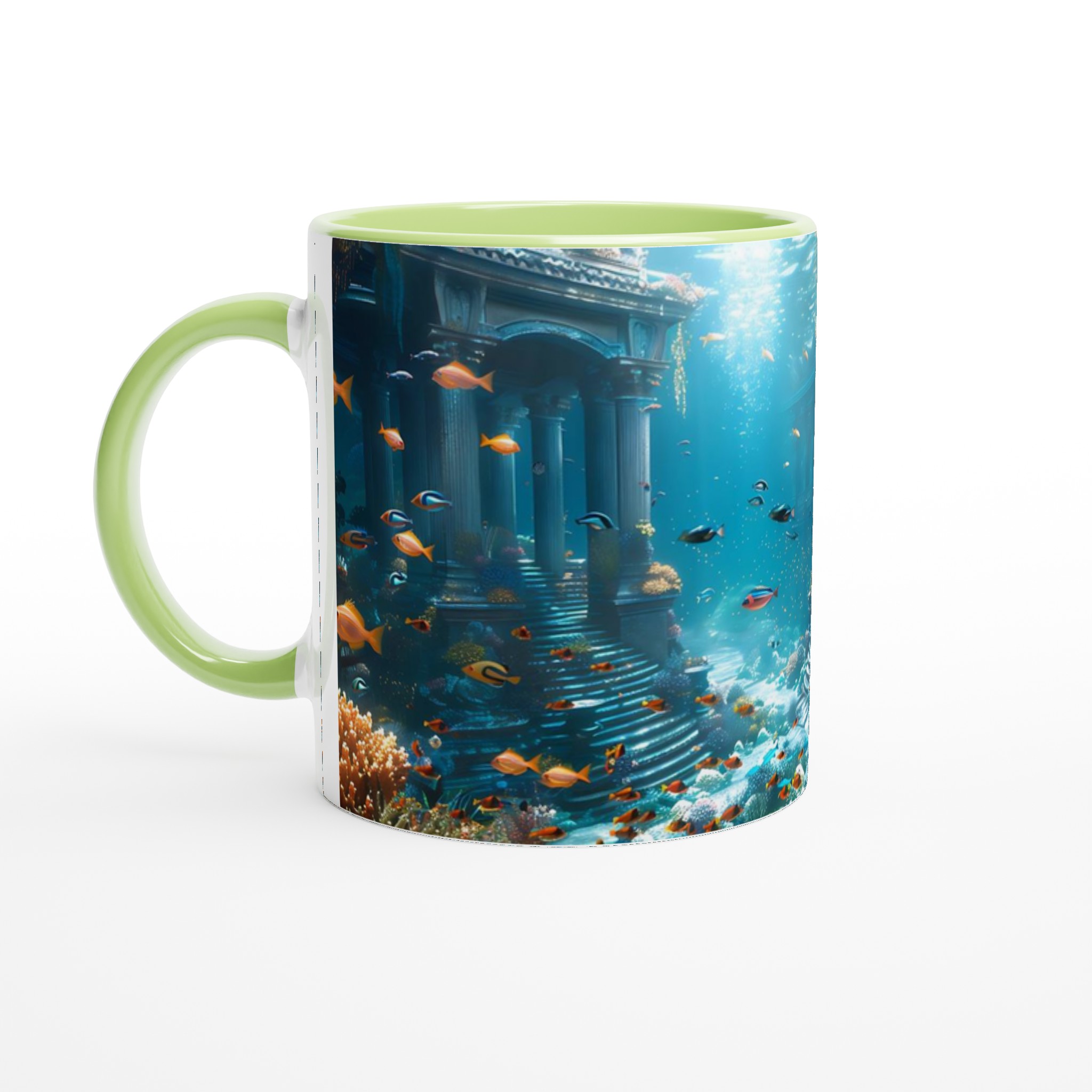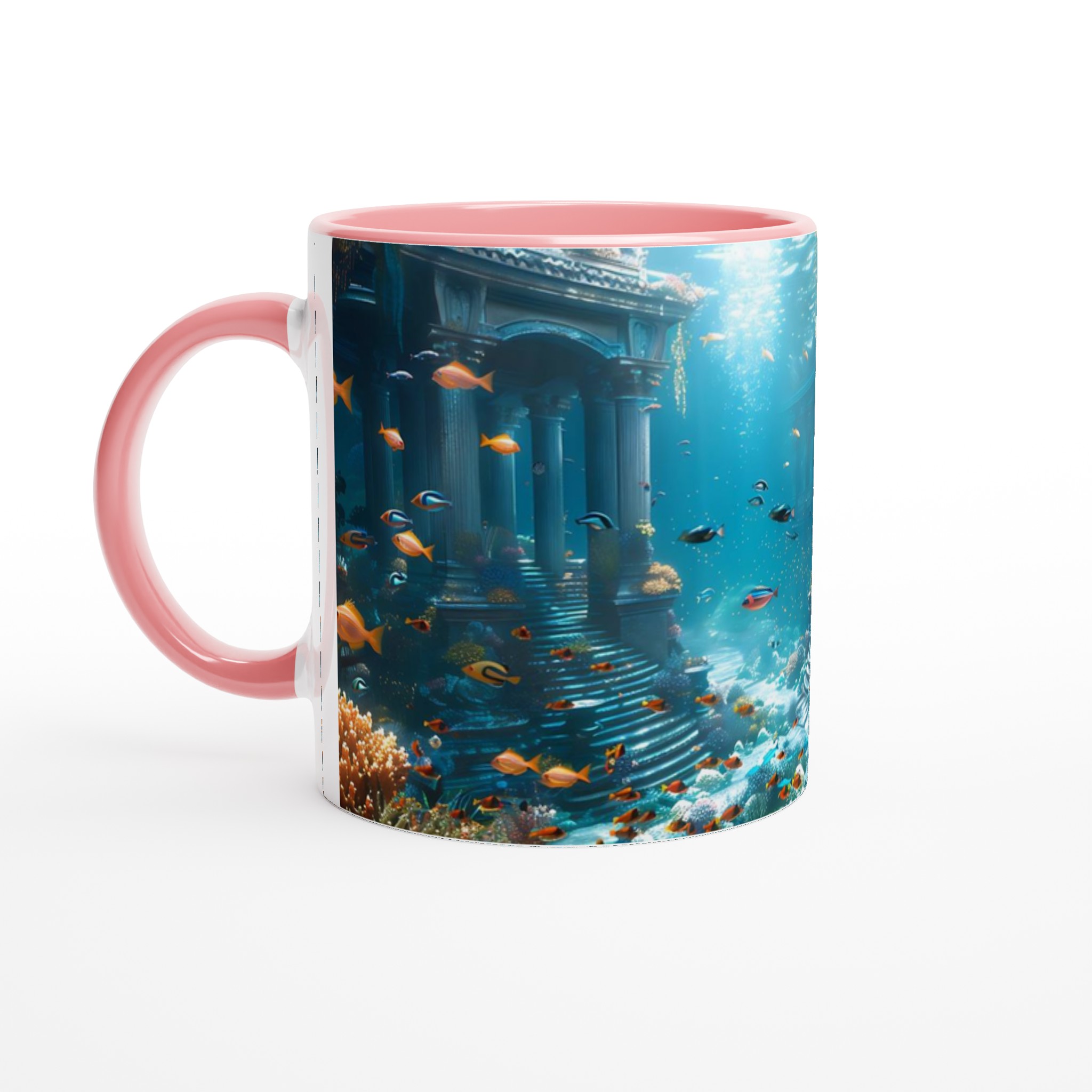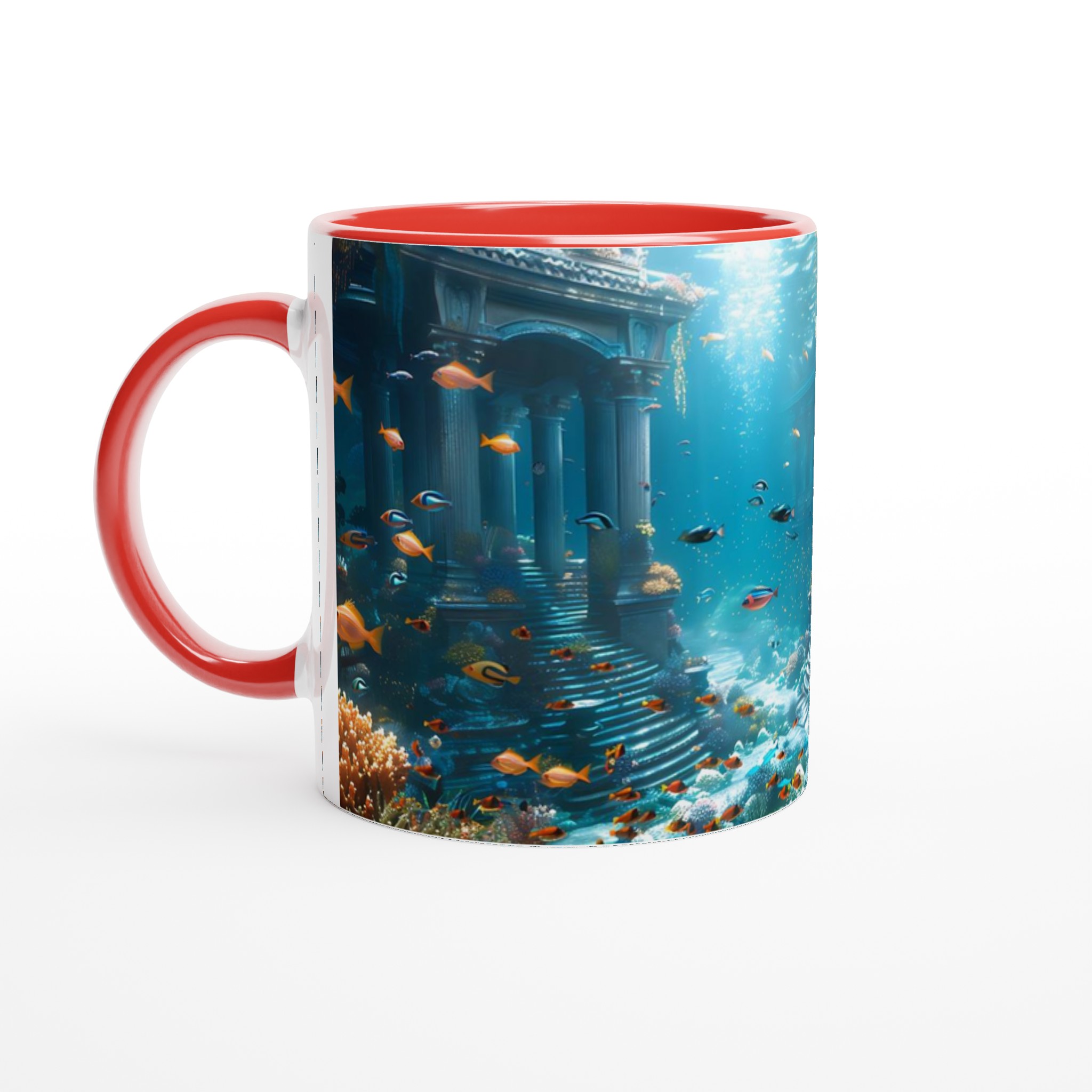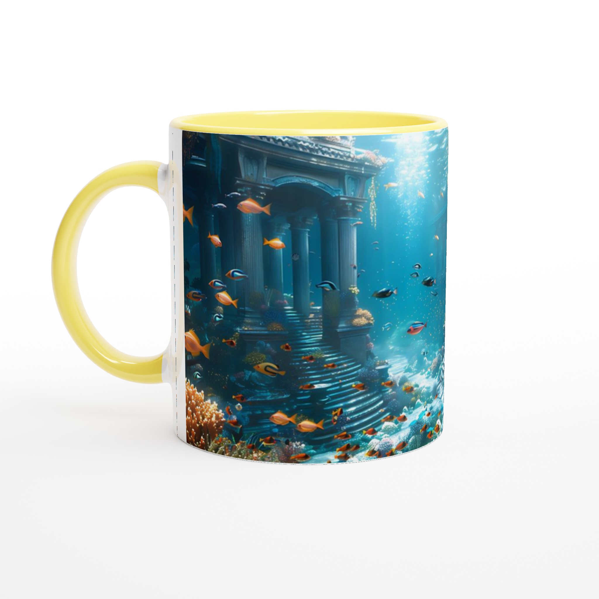 Föreställ dig en värld under ytan, där antika ruiner möter pulserande marint liv. Denna keramikmugg fångar den hisnande skönheten av ett Atlantis korallrev, fyllt med simmande fiskar och solens glittrande strålar som dansar genom vattnet. Det är den perfekta muggen för dig som drömmer om havet och vill addera en touch av magi till din fikastund.