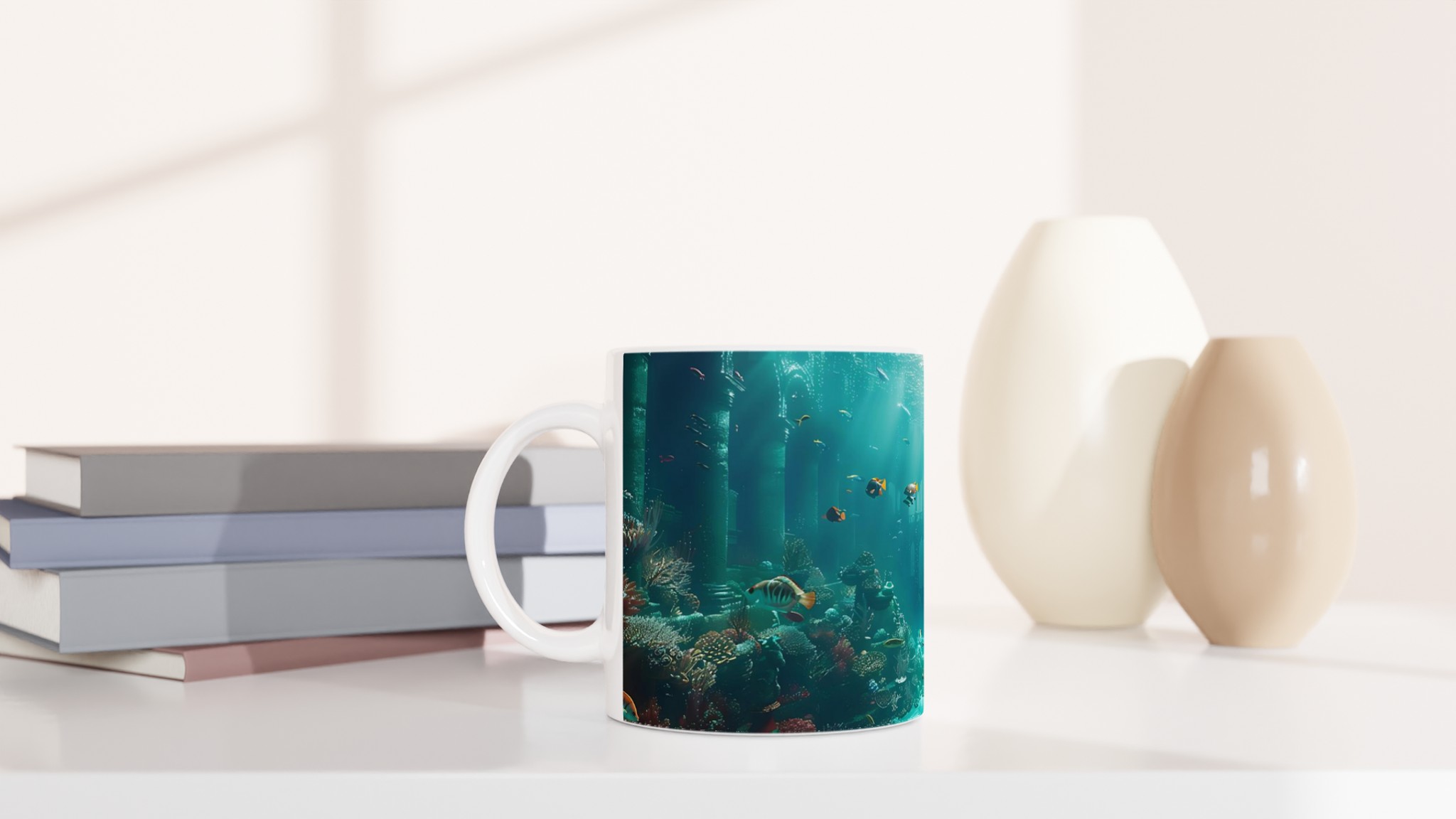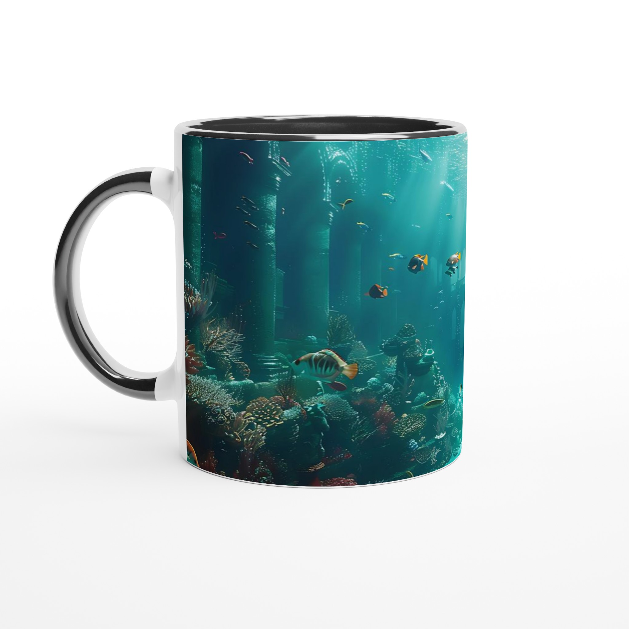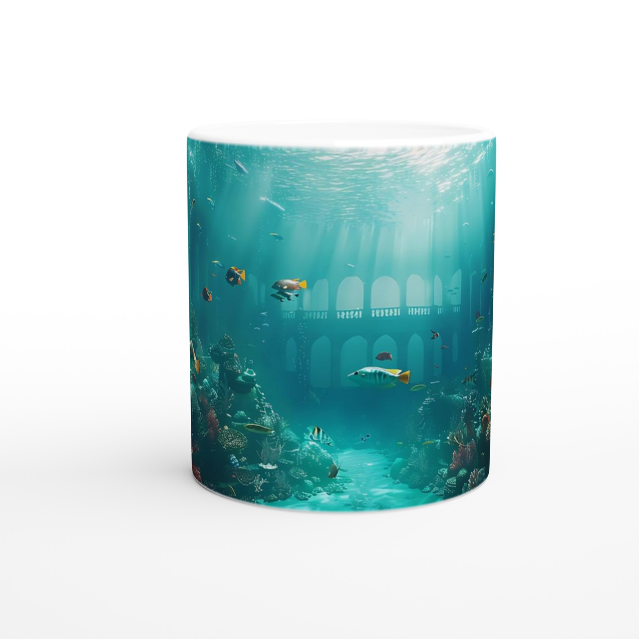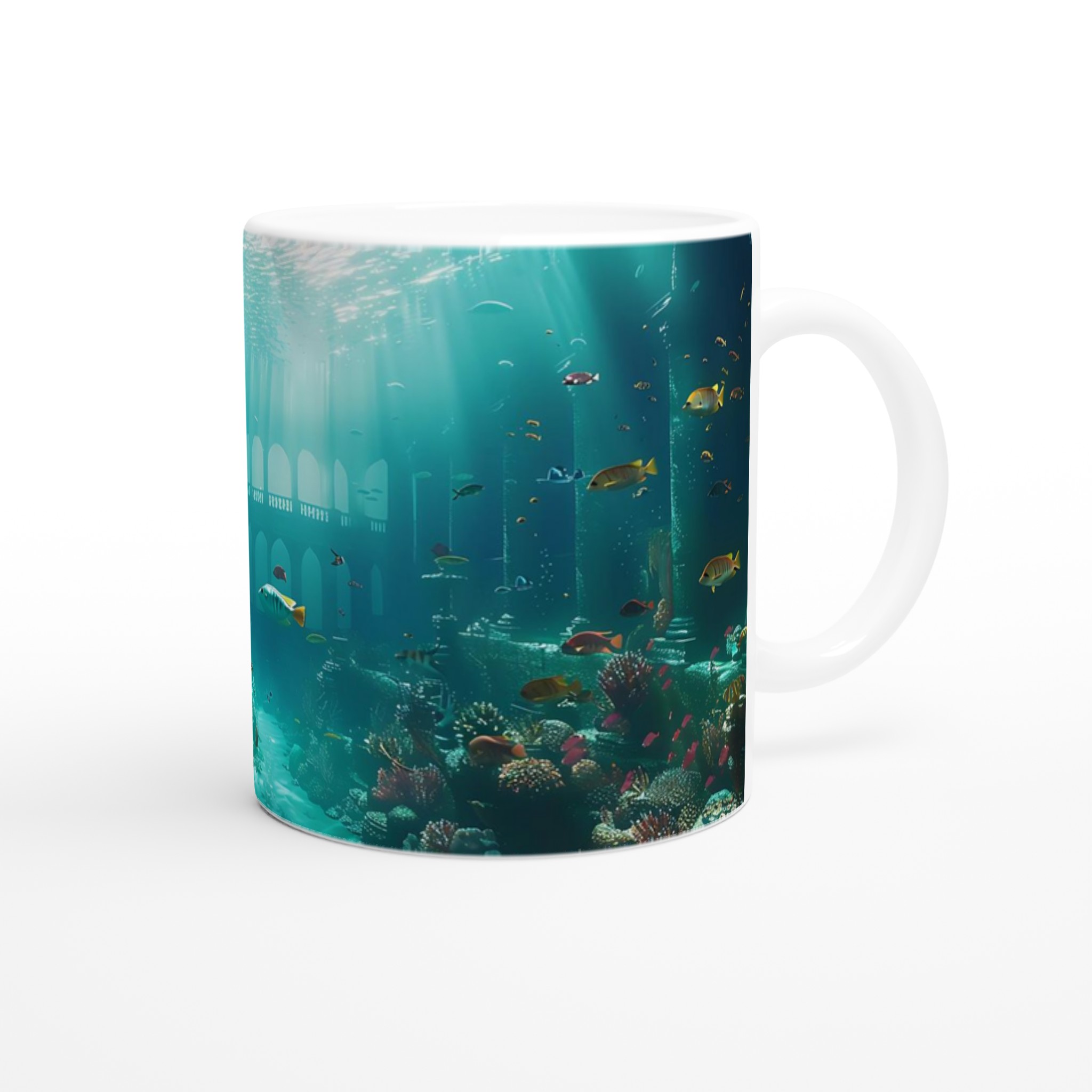 Dyk ner i en värld av underverk varje gång du tar en klunk! Denna förtrollande keramiska mugg tar dig med till Atlantis mystiska djup, komplett med livfulla korallrev och en svärm av färgglada fiskar som simmar graciöst bland uråldriga ruiner. Den akvatiska paletten av djupblått, smaragdgrönt och korallrött skapar en lugnande men ändå livlig upplevelse, perfekt för att starta dagen med inspiration eller varva ner på kvällen.