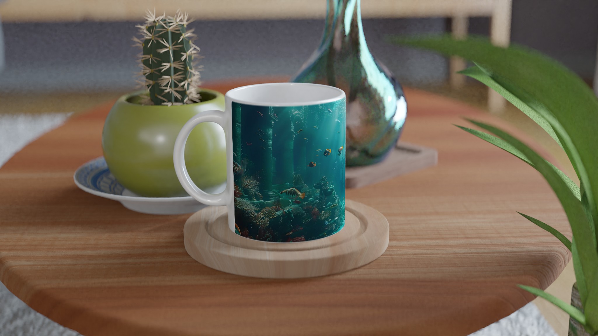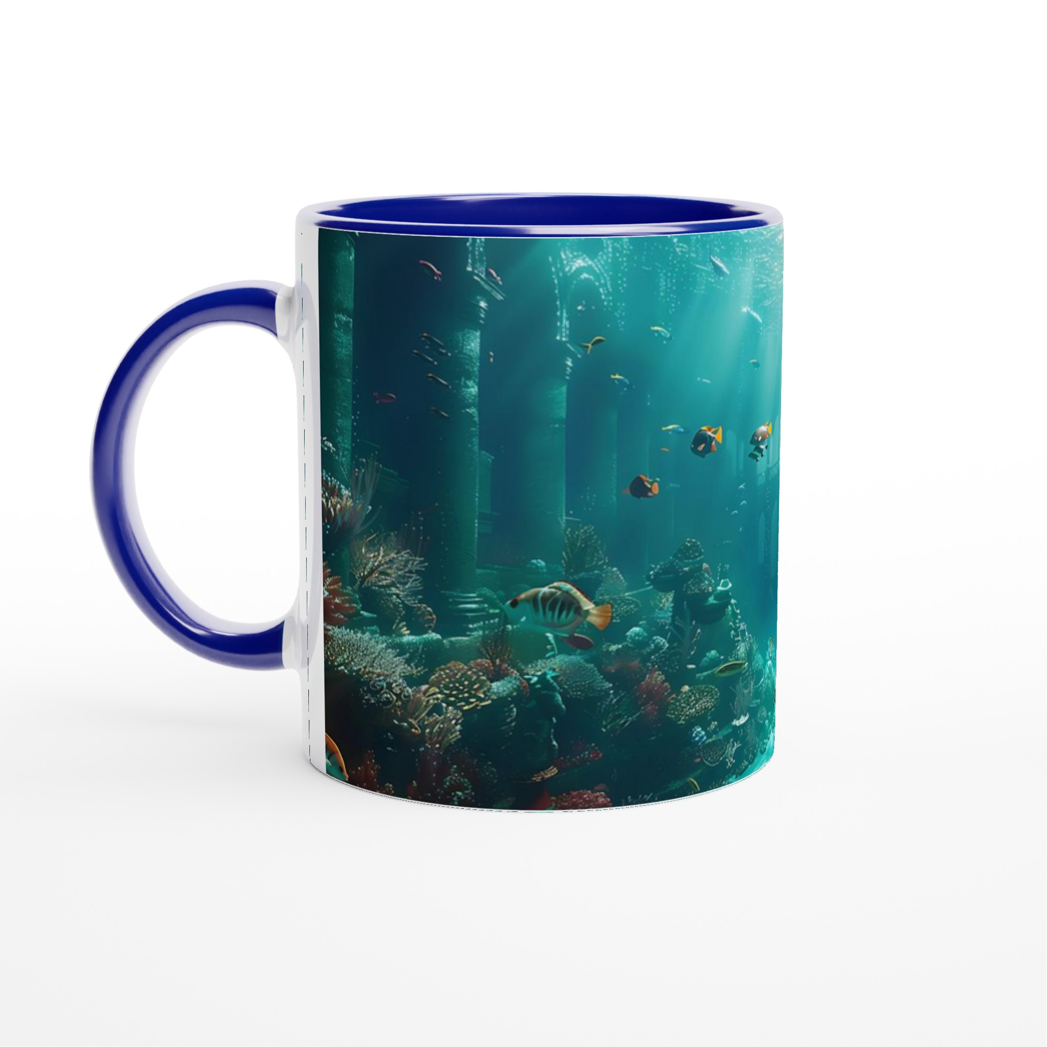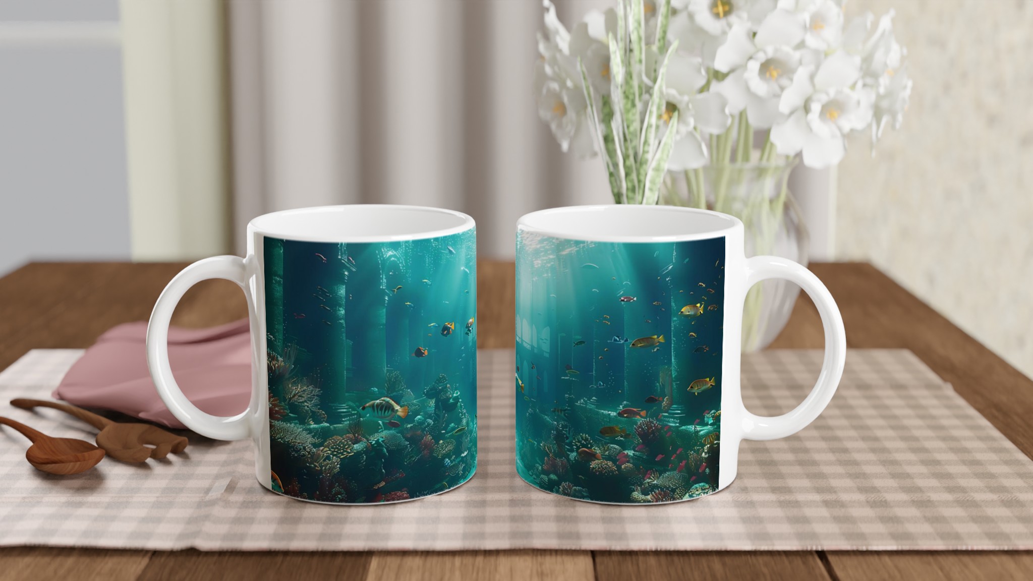 Dyk ner i en värld av underverk varje gång du tar en klunk! Denna förtrollande keramiska mugg tar dig med till Atlantis mystiska djup, komplett med livfulla korallrev och en svärm av färgglada fiskar som simmar graciöst bland uråldriga ruiner. Den akvatiska paletten av djupblått, smaragdgrönt och korallrött skapar en lugnande men ändå livlig upplevelse, perfekt för att starta dagen med inspiration eller varva ner på kvällen.