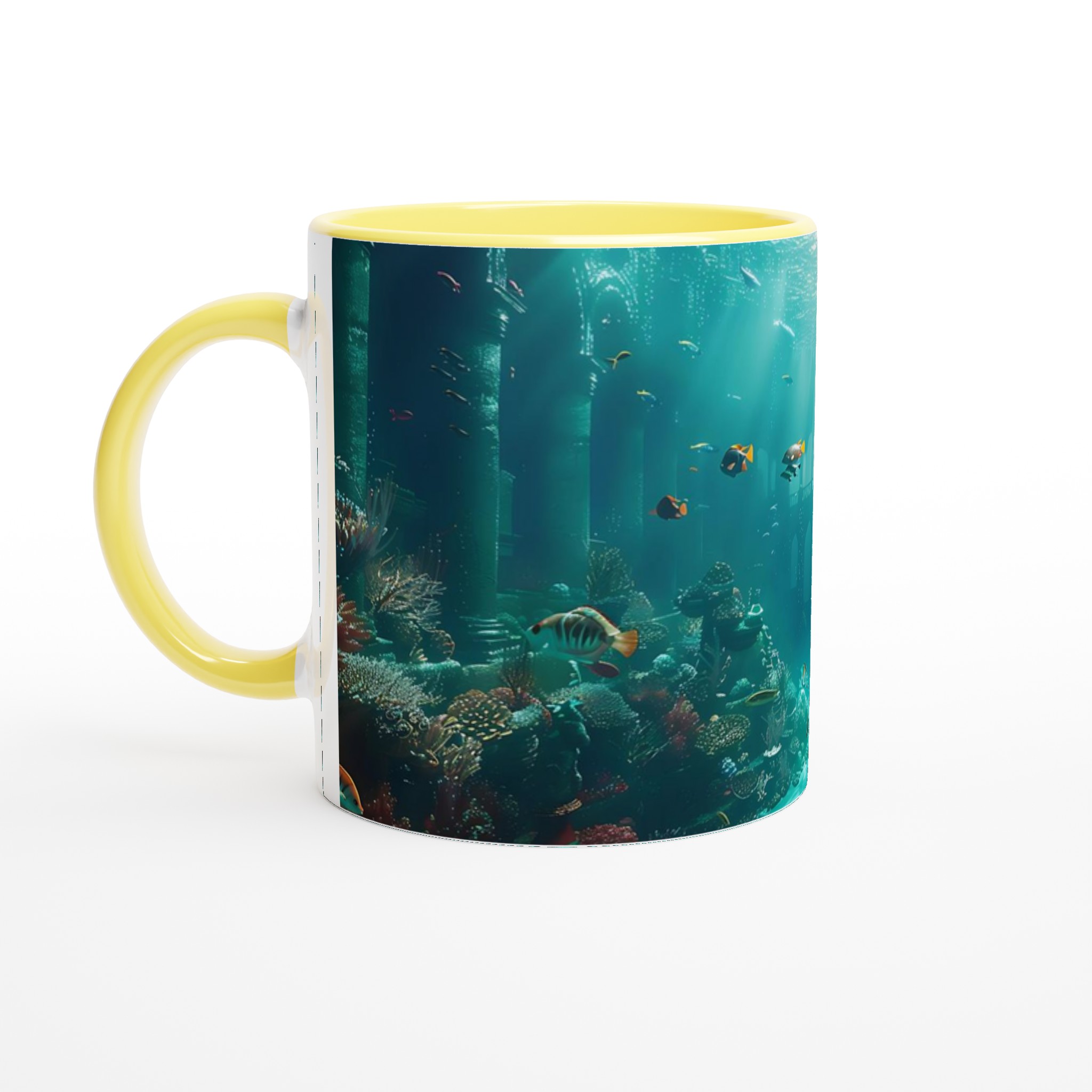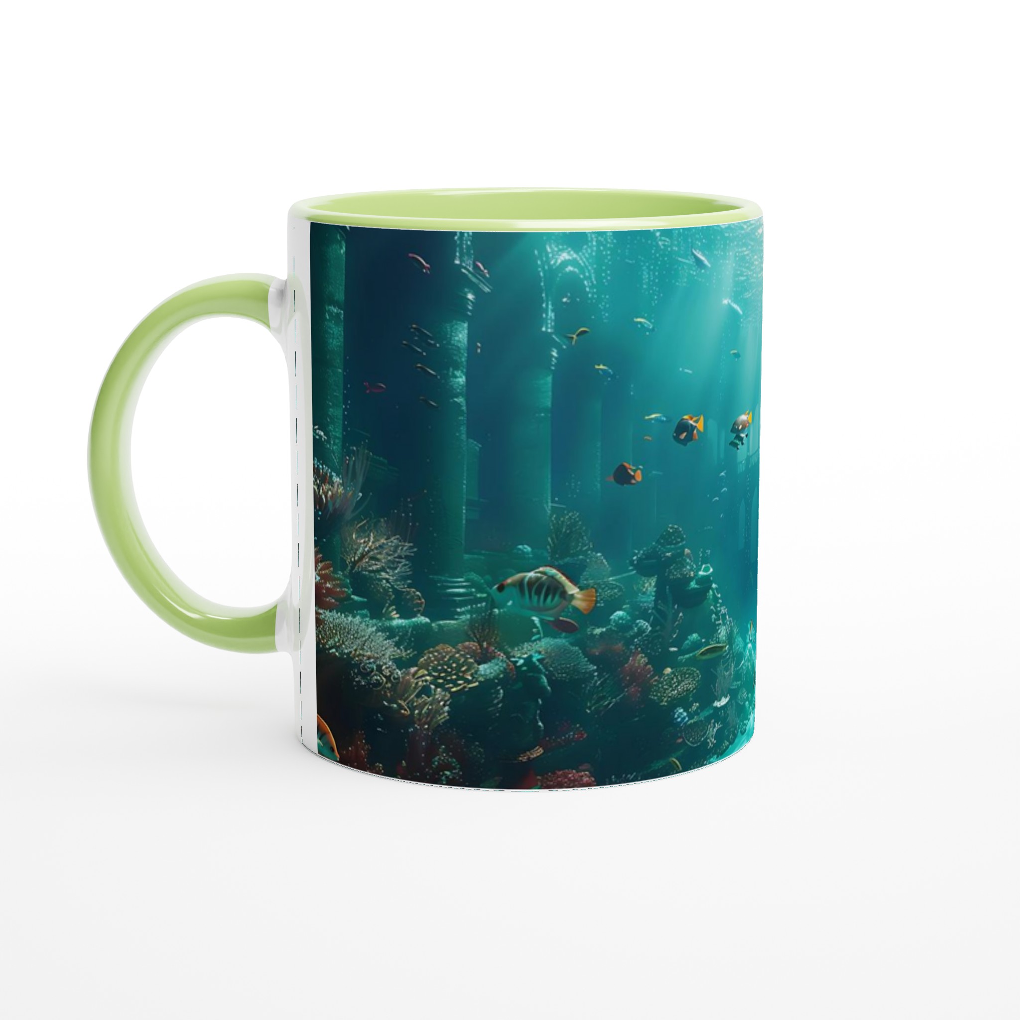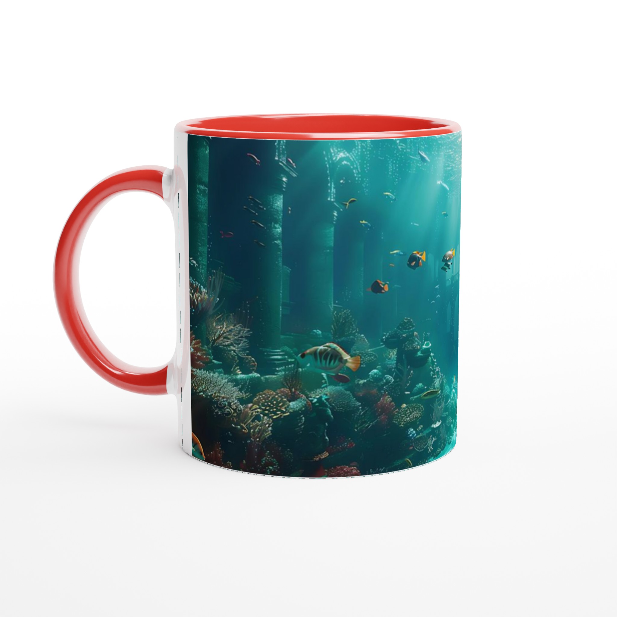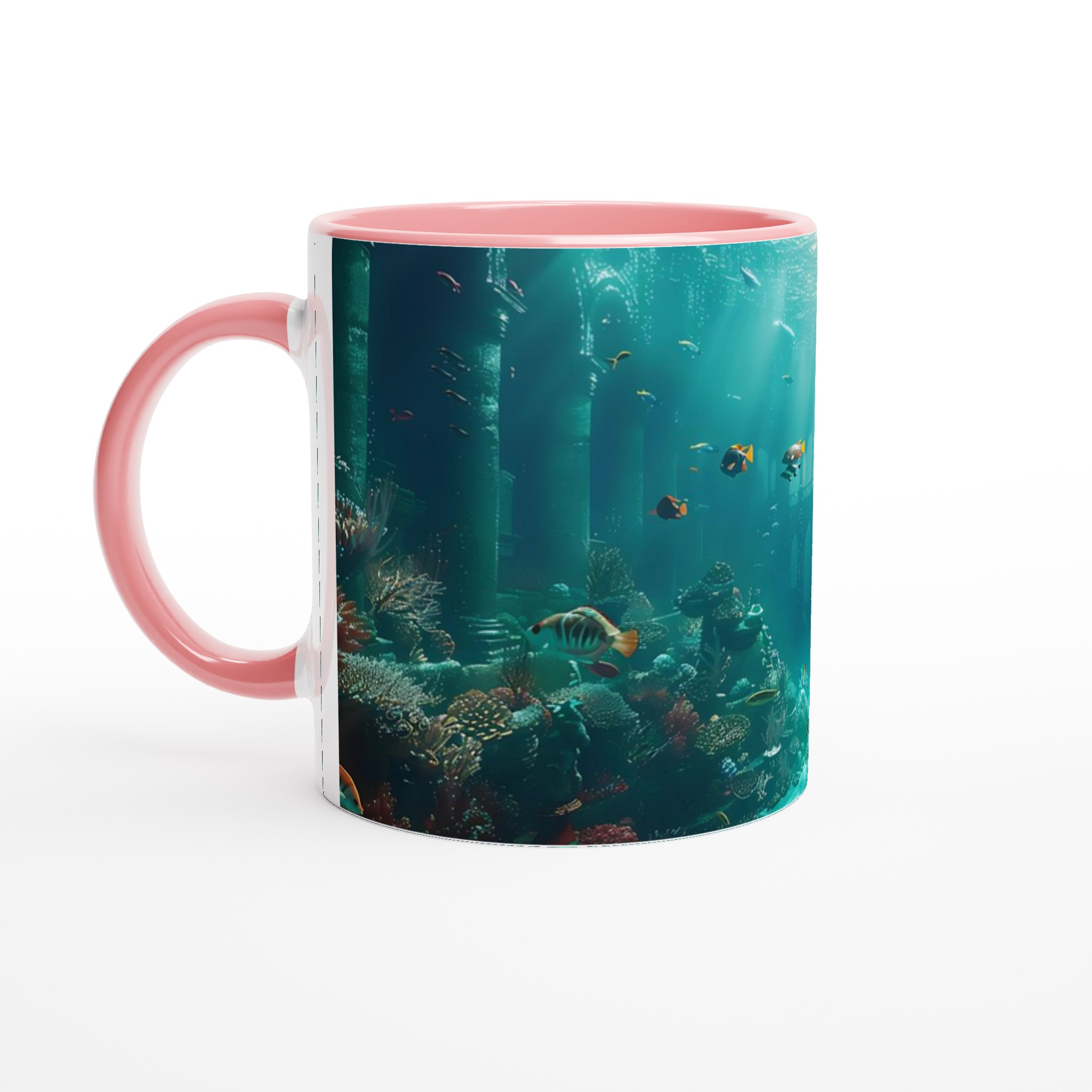 Dyk ner i en värld av underverk varje gång du tar en klunk! Denna förtrollande keramiska mugg tar dig med till Atlantis mystiska djup, komplett med livfulla korallrev och en svärm av färgglada fiskar som simmar graciöst bland uråldriga ruiner. Den akvatiska paletten av djupblått, smaragdgrönt och korallrött skapar en lugnande men ändå livlig upplevelse, perfekt för att starta dagen med inspiration eller varva ner på kvällen.