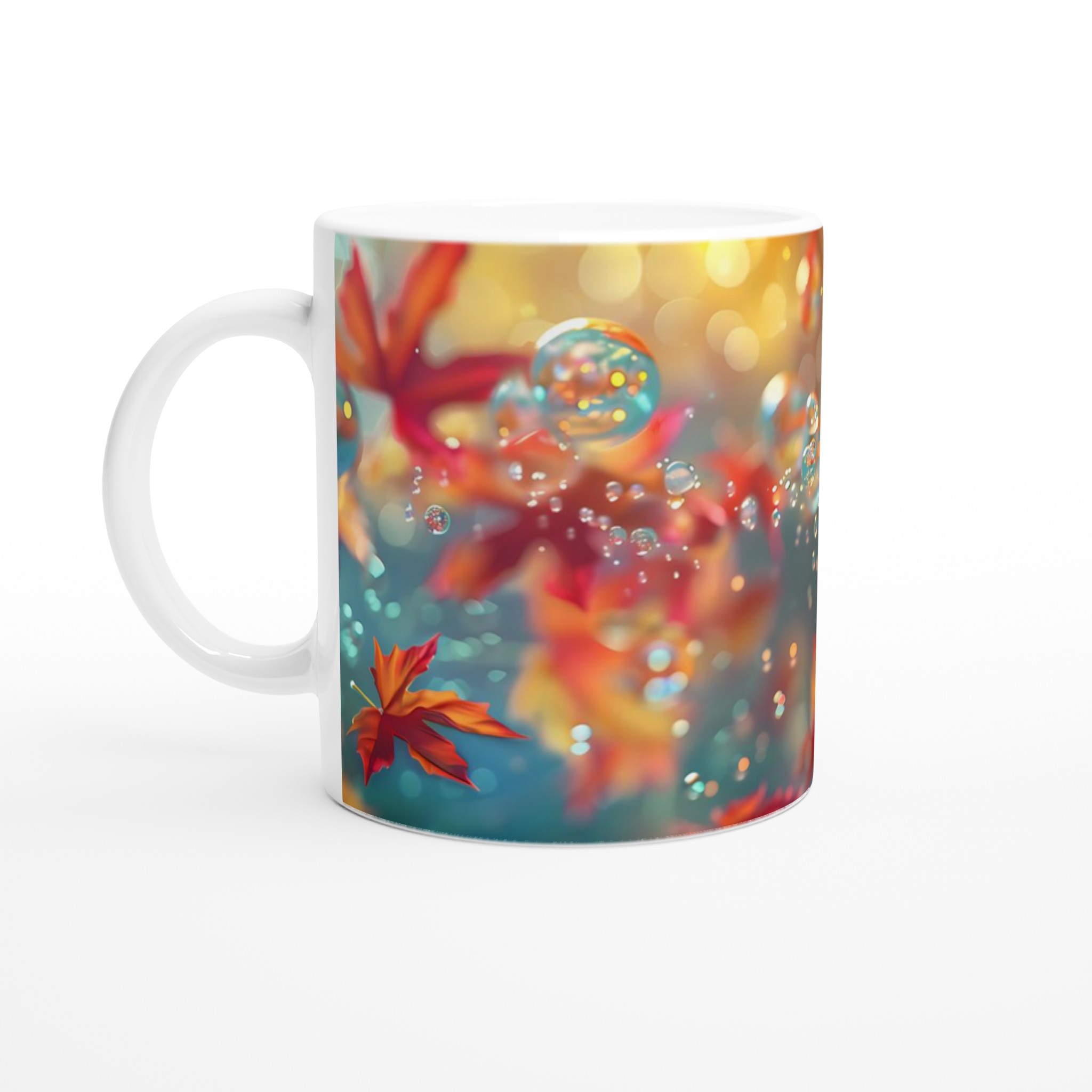 Inspirerad av höstens förtrollande skönhet, med flytande löv och glittrande bubblor, kommer denna mugg att införa en känsla av lugn och glädje i din dag. Den blanka vita ytan ger ett skarpt och levande tryck som verkligen sticker ut, oavsett om det är en personlig design, ett roligt citat eller en present till någon du tycker om.