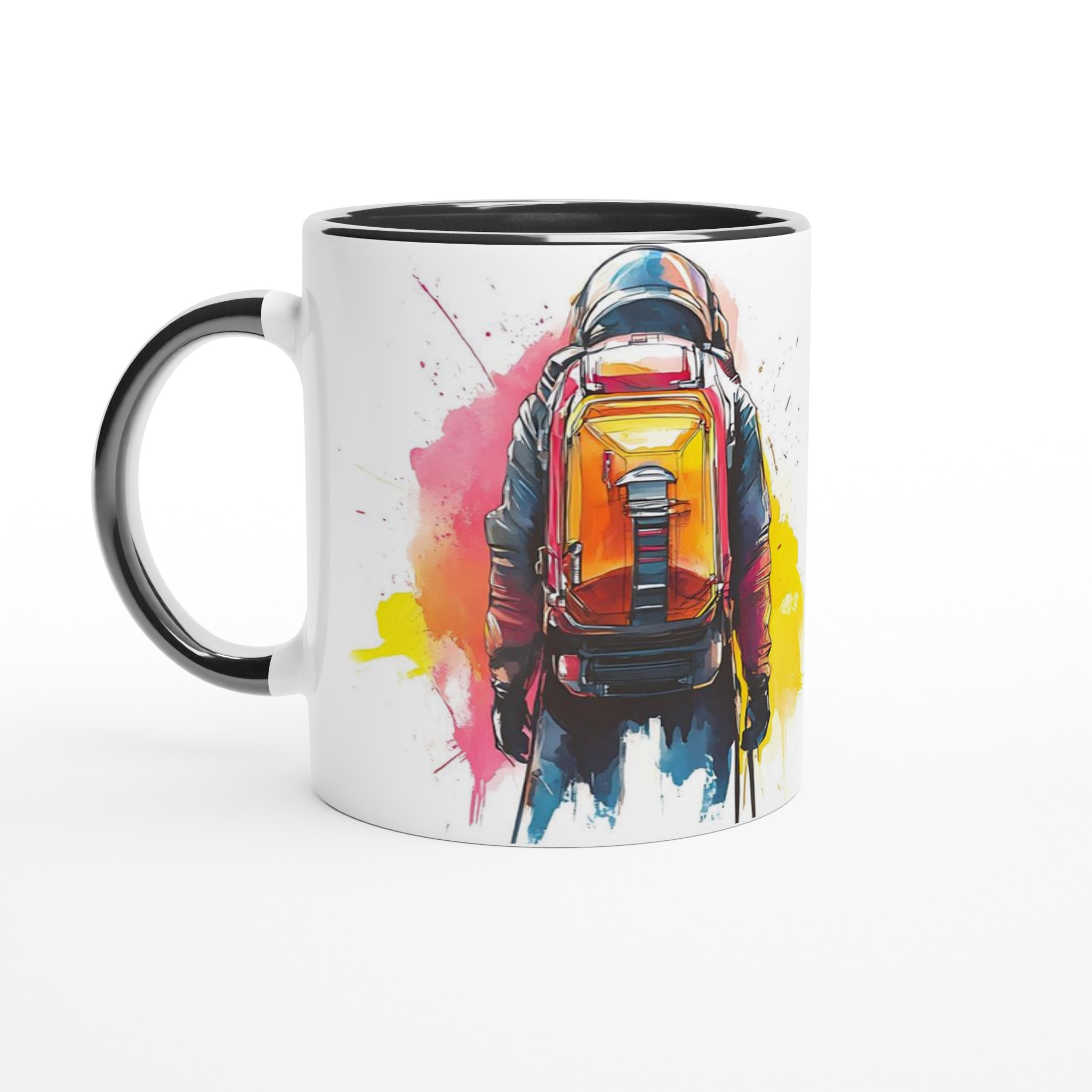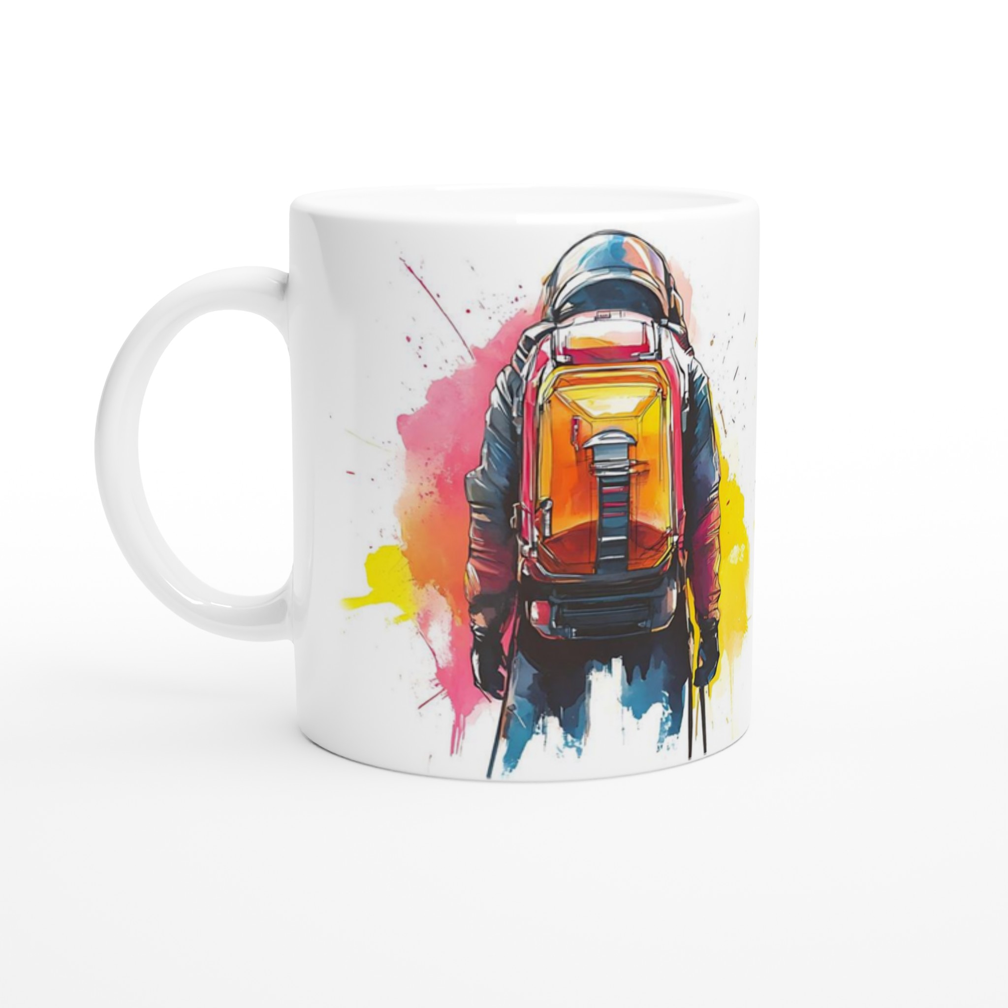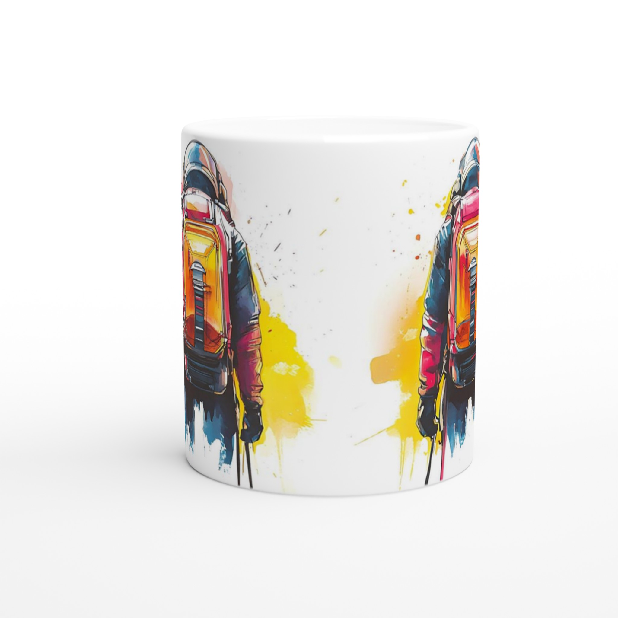 Ge din dag en injektion av äventyr med vår stilrena keramiska mugg, som fångar den dynamiska energin från en bergsbestigare i en livfull akvarellstil. Den här muggen blir snabbt en vardagsfavorit, perfekt för morgonkaffet, kvällens varma choklad eller när du bara vill njuta av en kopp te.