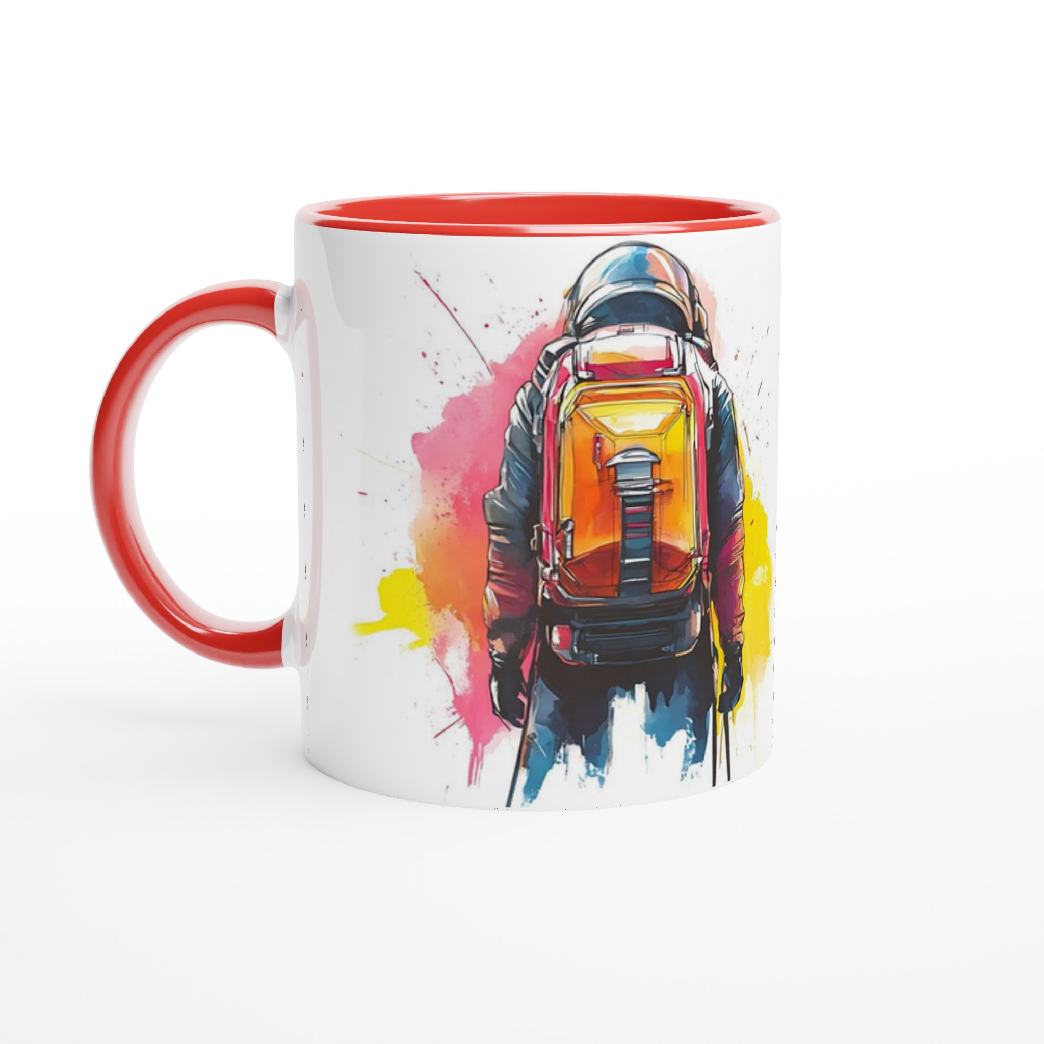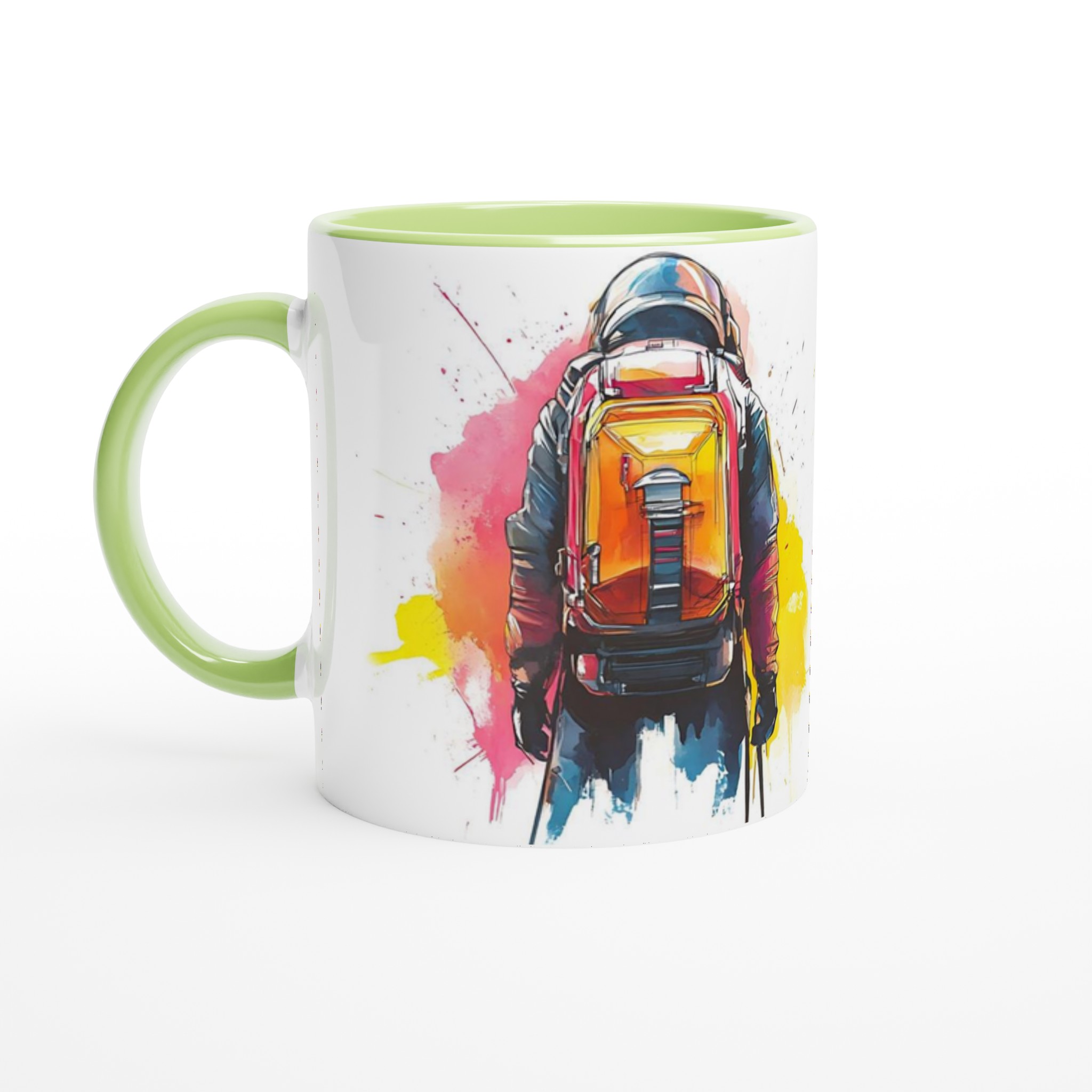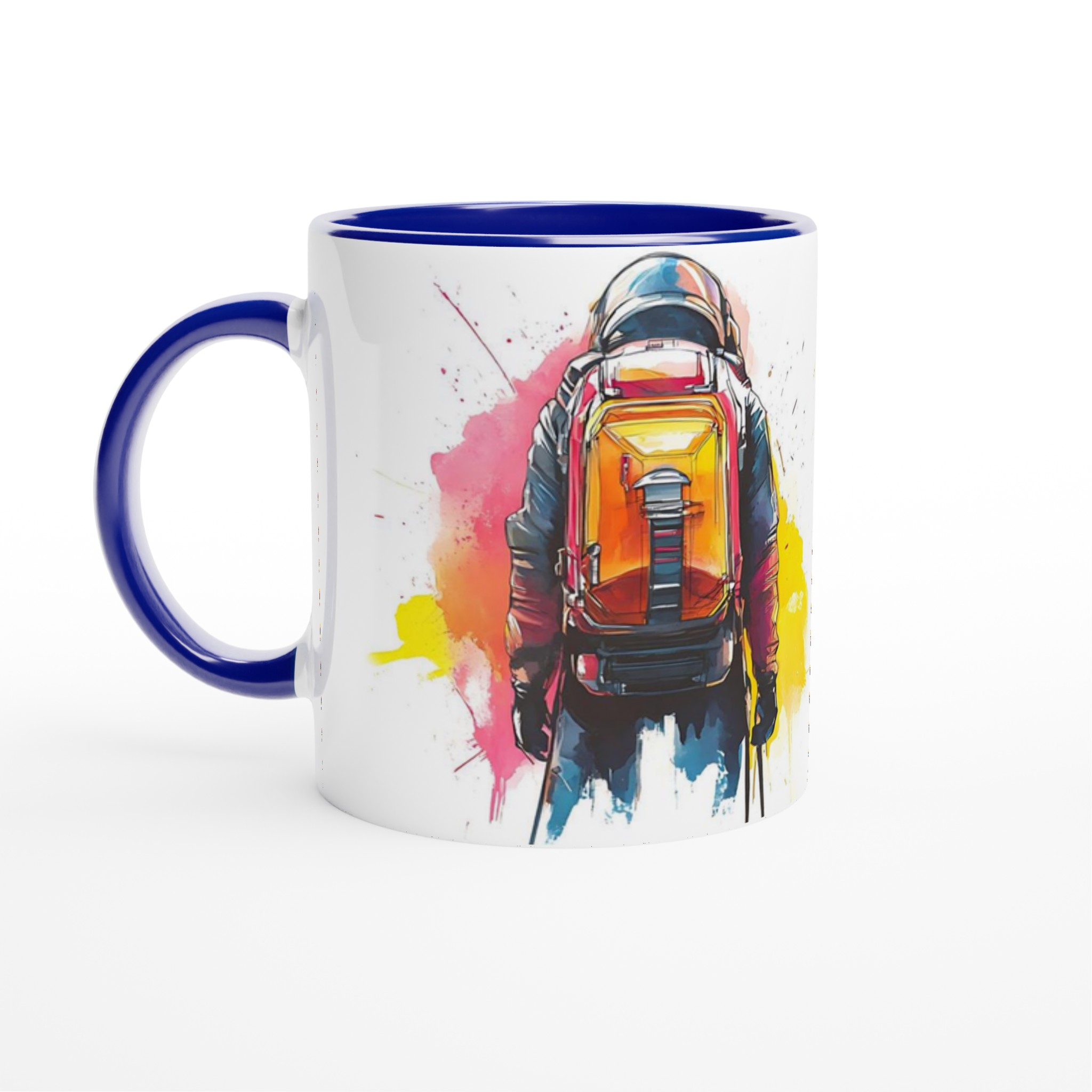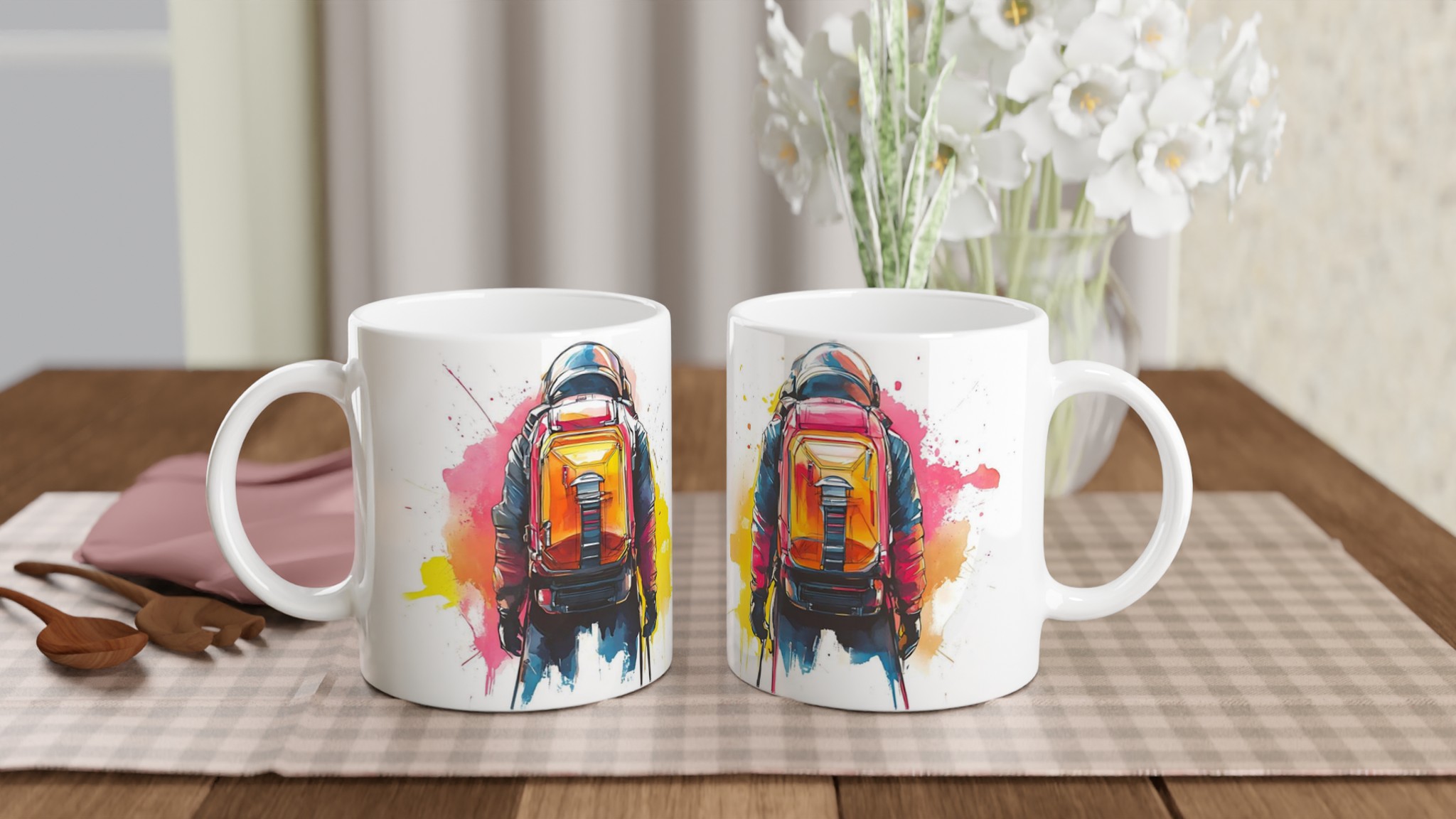 Ge din dag en injektion av äventyr med vår stilrena keramiska mugg, som fångar den dynamiska energin från en bergsbestigare i en livfull akvarellstil. Den här muggen blir snabbt en vardagsfavorit, perfekt för morgonkaffet, kvällens varma choklad eller när du bara vill njuta av en kopp te.