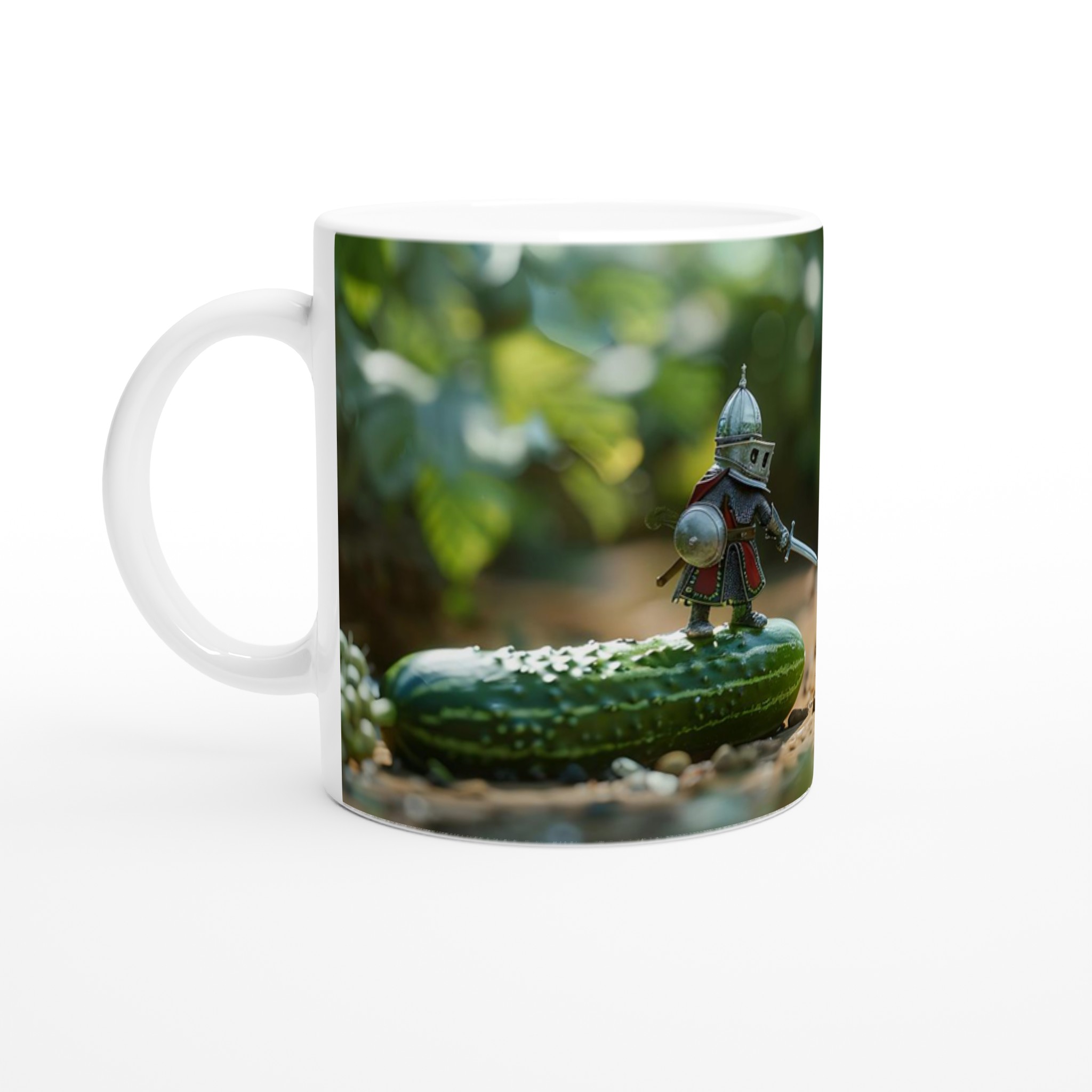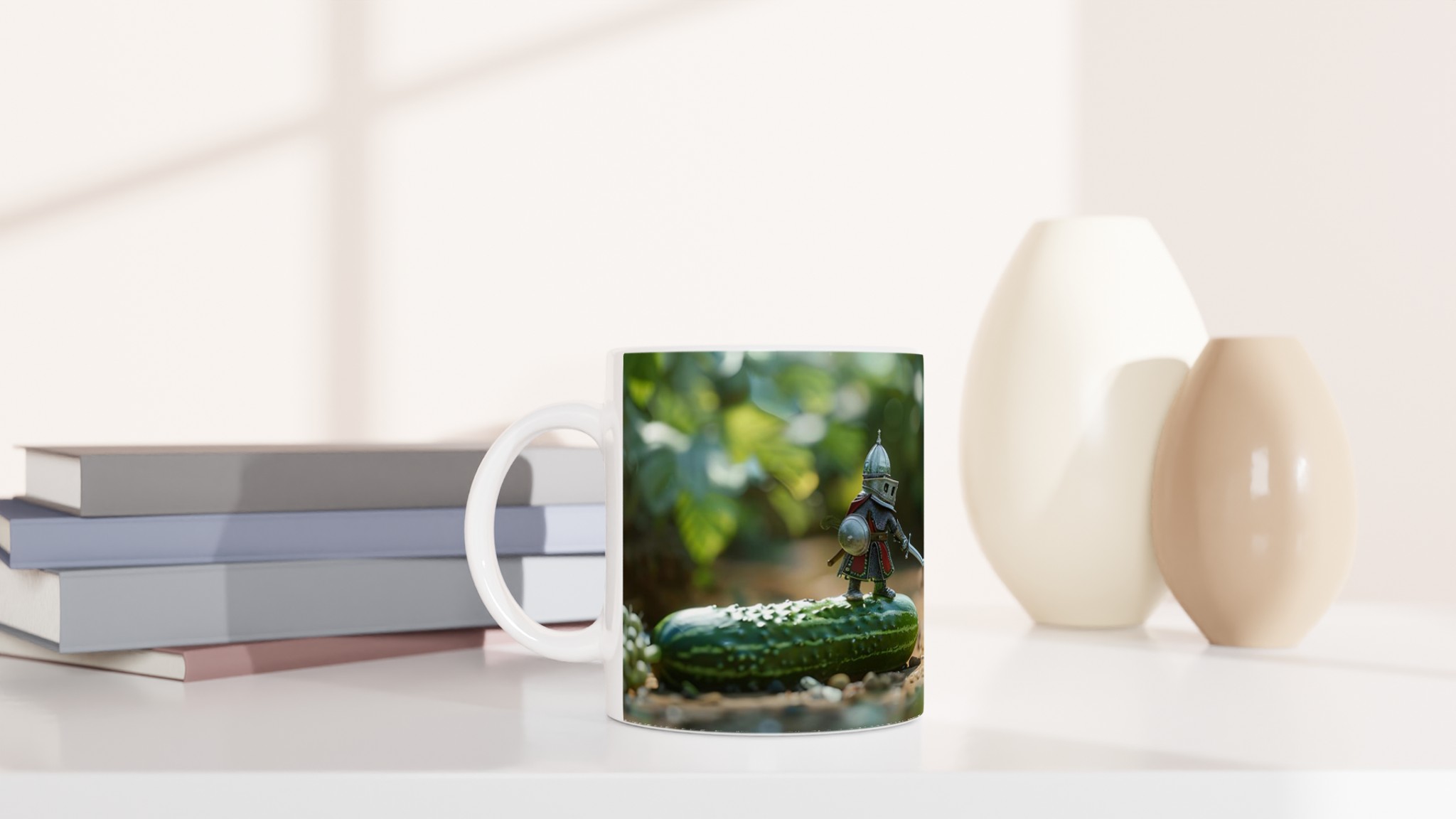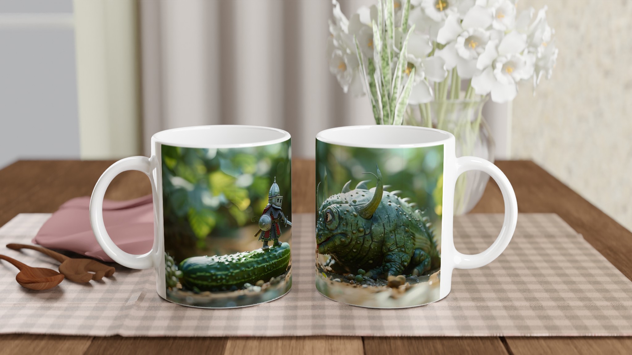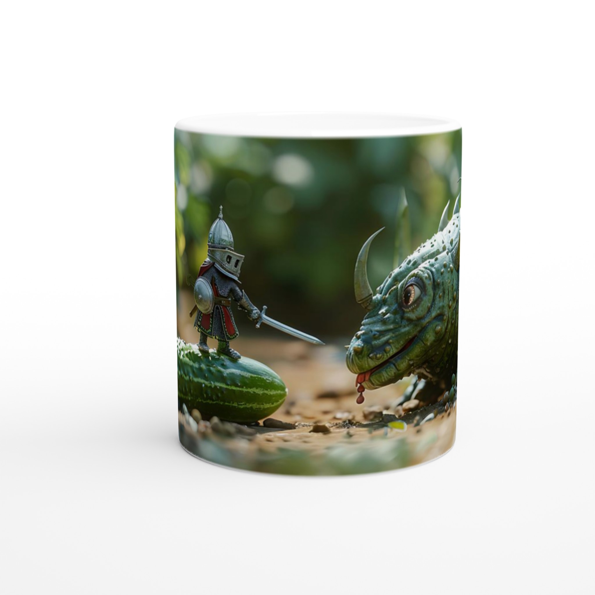 Ge din dag en dos av äventyr med denna unika keramiska mugg! Föreställ dig den tappre gurksoldaten som modigt möter den stora drakgurkan – en scen som garanterat väcker fantasin till liv varje gång du tar en klunk. Denna stilrena keramiska mugg blir snabbt en vardagsfavorit, perfekt för morgonkaffet, kvällens varma choklad eller när du bara vill njuta av en kopp te.