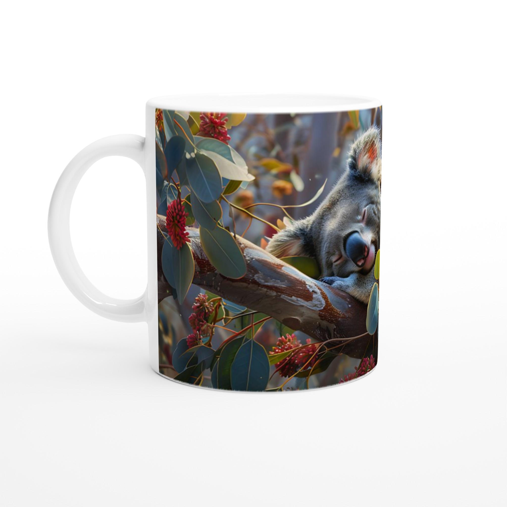 Låt lugnet från en sovande koala i ett eukalyptusträd, omgiven av vackra röda blommor, inspirera dina pauser. Denna design ger en känsla av ro och harmoni till varje dryck, perfekt för att varva ner efter en lång dag eller för att hitta stillhet i din morgonrutin.