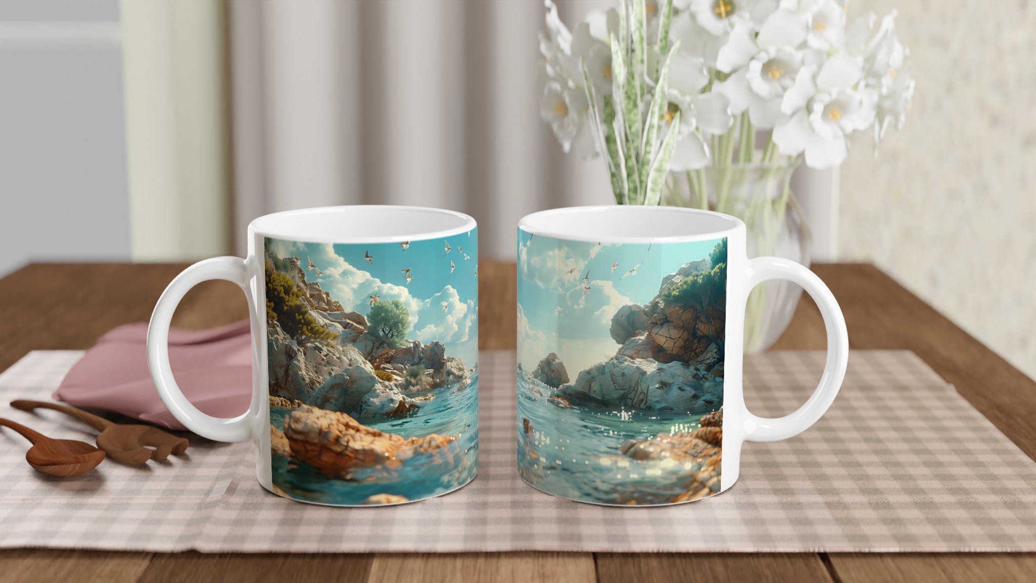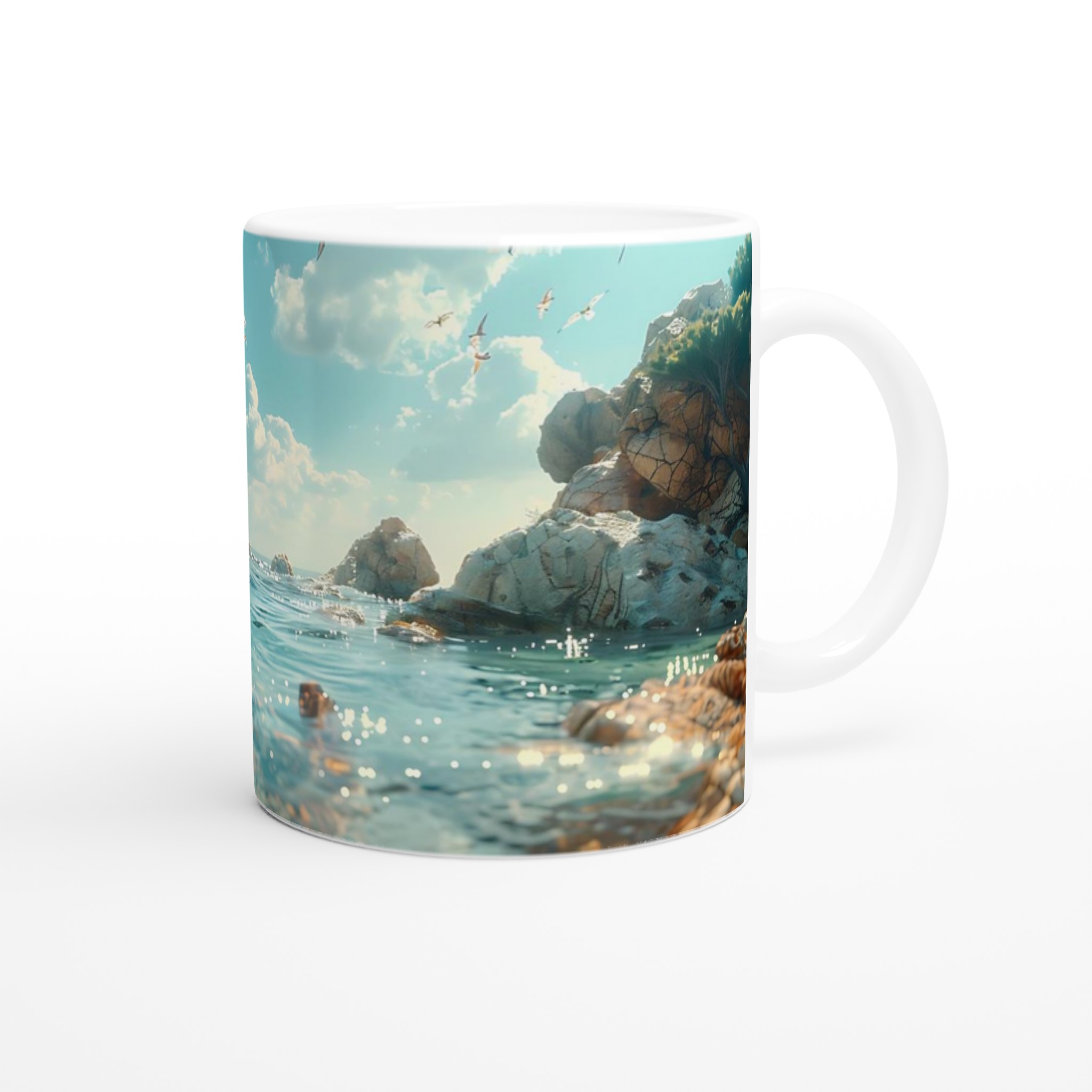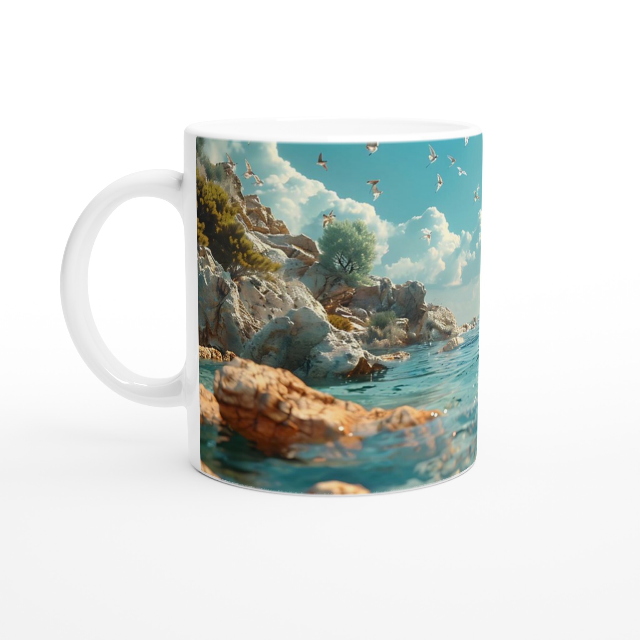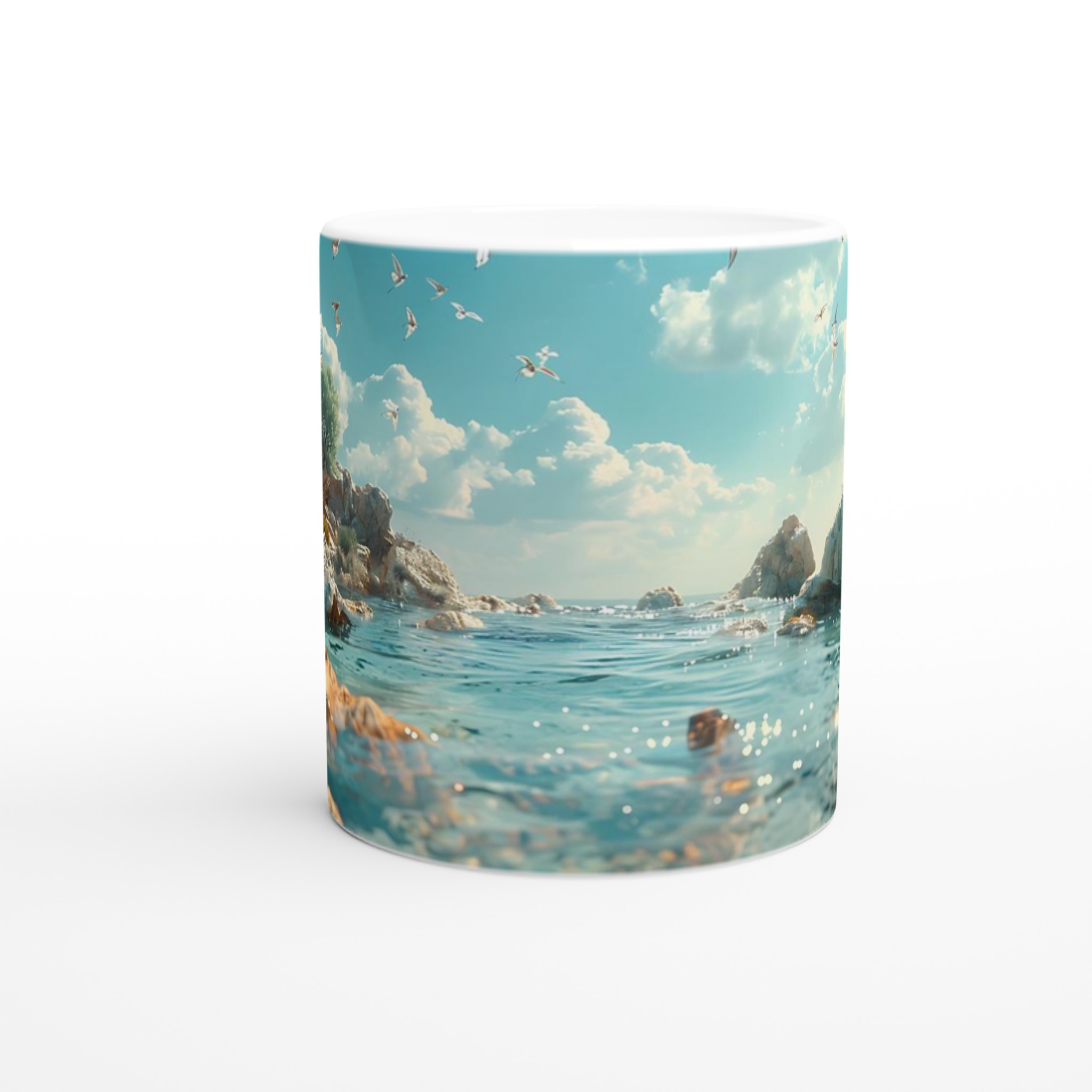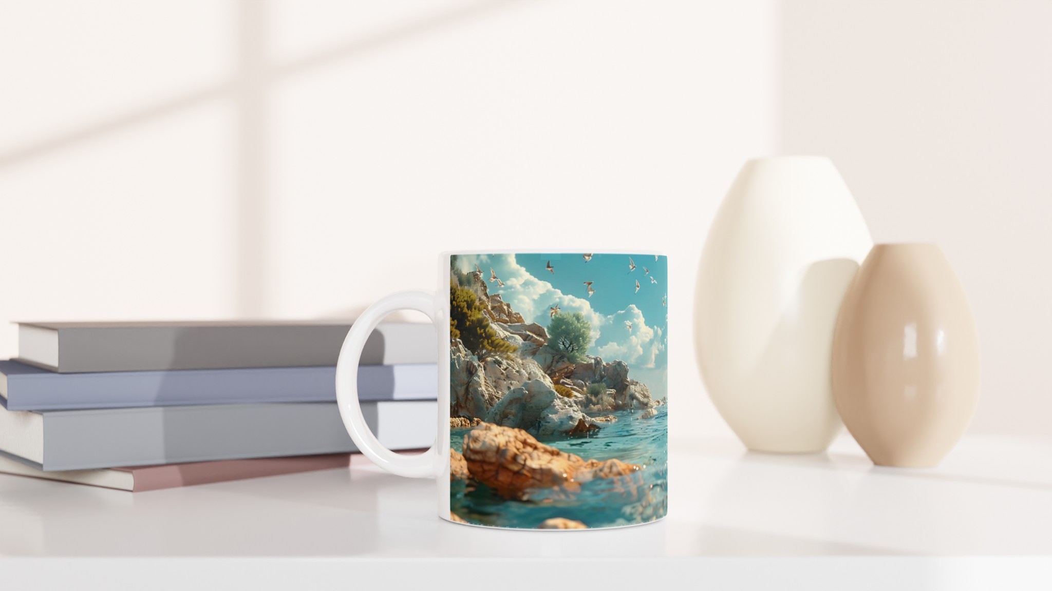 Dröm dig bort till en stillsam kustlinje med varje klunk från denna lugnande keramiska mugg. Föreställ dig den kristallklara horisonten, de flygande fåglarna och den varma glöden från solen som möter det turkosa vattnet – allt fångat i en design som inspirerar till lugn och ro. Den här stilrena muggen blir snabbt en vardagsfavorit, perfekt för morgonkaffet, kvällens varma choklad eller när du bara vill njuta av en kopp te. Den blanka ytan får trycket att framhävas med klara och levande färger, som håller sig fina även efter många turer i mikron och diskmaskinen.