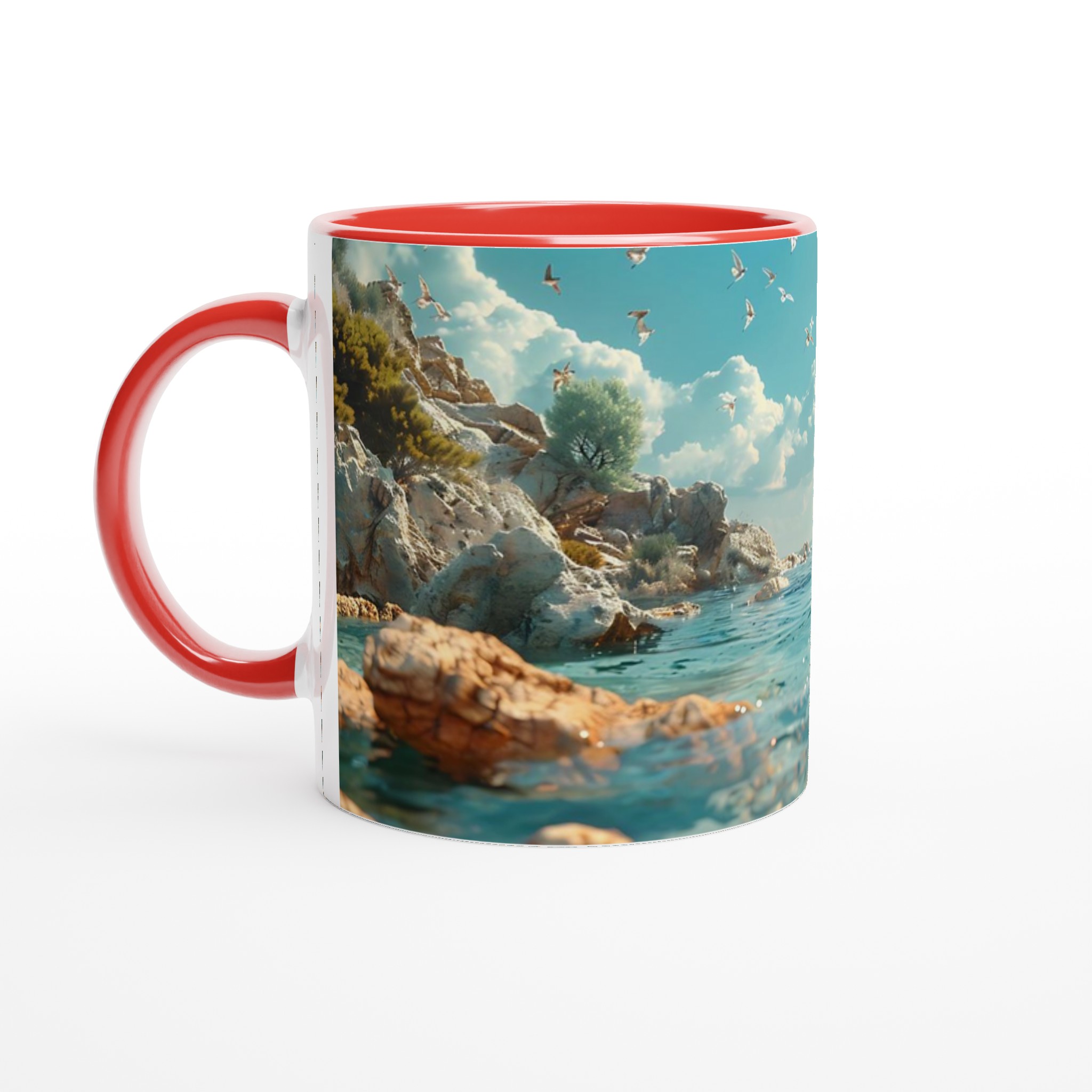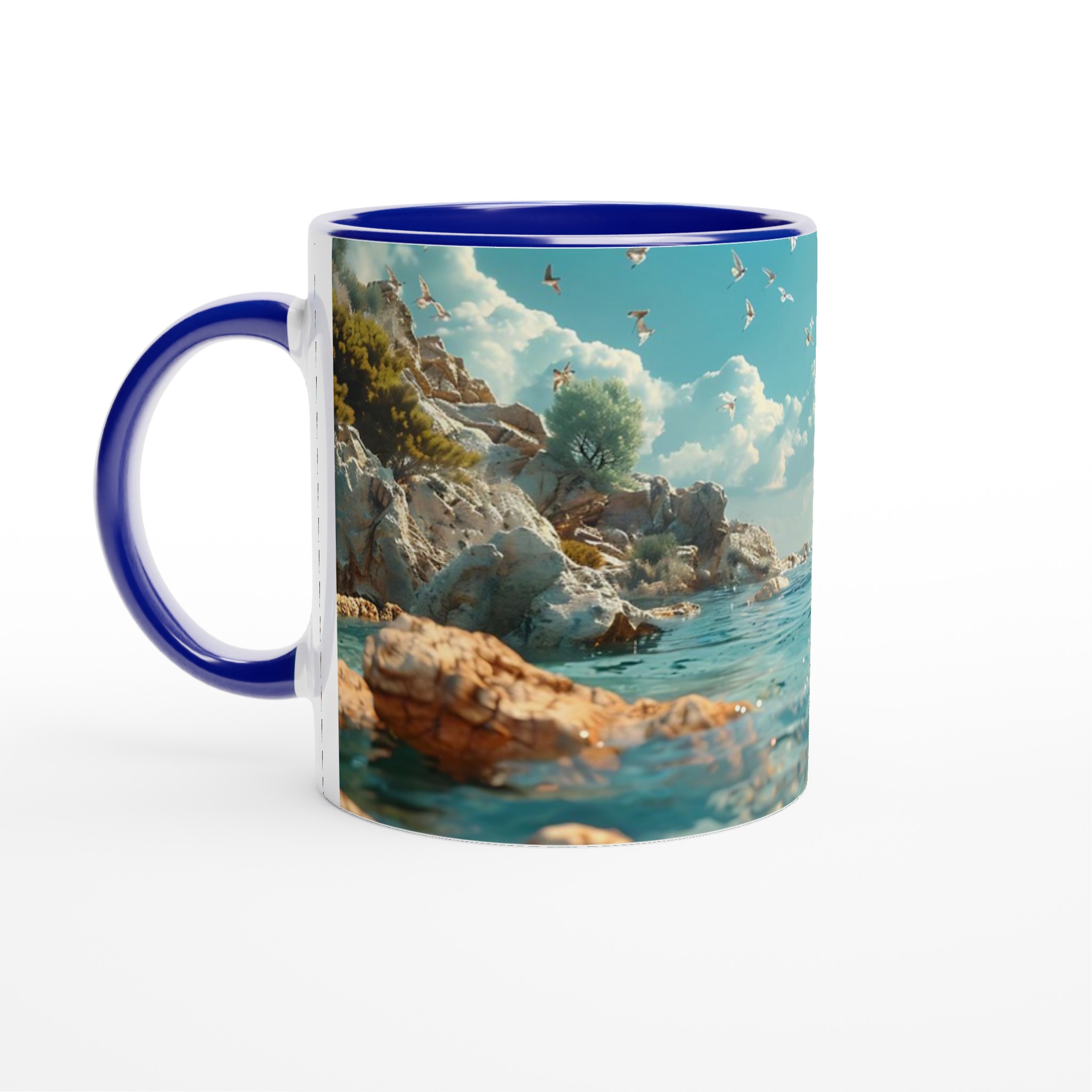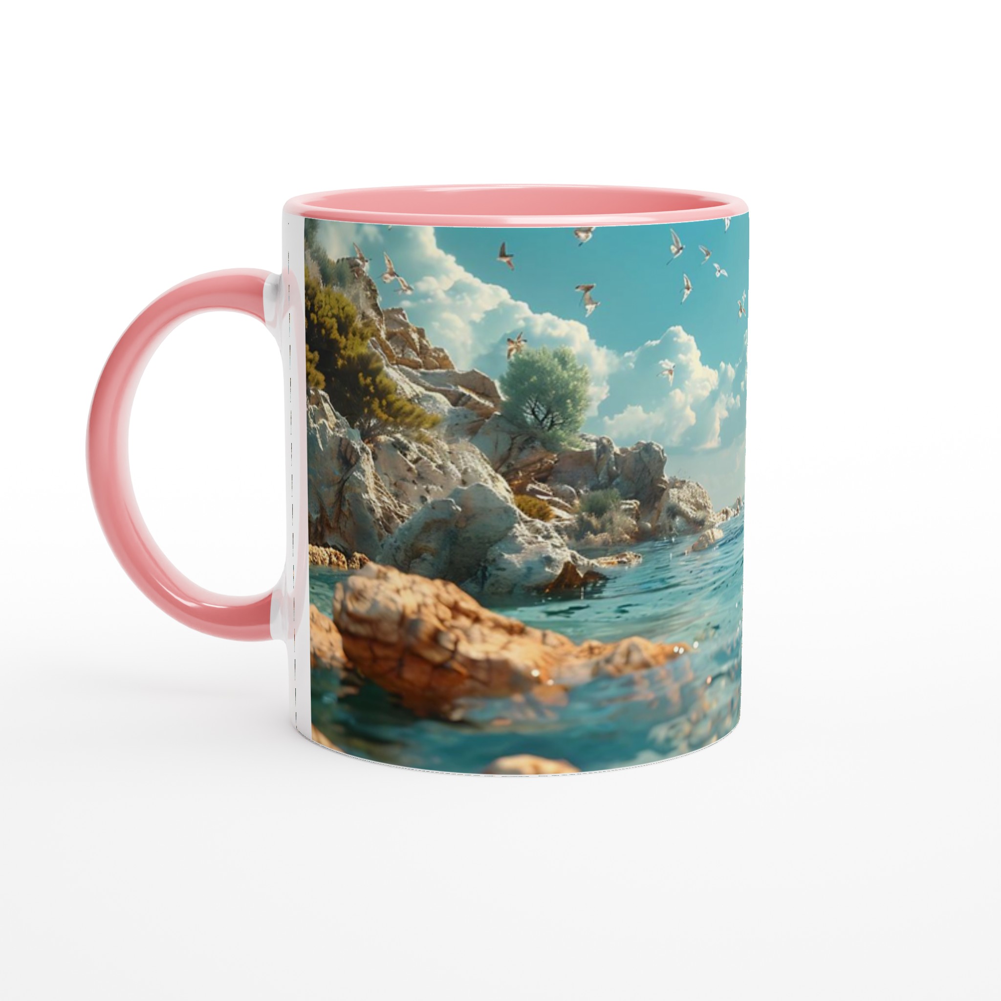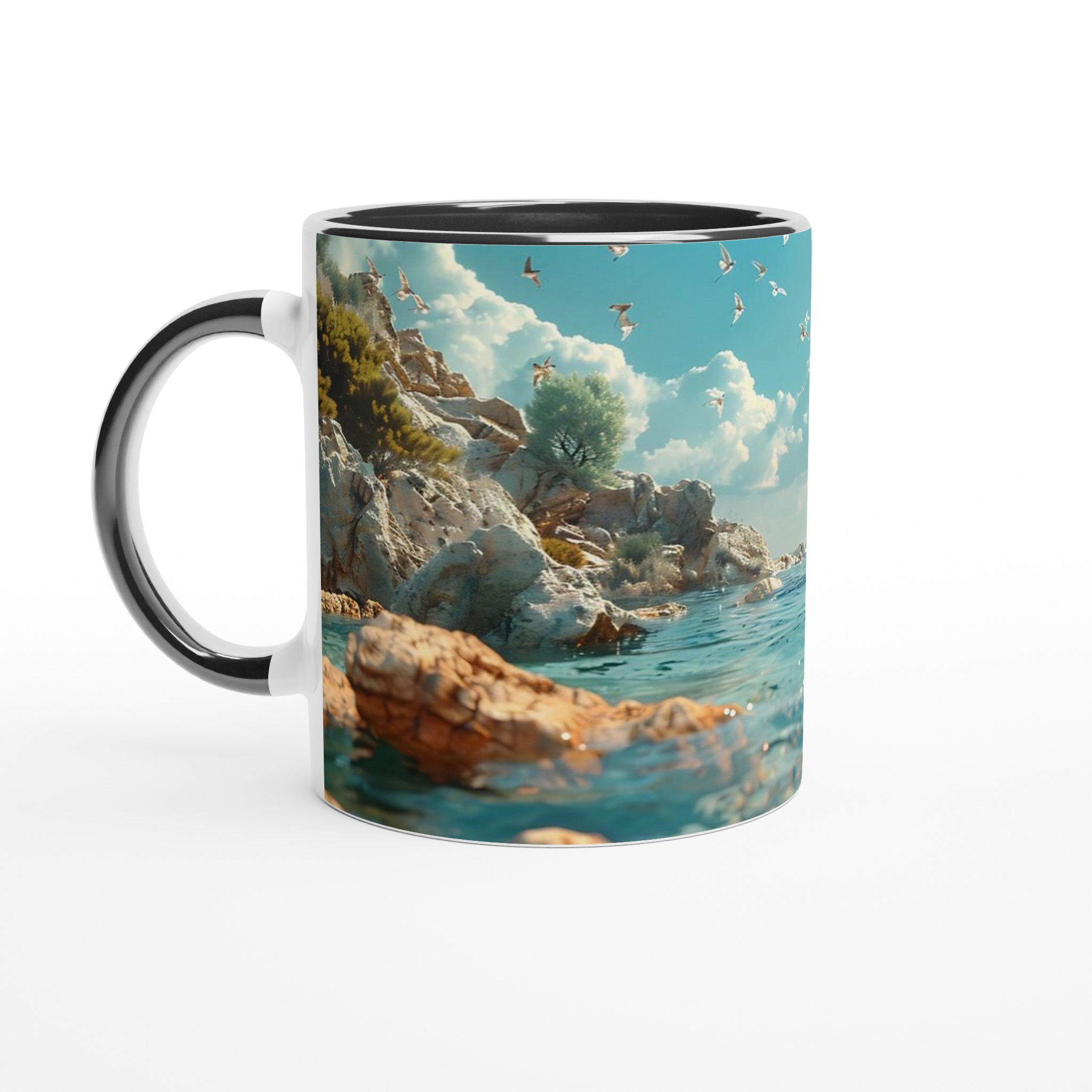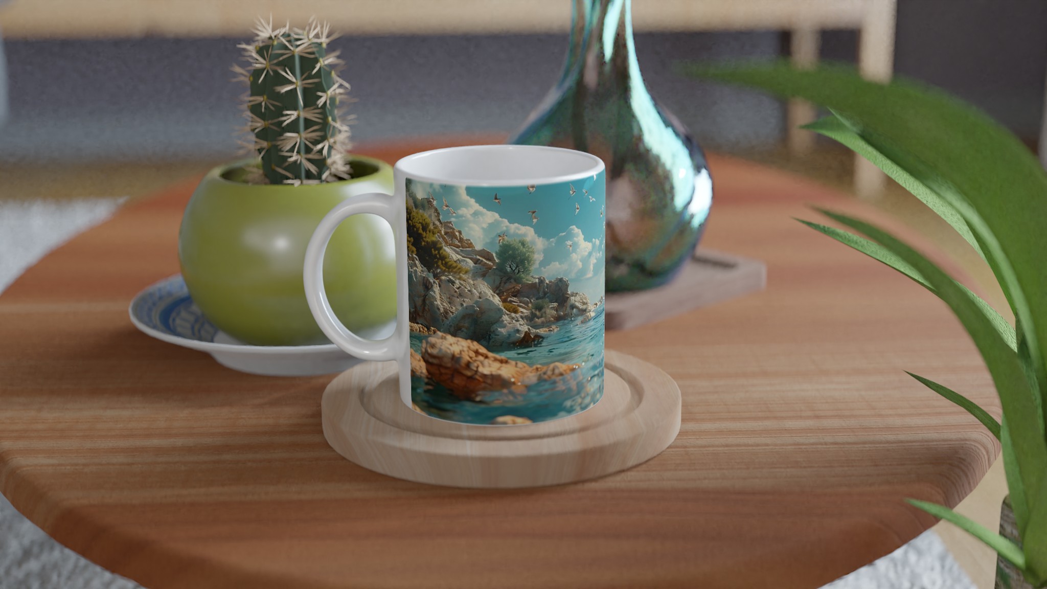 Dröm dig bort till en stillsam kustlinje med varje klunk från denna lugnande keramiska mugg. Föreställ dig den kristallklara horisonten, de flygande fåglarna och den varma glöden från solen som möter det turkosa vattnet – allt fångat i en design som inspirerar till lugn och ro. Den här stilrena muggen blir snabbt en vardagsfavorit, perfekt för morgonkaffet, kvällens varma choklad eller när du bara vill njuta av en kopp te. Den blanka ytan får trycket att framhävas med klara och levande färger, som håller sig fina även efter många turer i mikron och diskmaskinen.