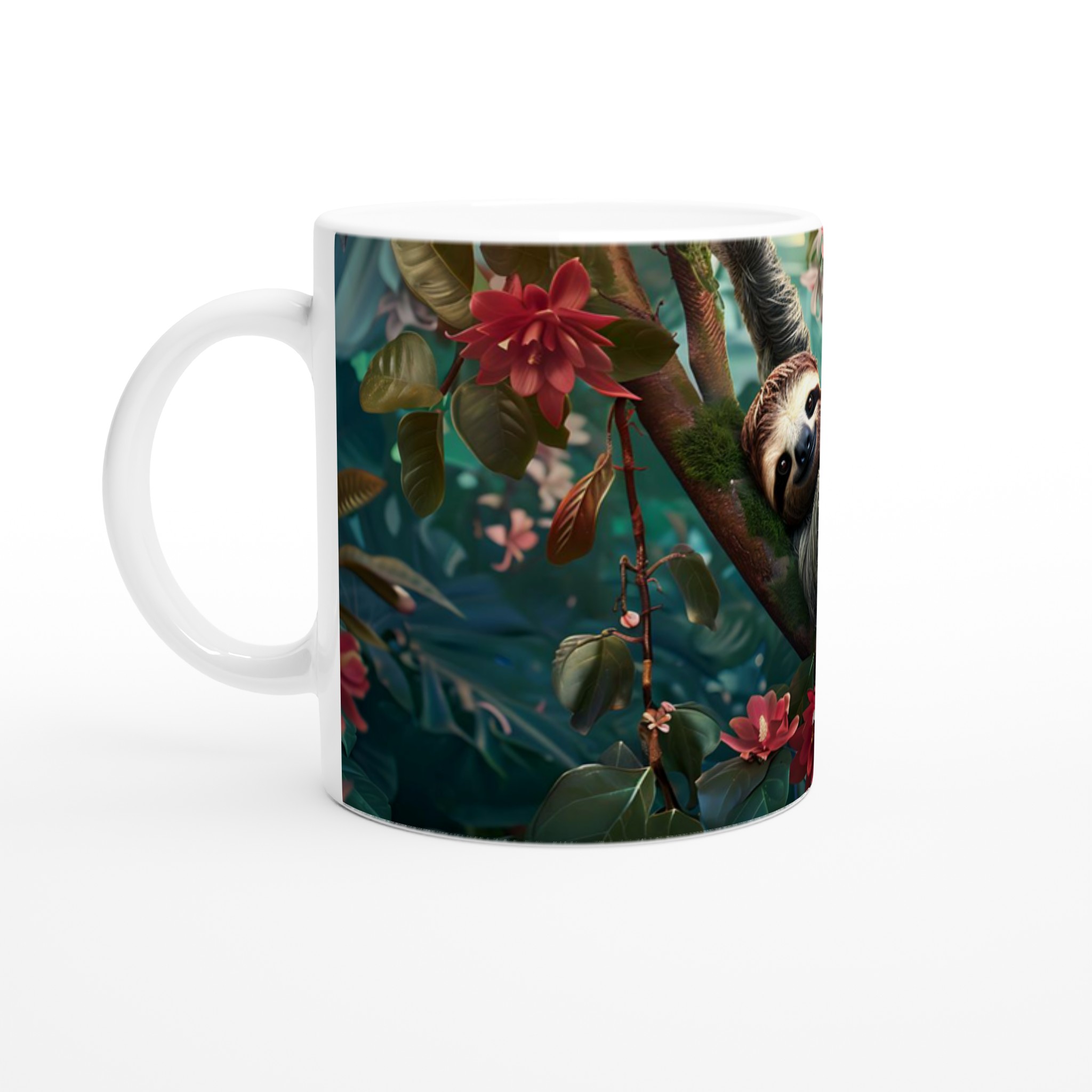 Denna charmiga mugg fångar den lugna skönheten hos en avslappnad sengångare mitt bland frodiga, tropiska blommor i djungelns hjärta. Den blanka vita ytan ger ett skarpt och levande tryck som verkligen sticker ut, oavsett om det är en personlig design, ett roligt citat eller en present till någon du tycker om.