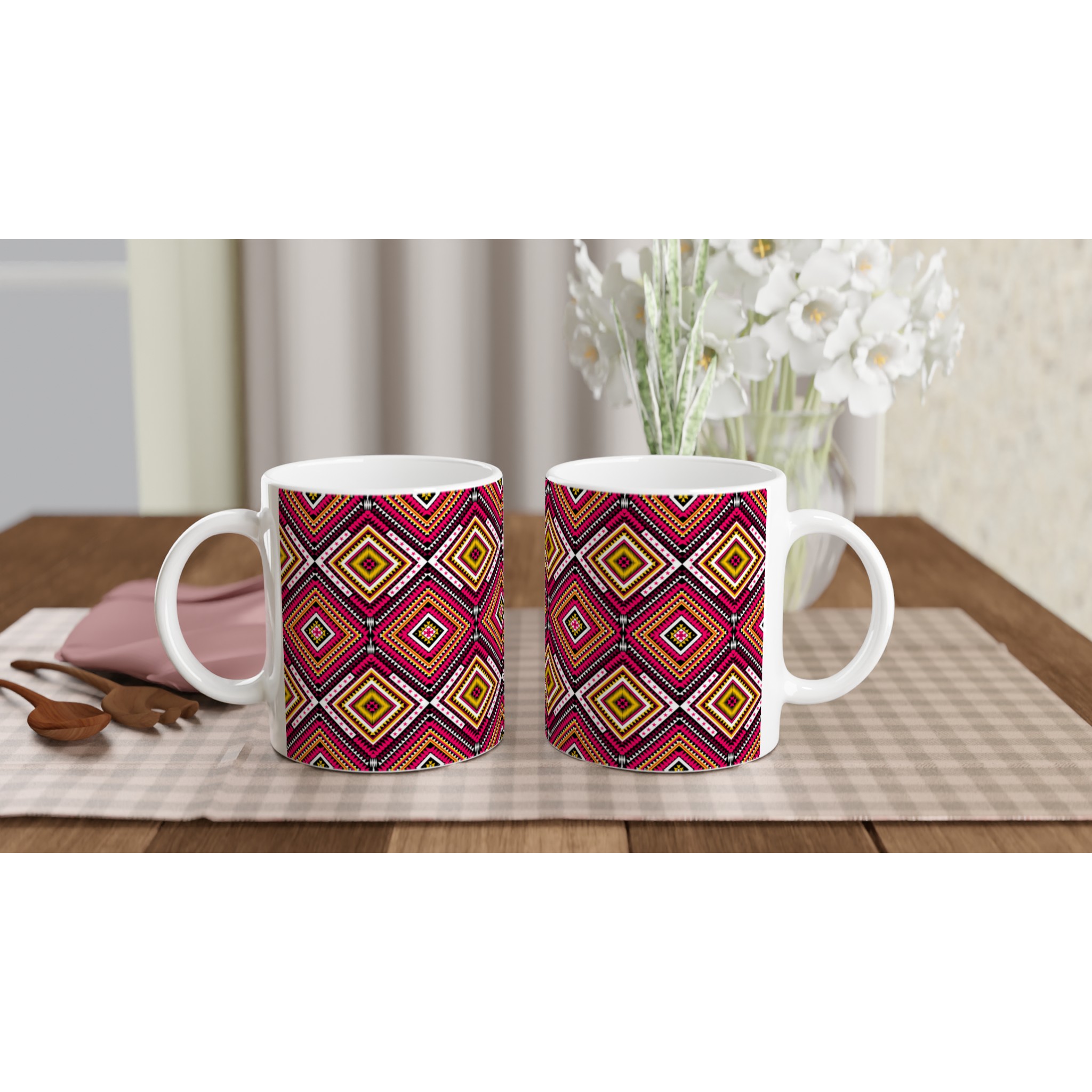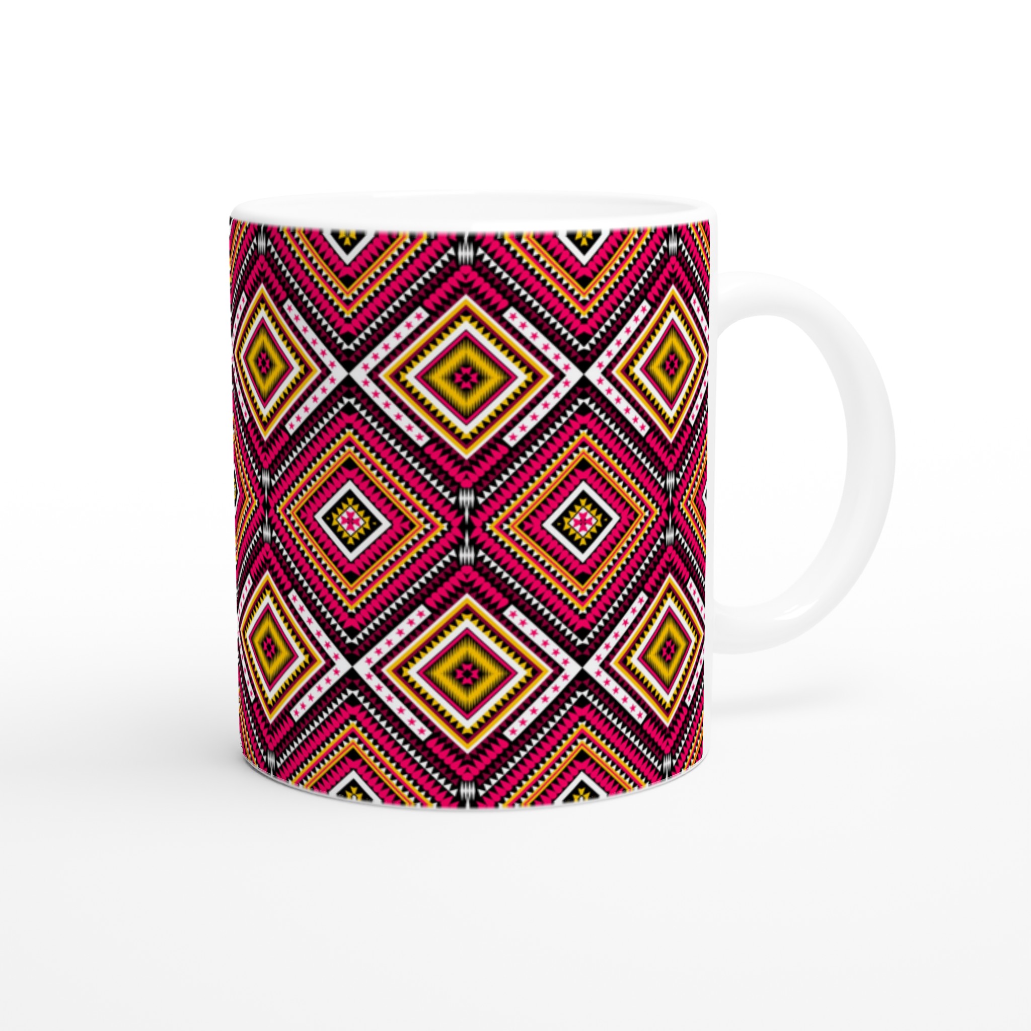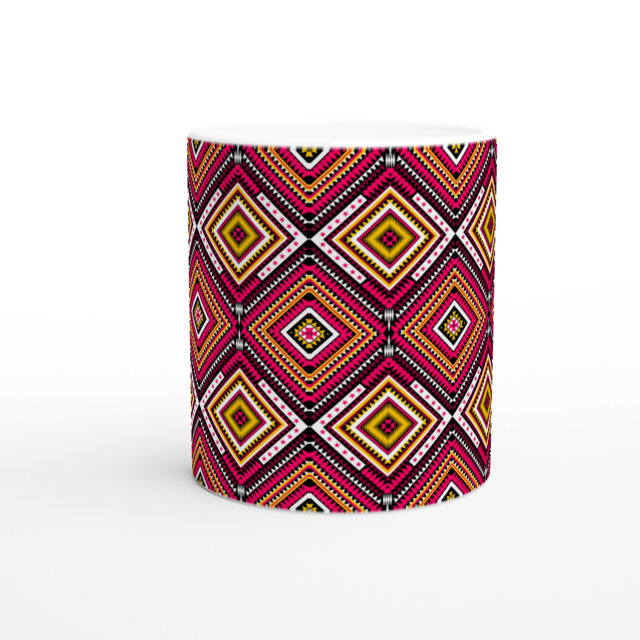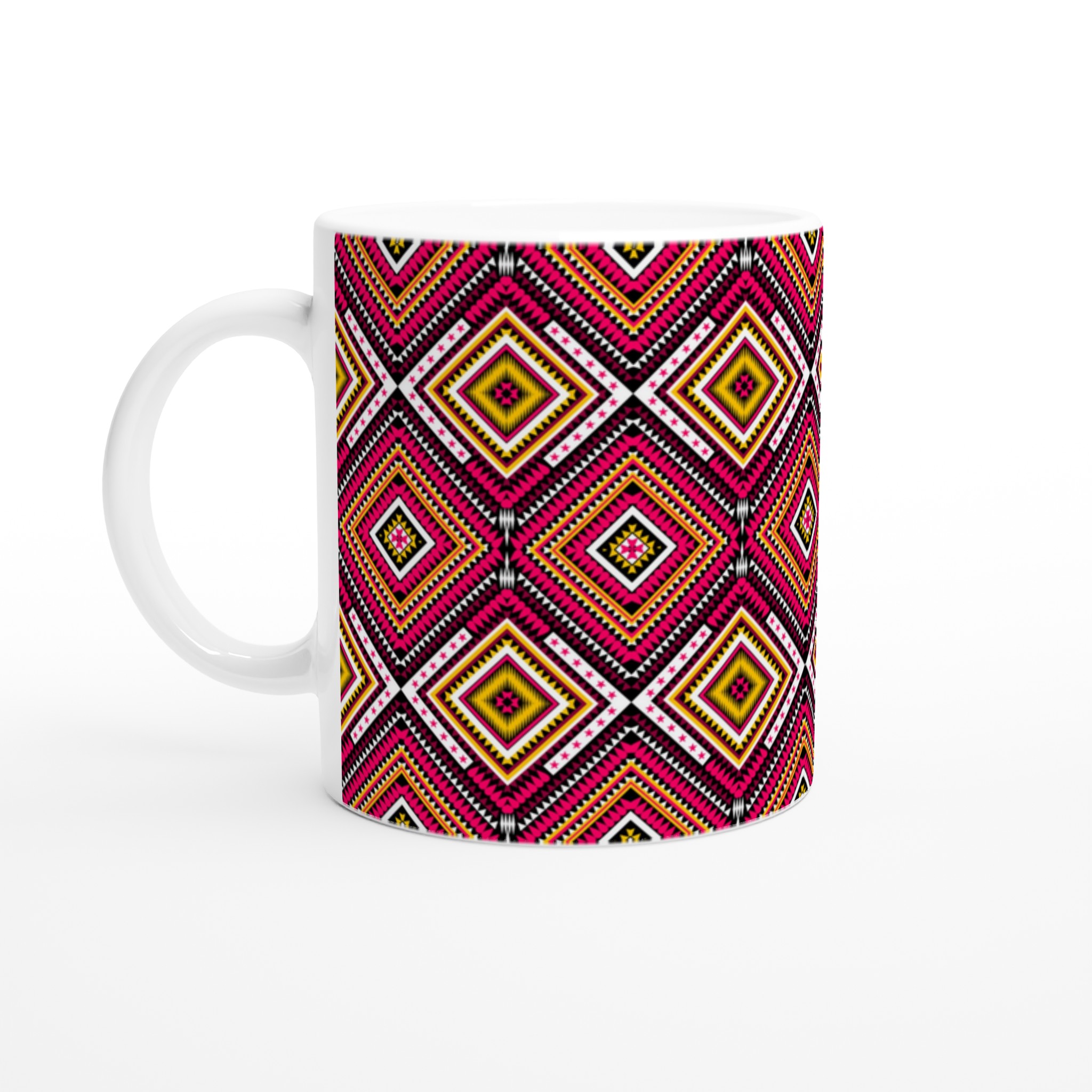 Lys upp din dag med denna iögonfallande keramikmugg som kombinerar traditionell aztec-inspirerad design med en modern, levande färgpalett av djupt rosa, soligt gult och skarpt vitt mot en svart bakgrund. Denna mugg är inte bara en dryckesbehållare, utan ett konstverk som lyfter varje fikastund – från morgonkaffet till kvällens lugna te.