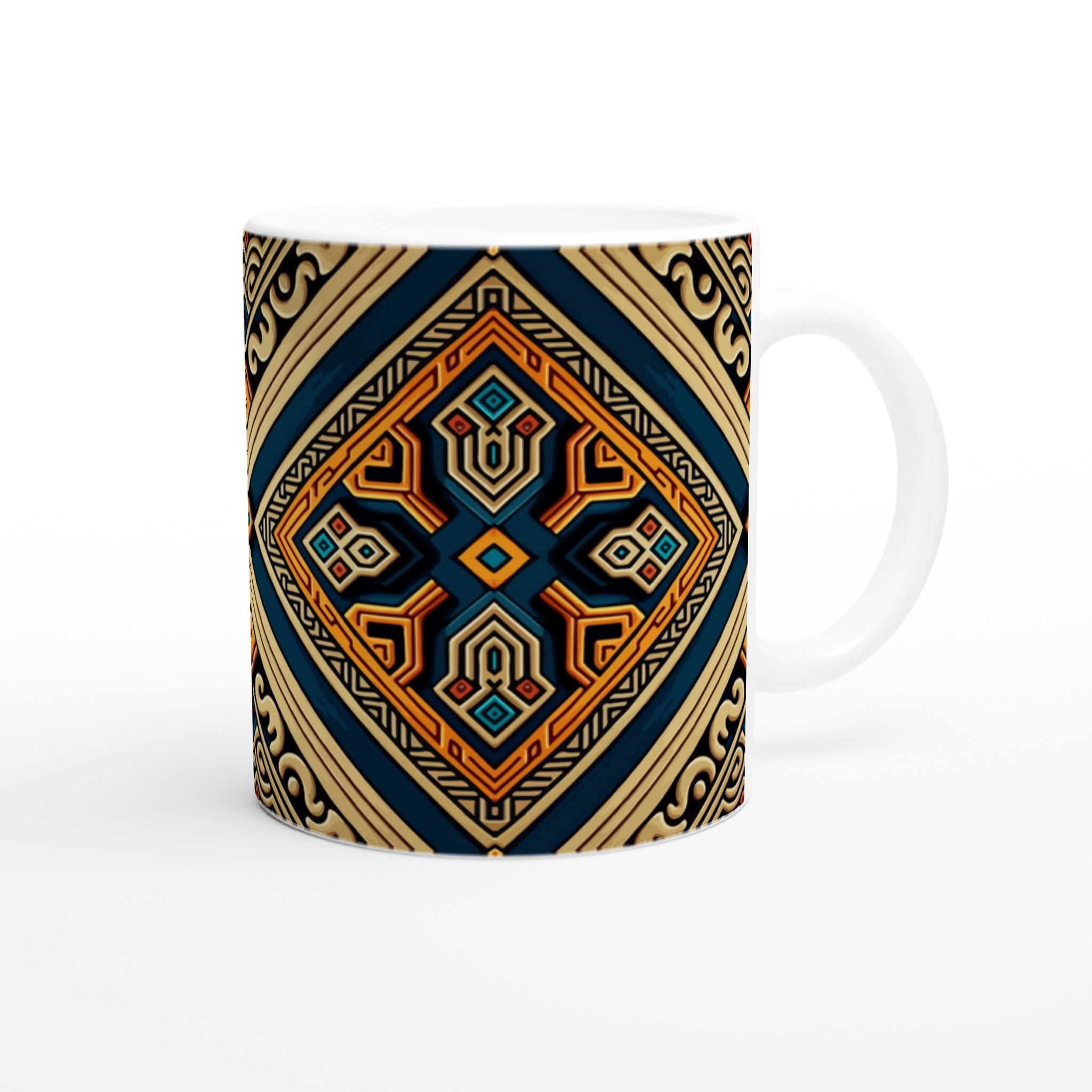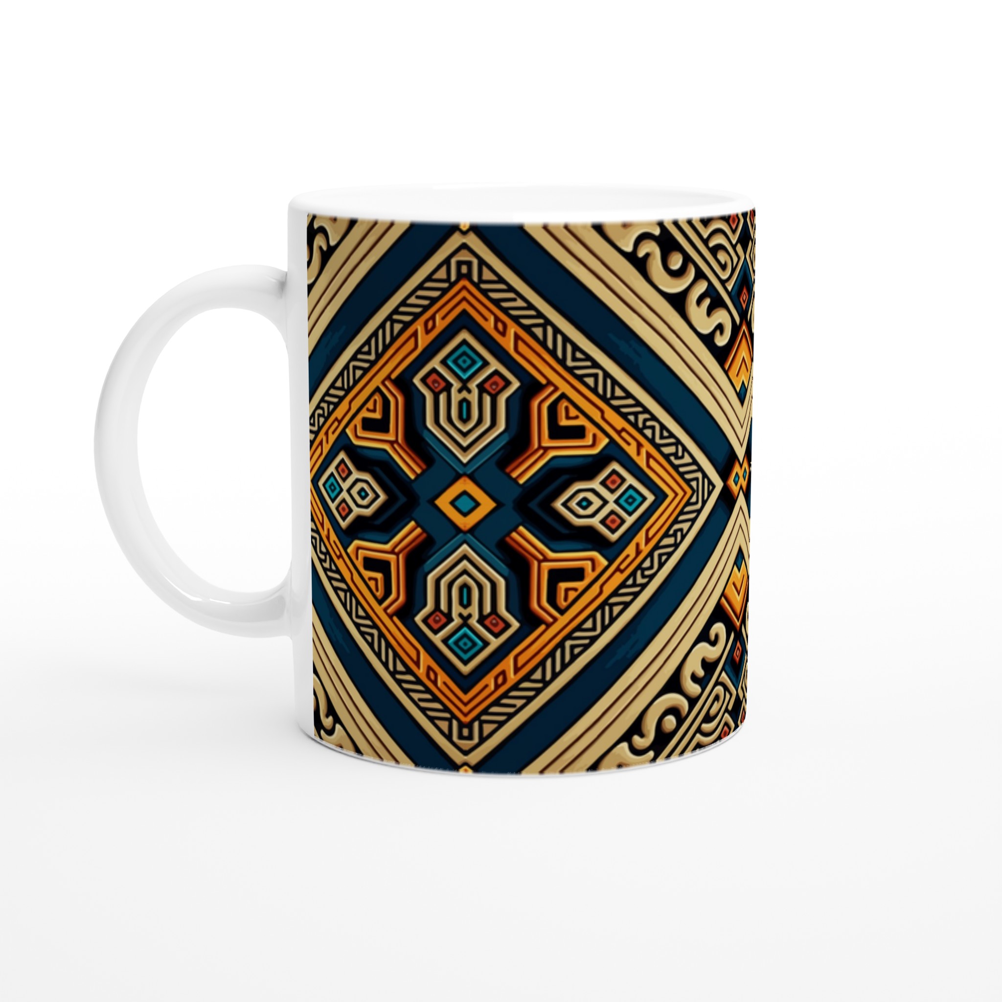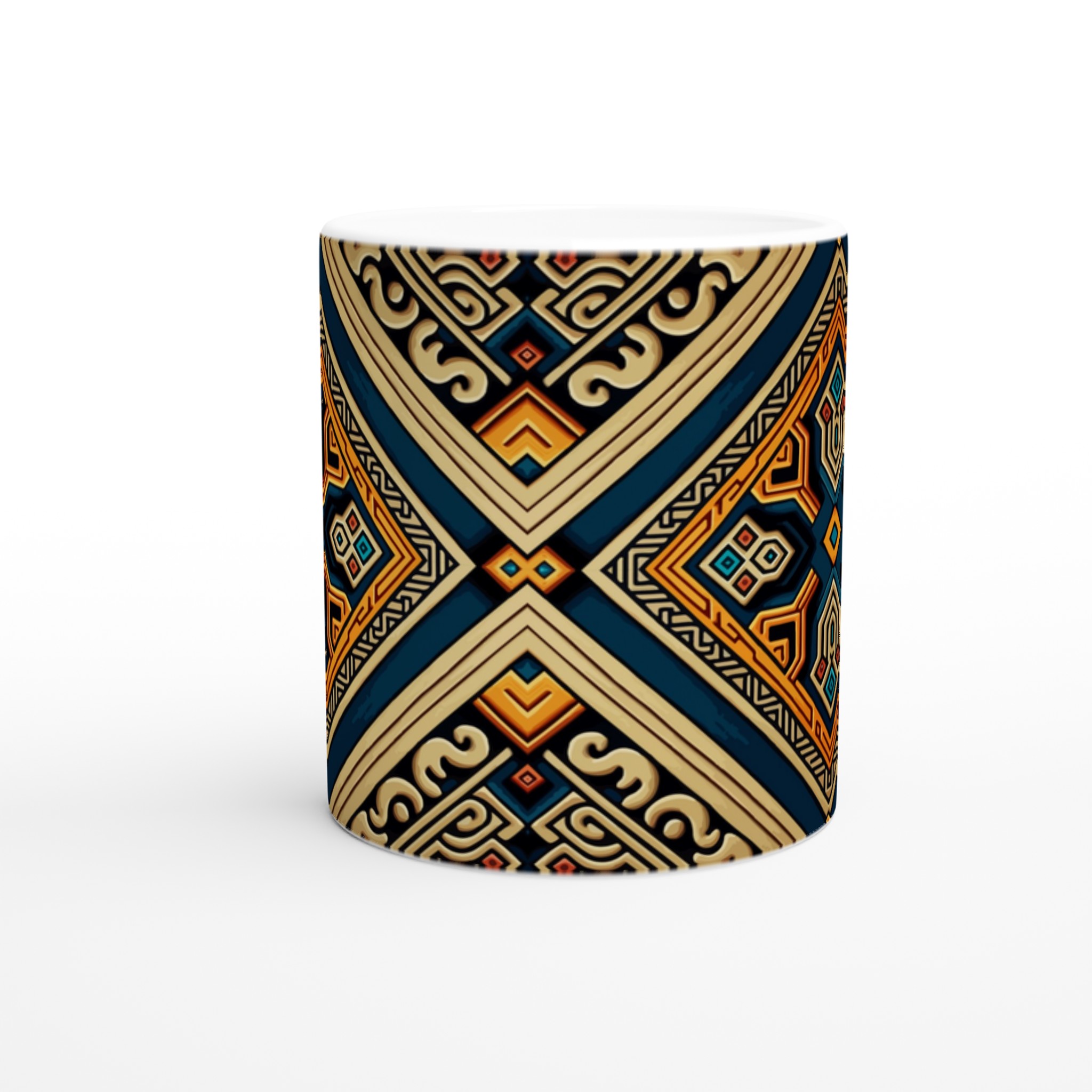 Lyft din fikastund med denna fängslande keramikmugg, prydd med ett intrikat aztec-inspirerat mönster. De djupa blå, gyllene och beige nyanserna, accentuerade med små inslag av turkos och rött, skapar en sofistikerad och tidlös design. Denna mugg är inte bara en njutning för ögat, utan också den perfekta följeslagaren för ditt morgonkaffe, en lugnande kopp te eller en lyxig varm choklad.
