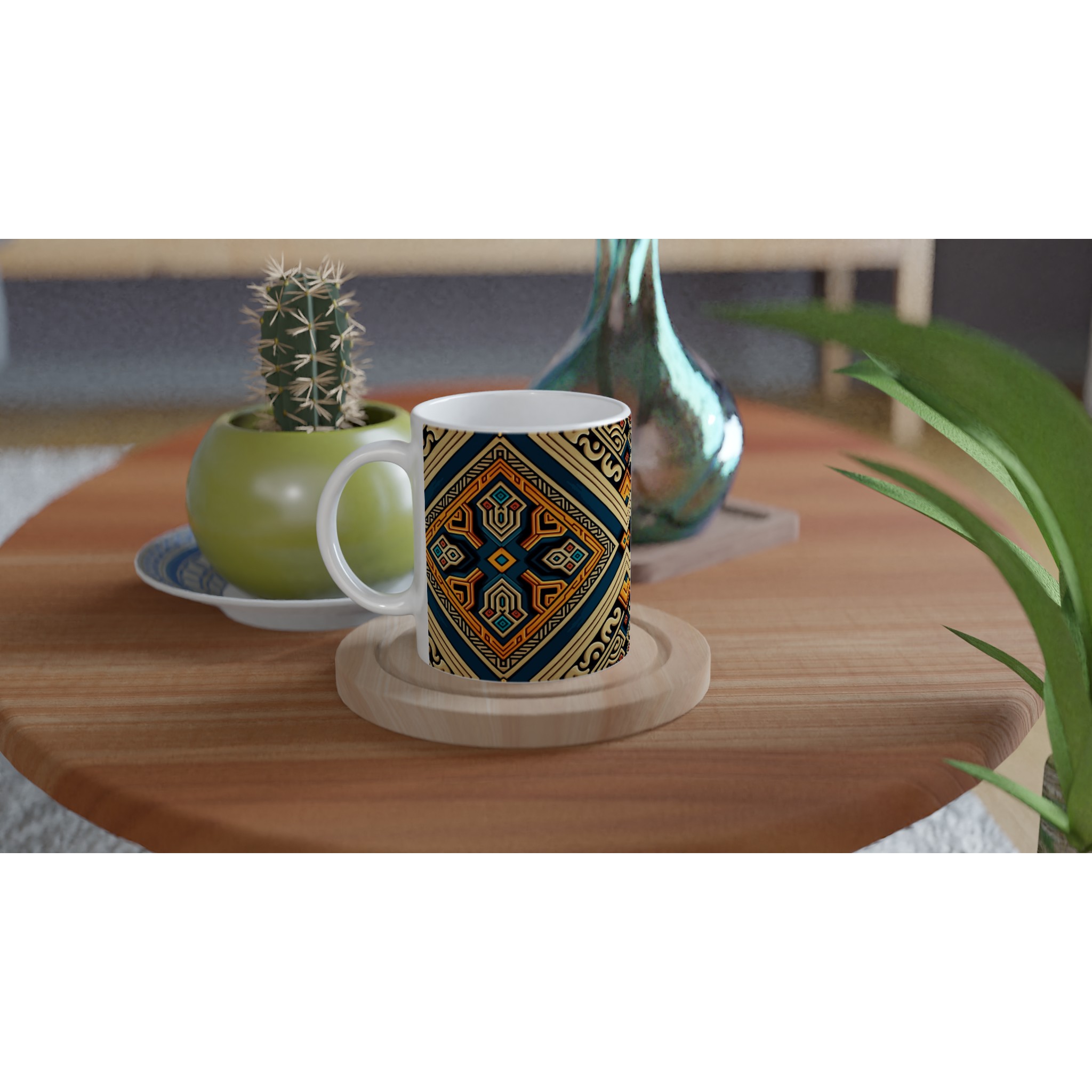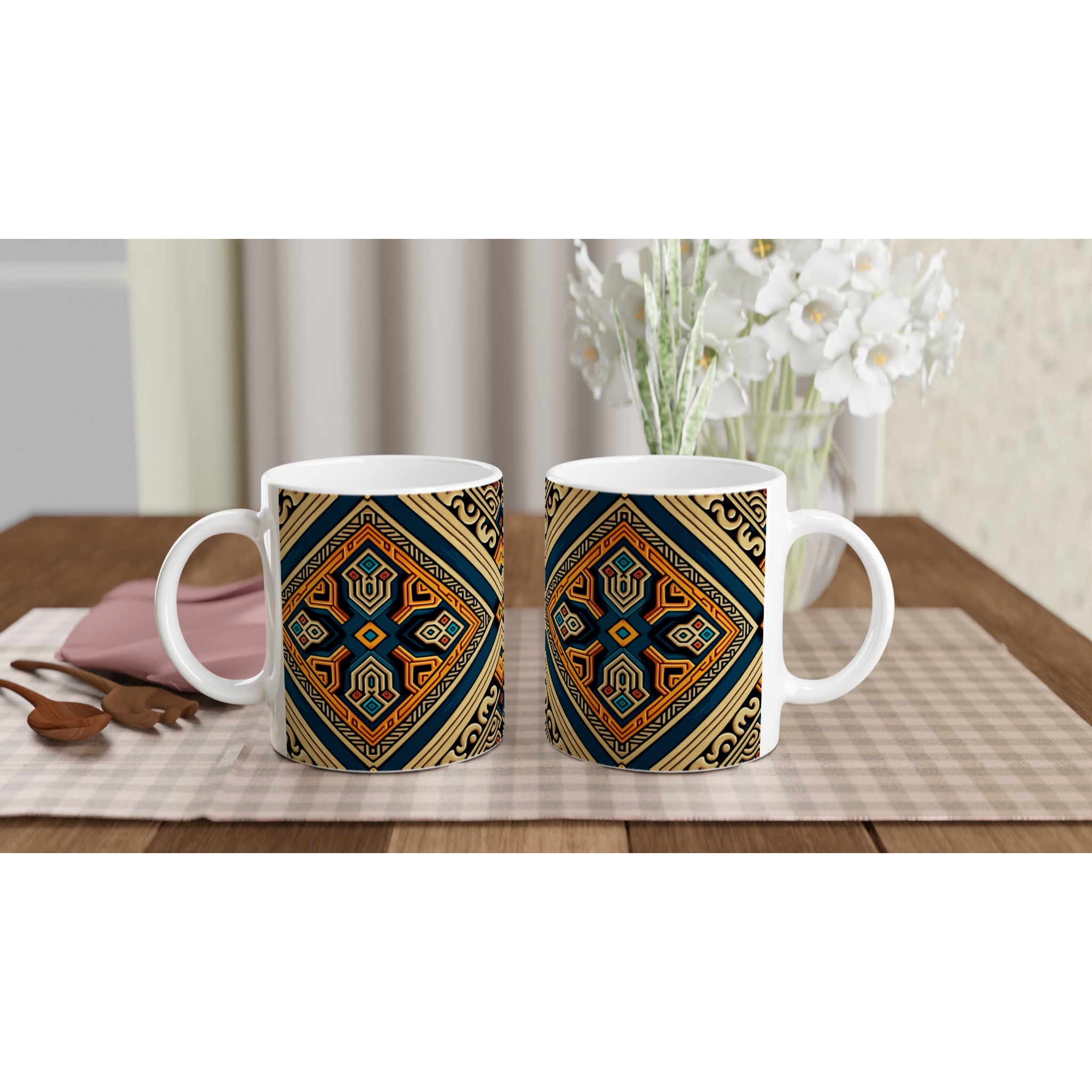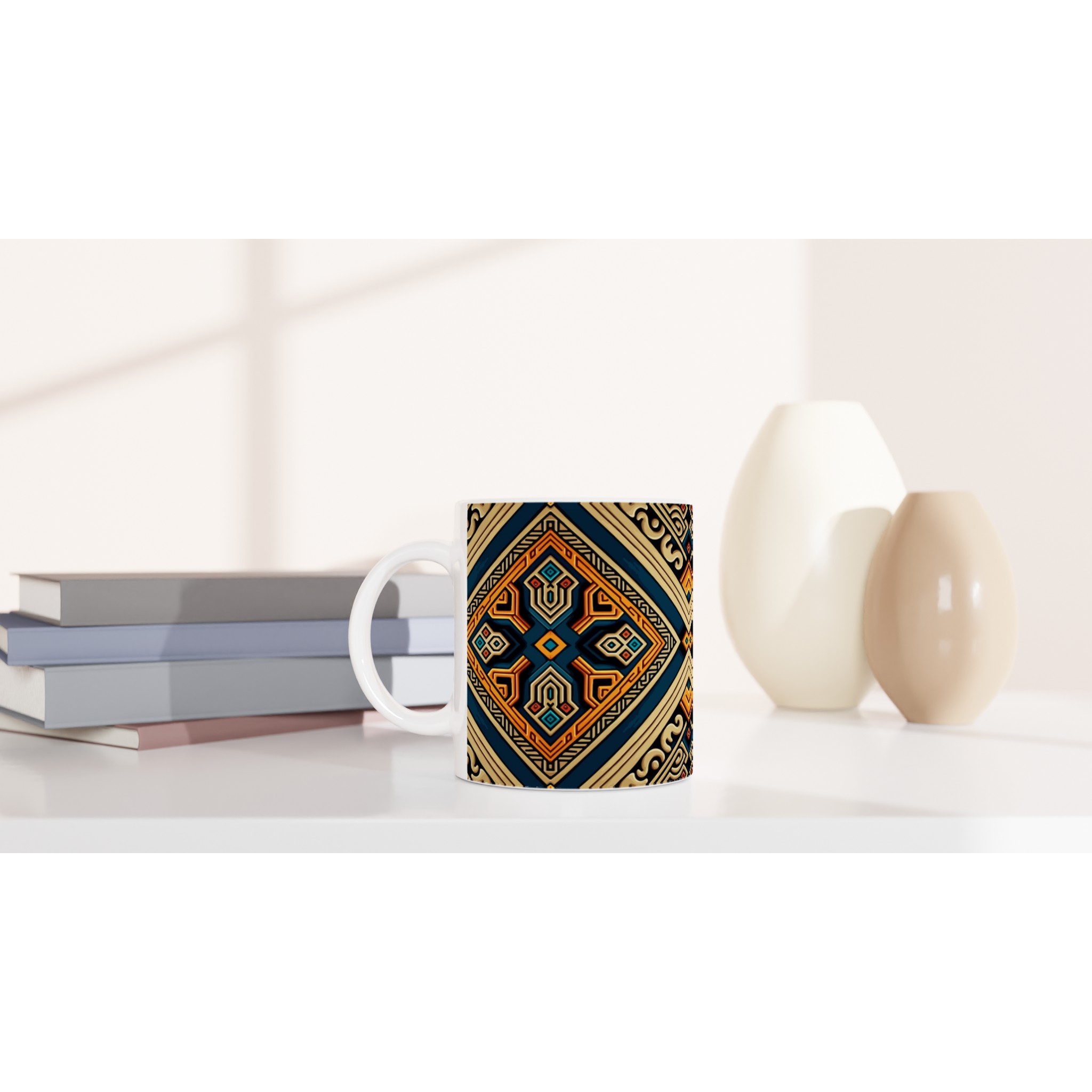 Lyft din fikastund med denna fängslande keramikmugg, prydd med ett intrikat aztec-inspirerat mönster. De djupa blå, gyllene och beige nyanserna, accentuerade med små inslag av turkos och rött, skapar en sofistikerad och tidlös design. Denna mugg är inte bara en njutning för ögat, utan också den perfekta följeslagaren för ditt morgonkaffe, en lugnande kopp te eller en lyxig varm choklad.