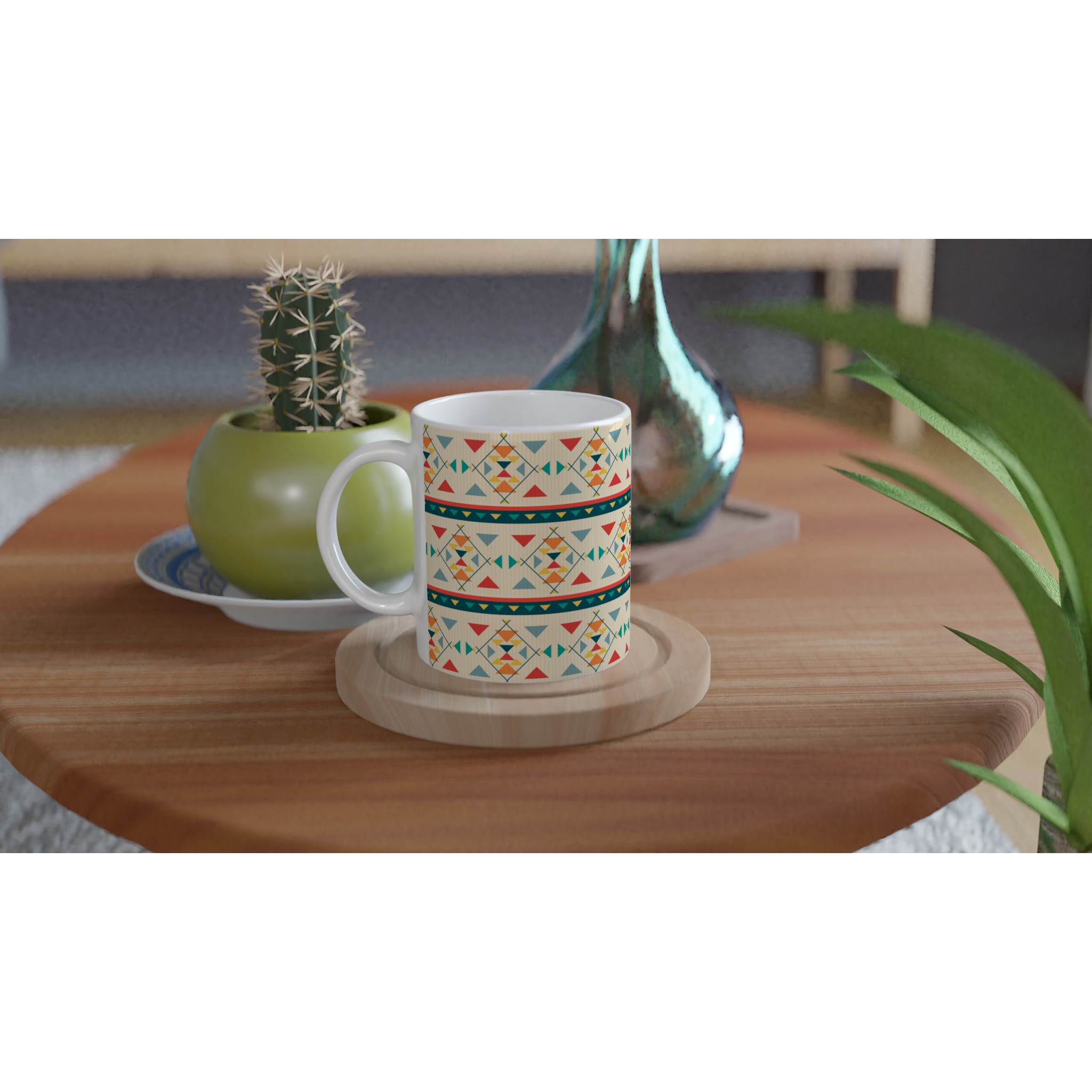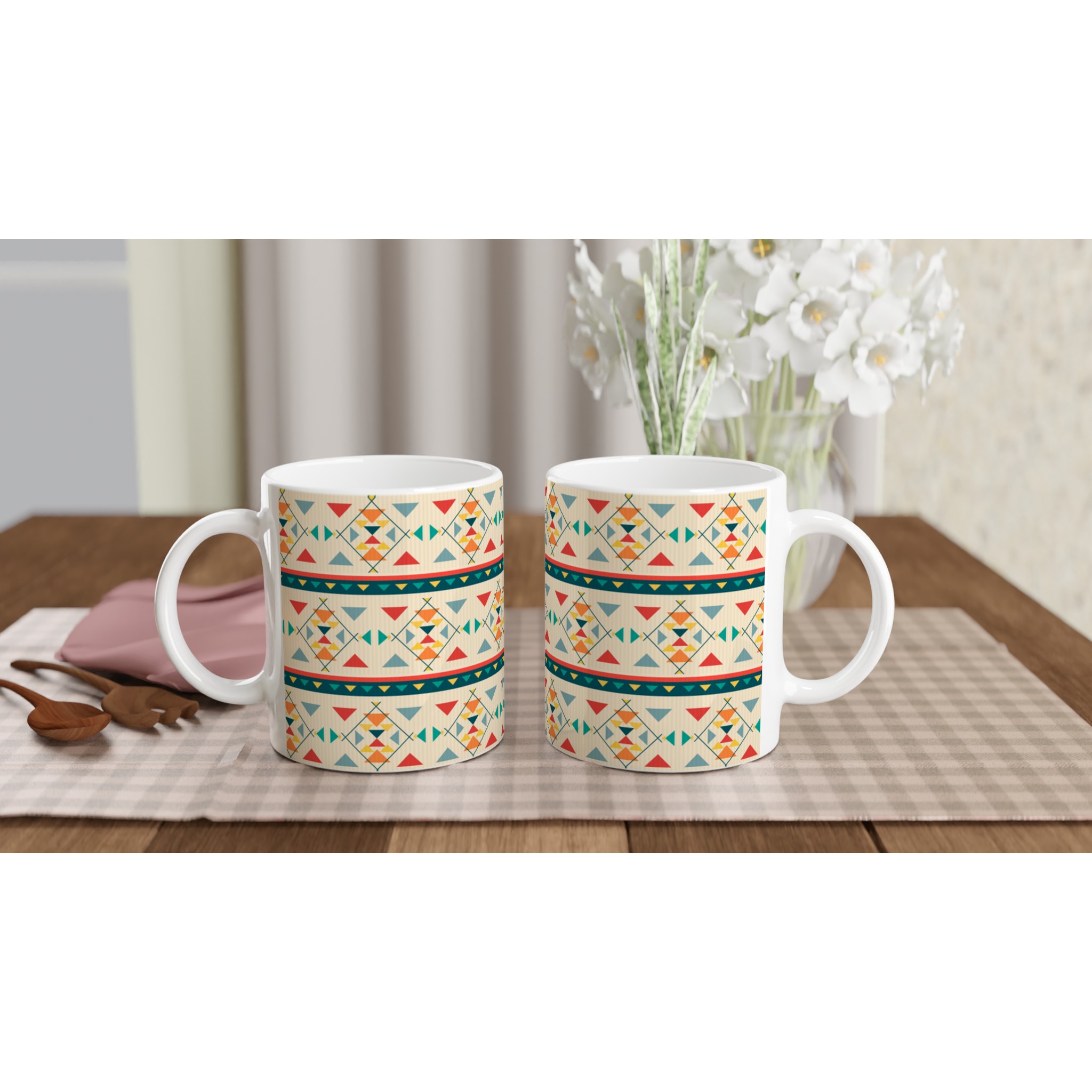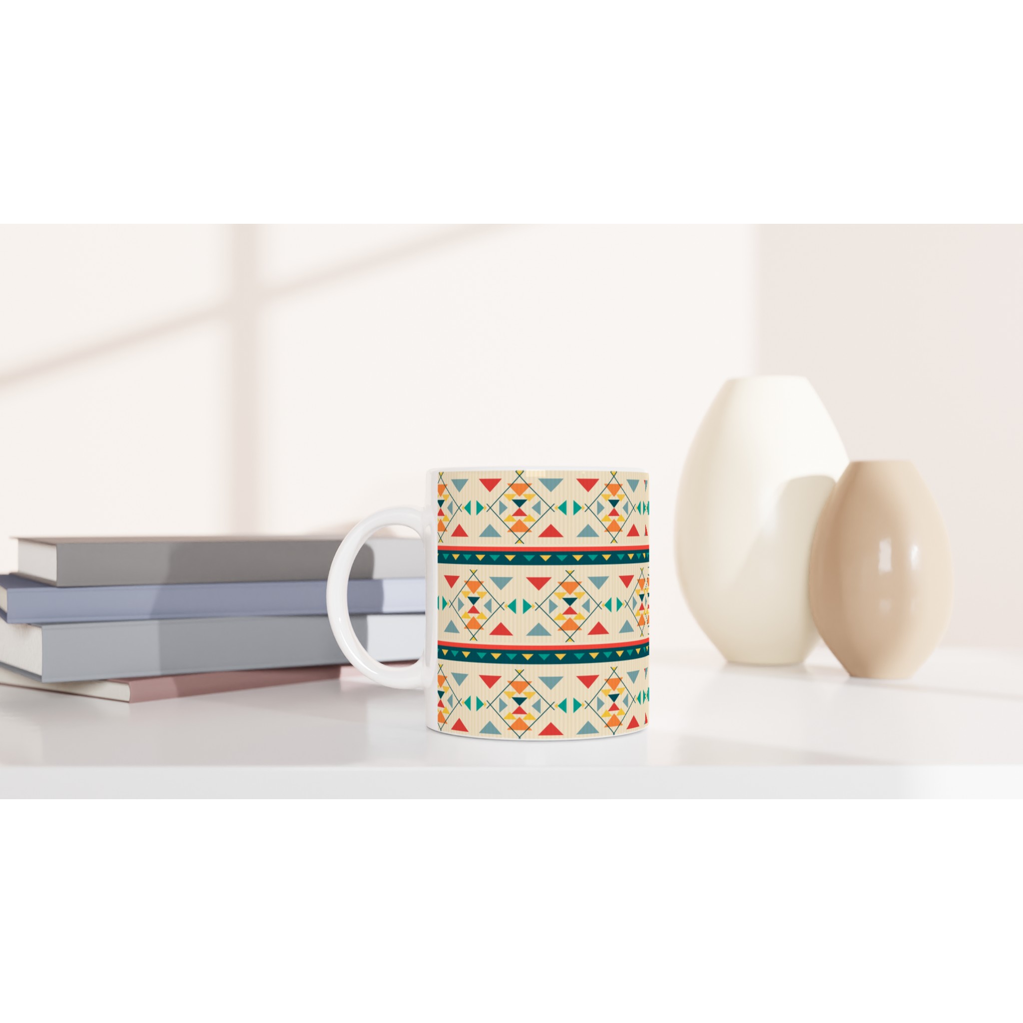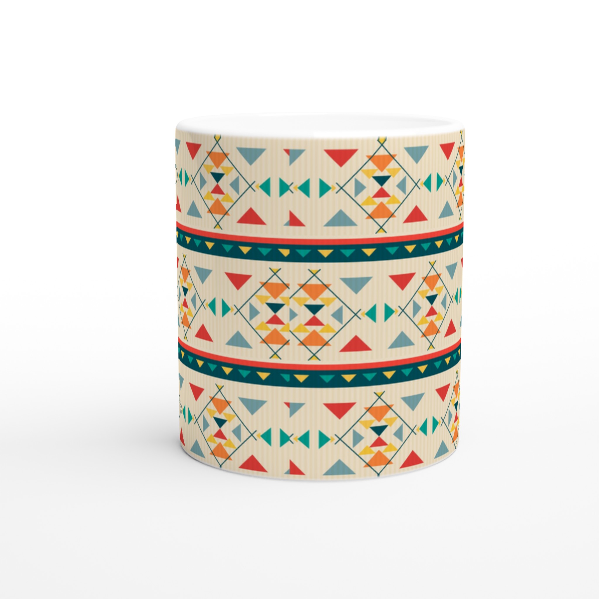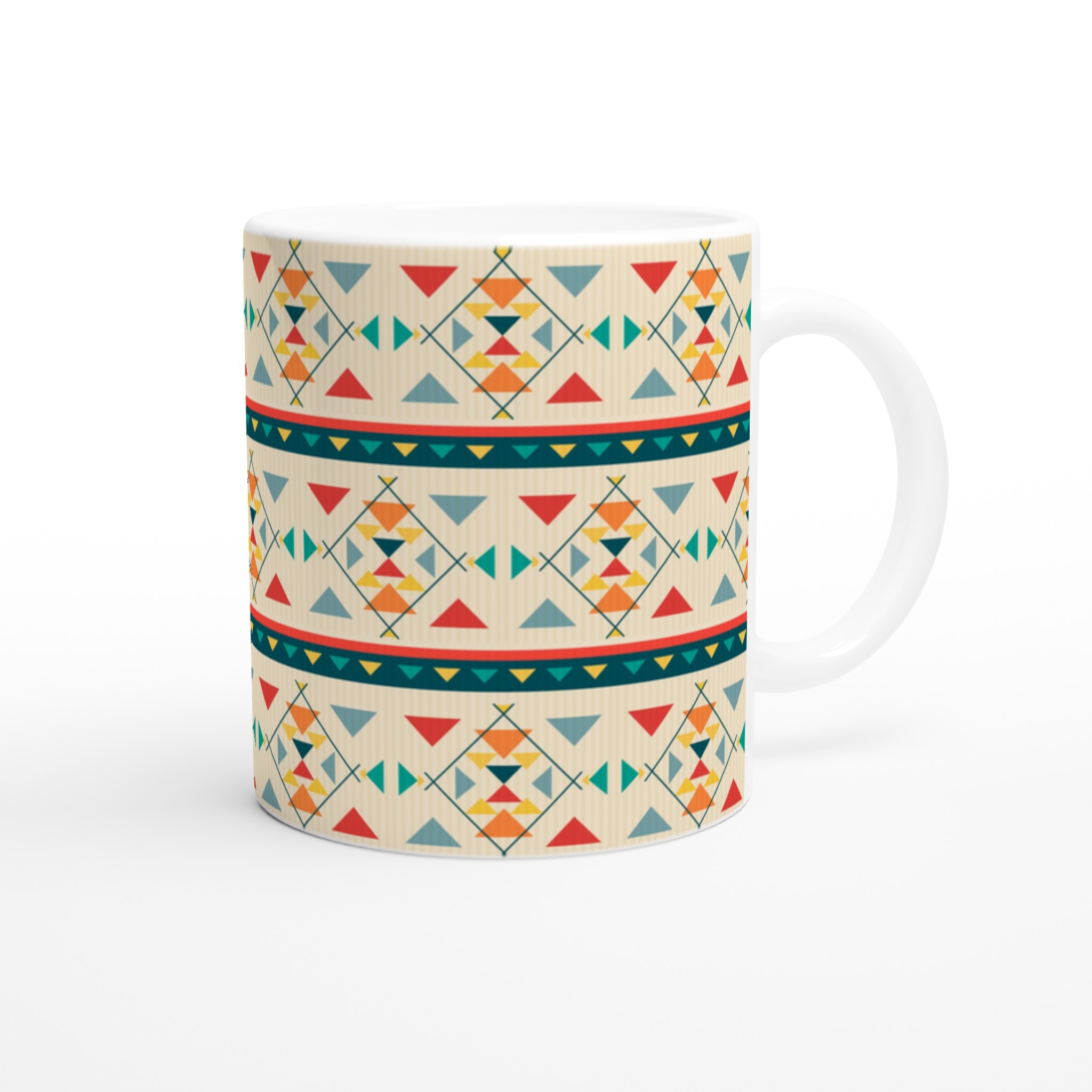 Väck dina sinnen med vår Aztec-inspirerade keramikmugg! Denna mugg är prydd med ett livfullt geometriskt mönster i varma toner av rött, orange, gult och turkos, satt mot en lugnande beige bakgrund. Mönstret skapar en känsla av äventyr och kulturell rikedom, perfekt för dig som älskar unika och färgstarka detaljer i vardagen. Varje morgonkaffe eller eftermiddagste blir en stund av inspiration och glädje.