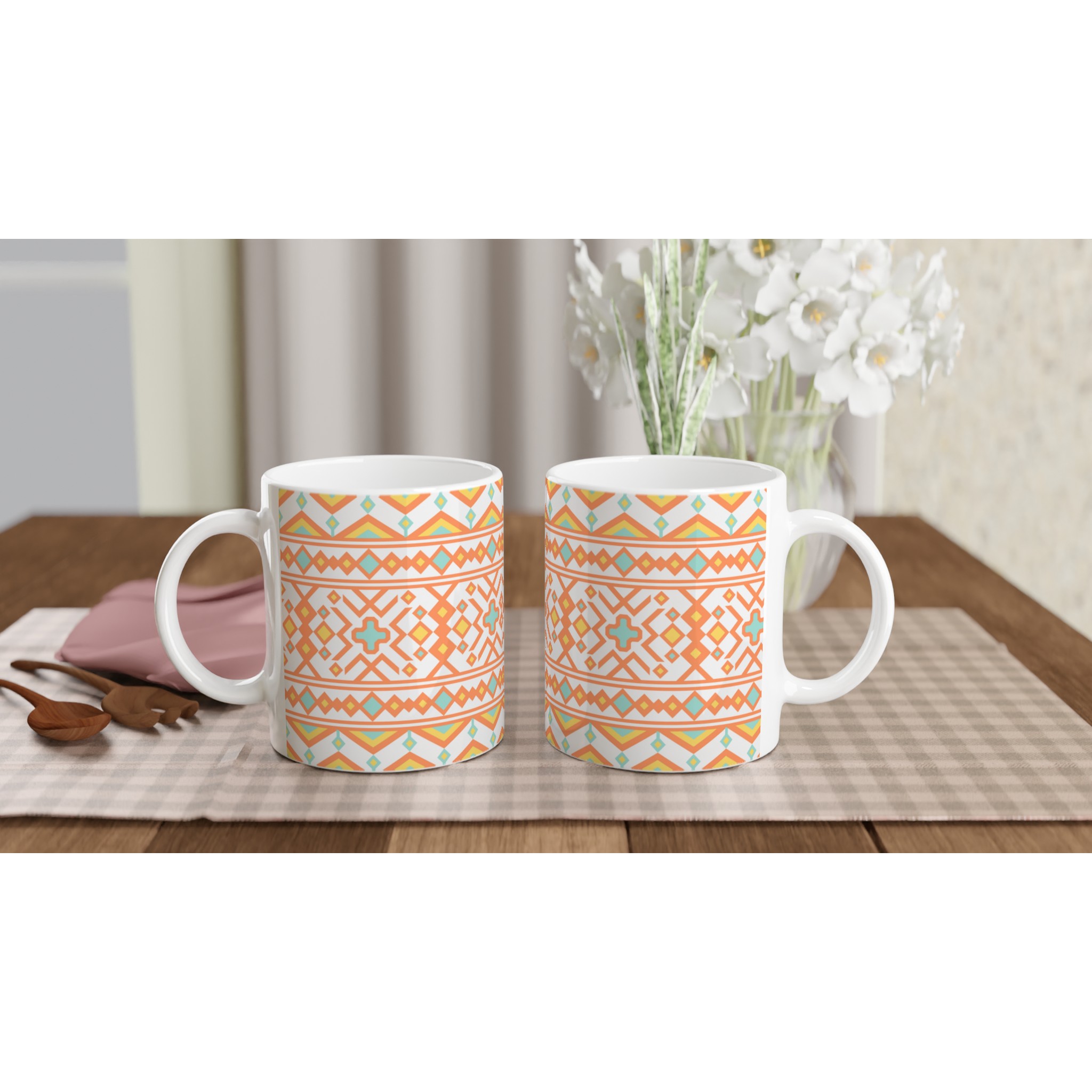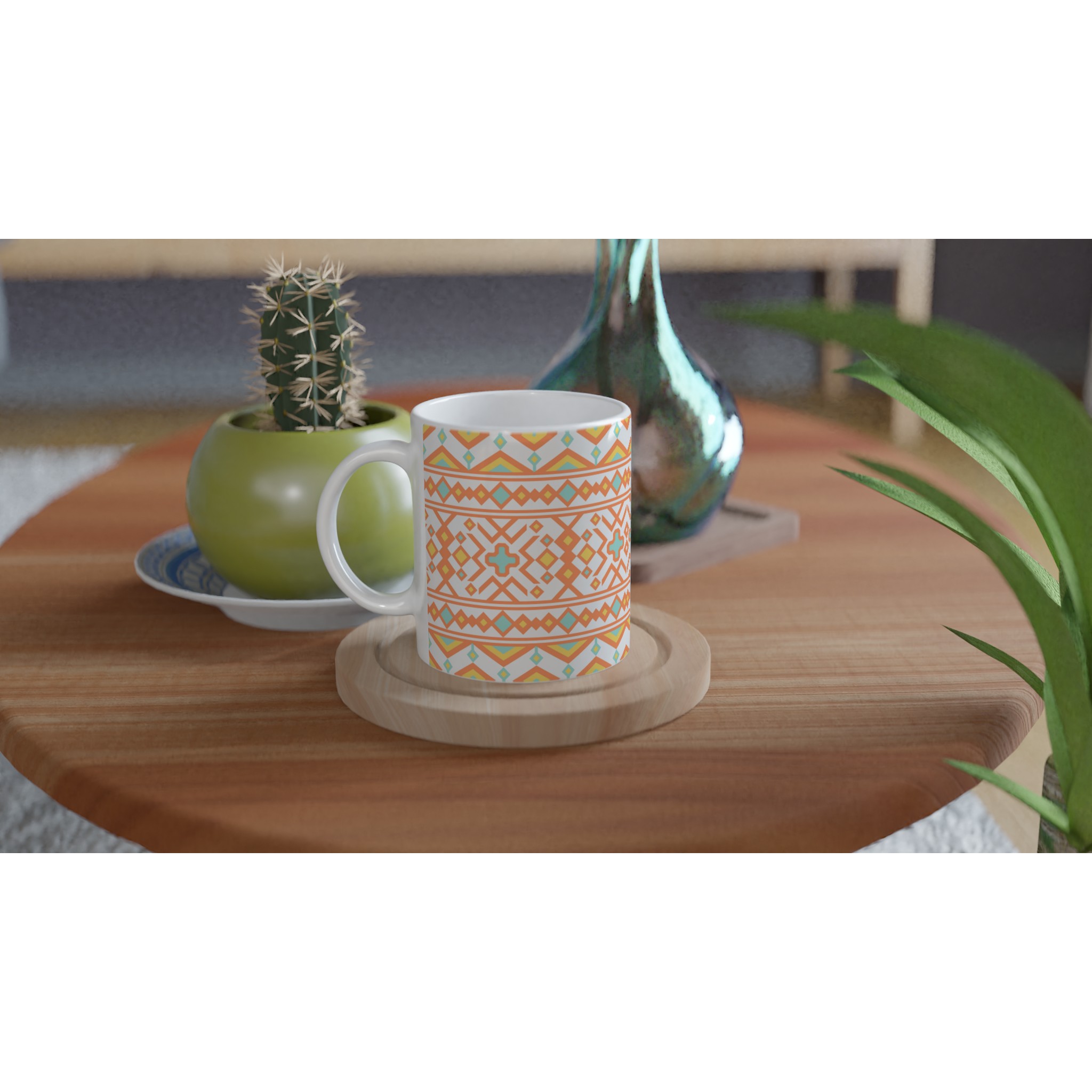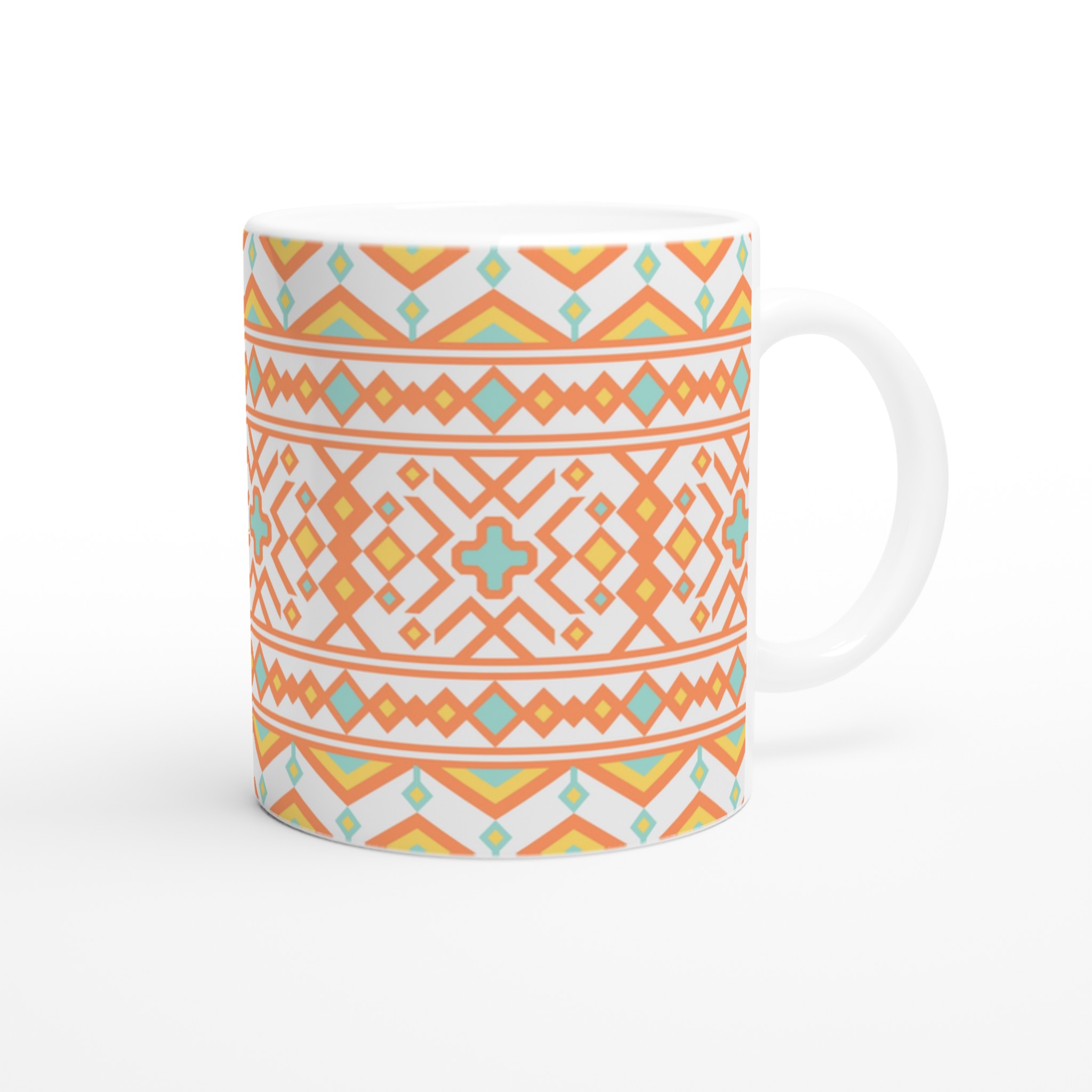Lyft din fikastund med vår förtrollande keramikmugg, prydd med ett livfullt aztec-inspirerat mönster i lugna pastellfärger av persika, turkos och gult. Denna stilrena och vackra keramikmugg är perfekt för alla dagens stunder – morgonkaffet, en värmande kopp te eller en härlig varm choklad. Det unika designen ger en känsla av lugn och inspiration, vilket gör varje klunk till en liten paus för själen.