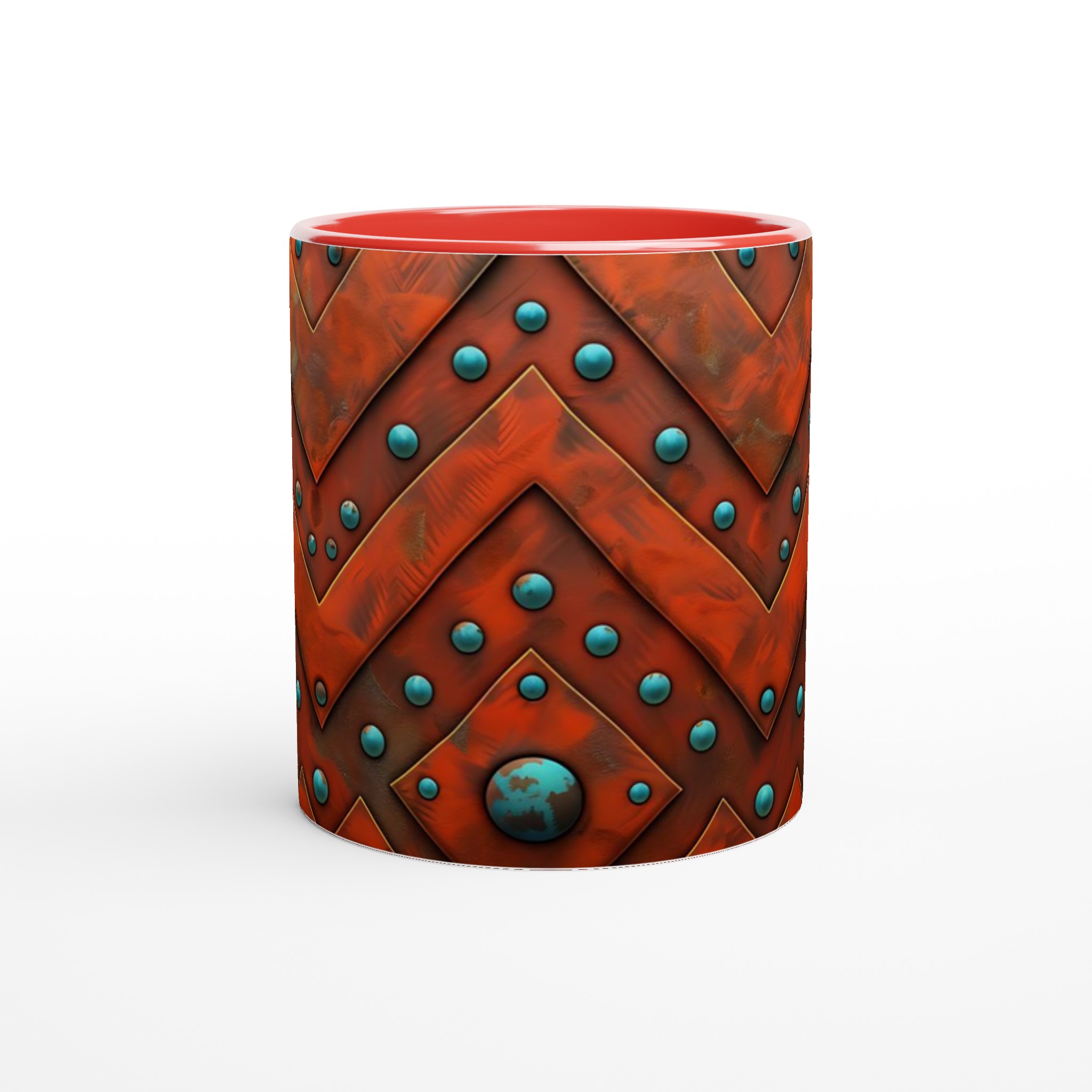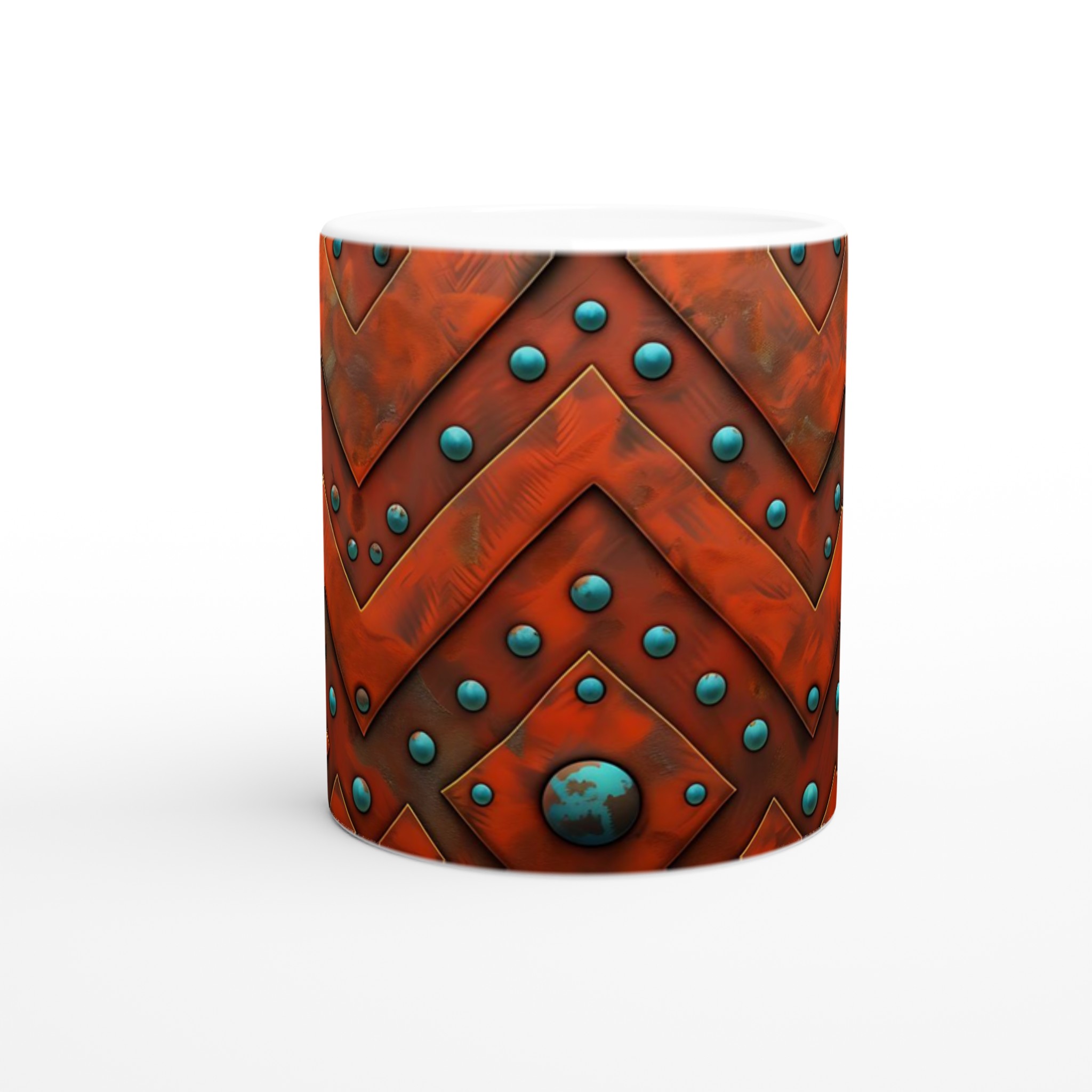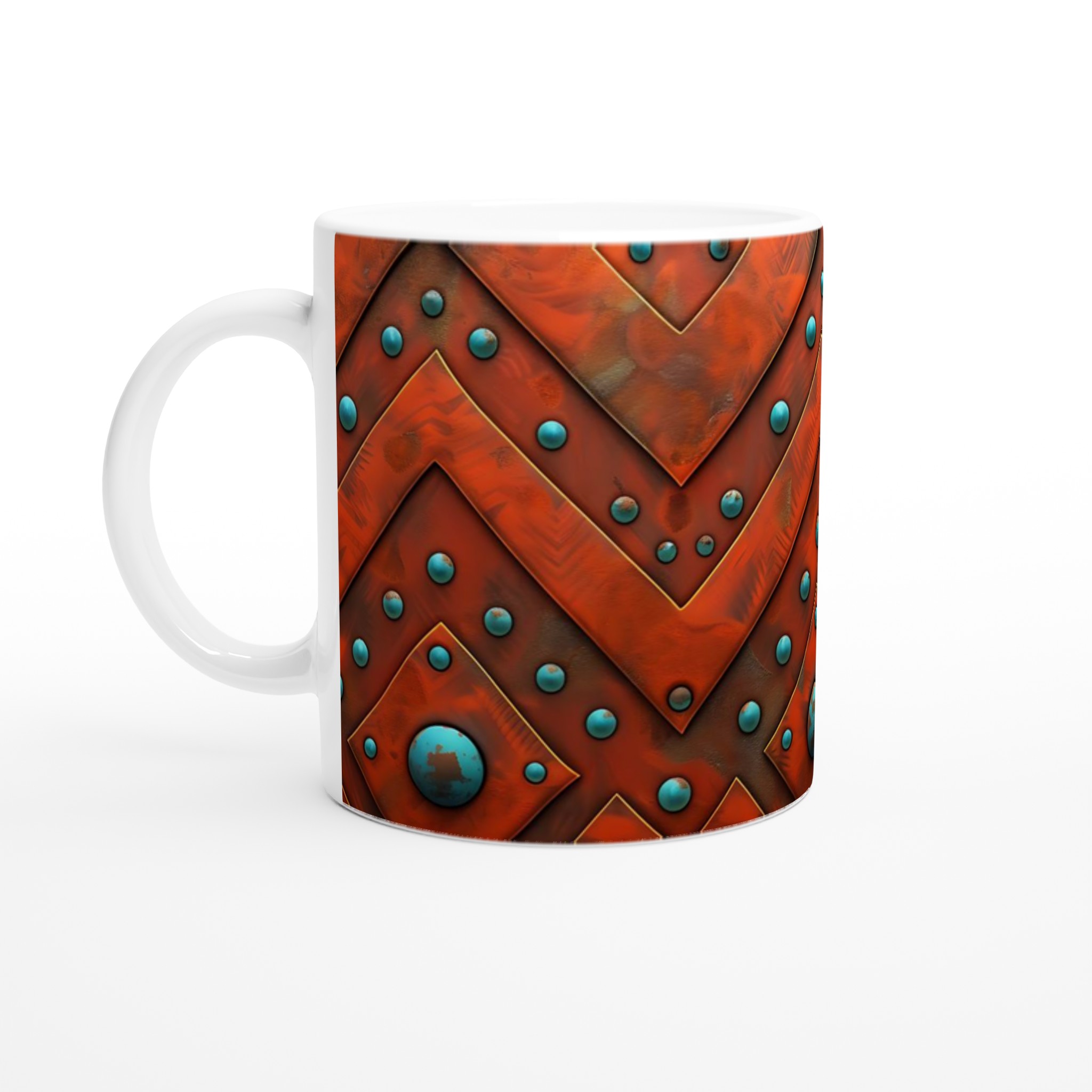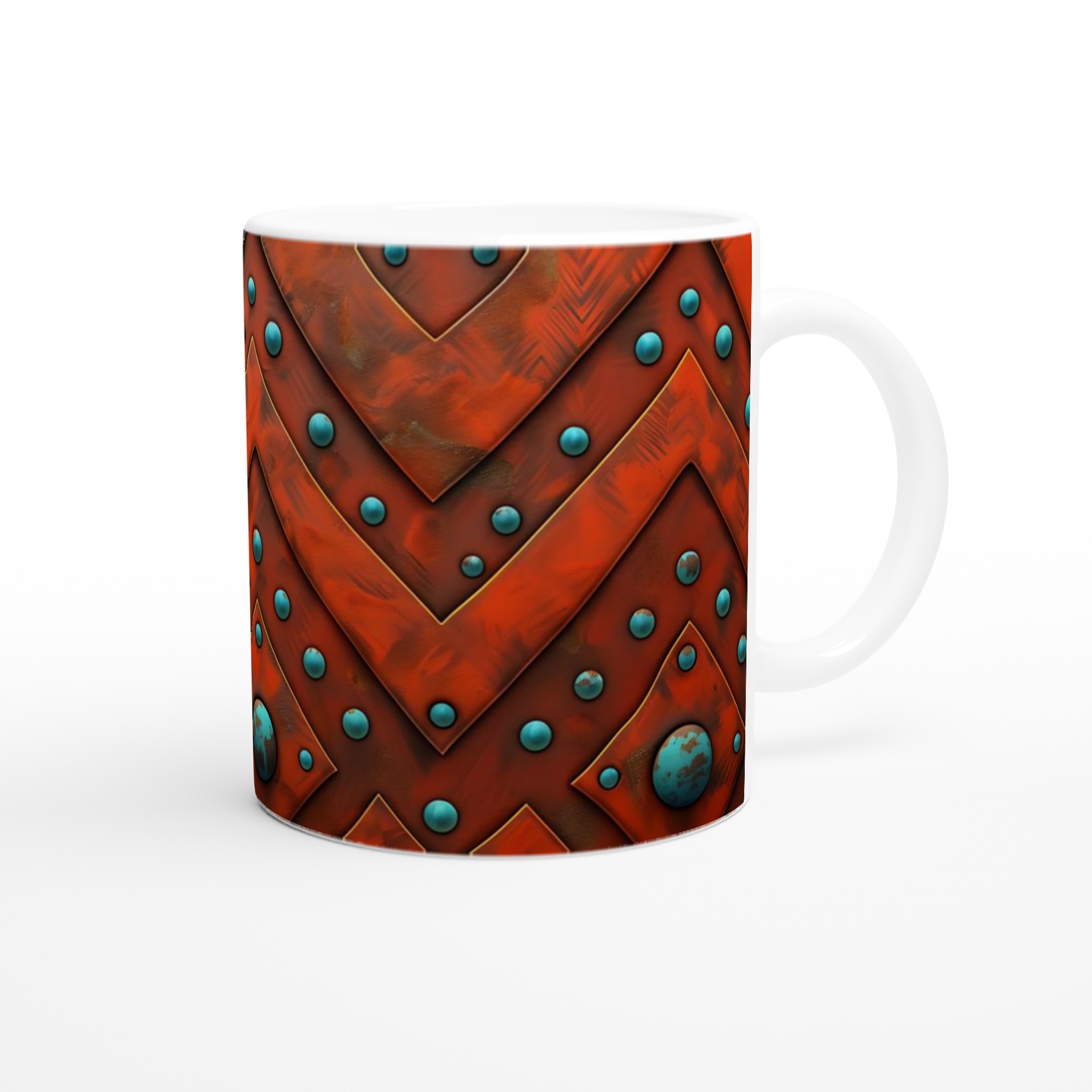 Väck dina sinnen med denna unika keramikmugg, inspirerad av den rika, jordnära skönheten i aztekiska mönster. Den rustika orange nyansen möter livfulla turkosblå pärlor i ett intrikat chevron-mönster som för tankarna till antika hantverk och tidlösa skatter. Denna mugg är inte bara en behållare för din dryck, utan en berättelse i sig – perfekt för att förgylla morgonkaffet, en värmande kopp te eller en härlig varm choklad.