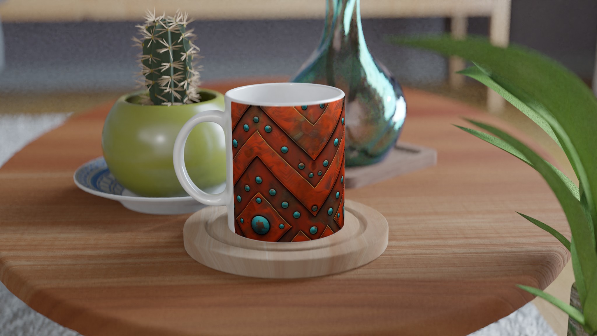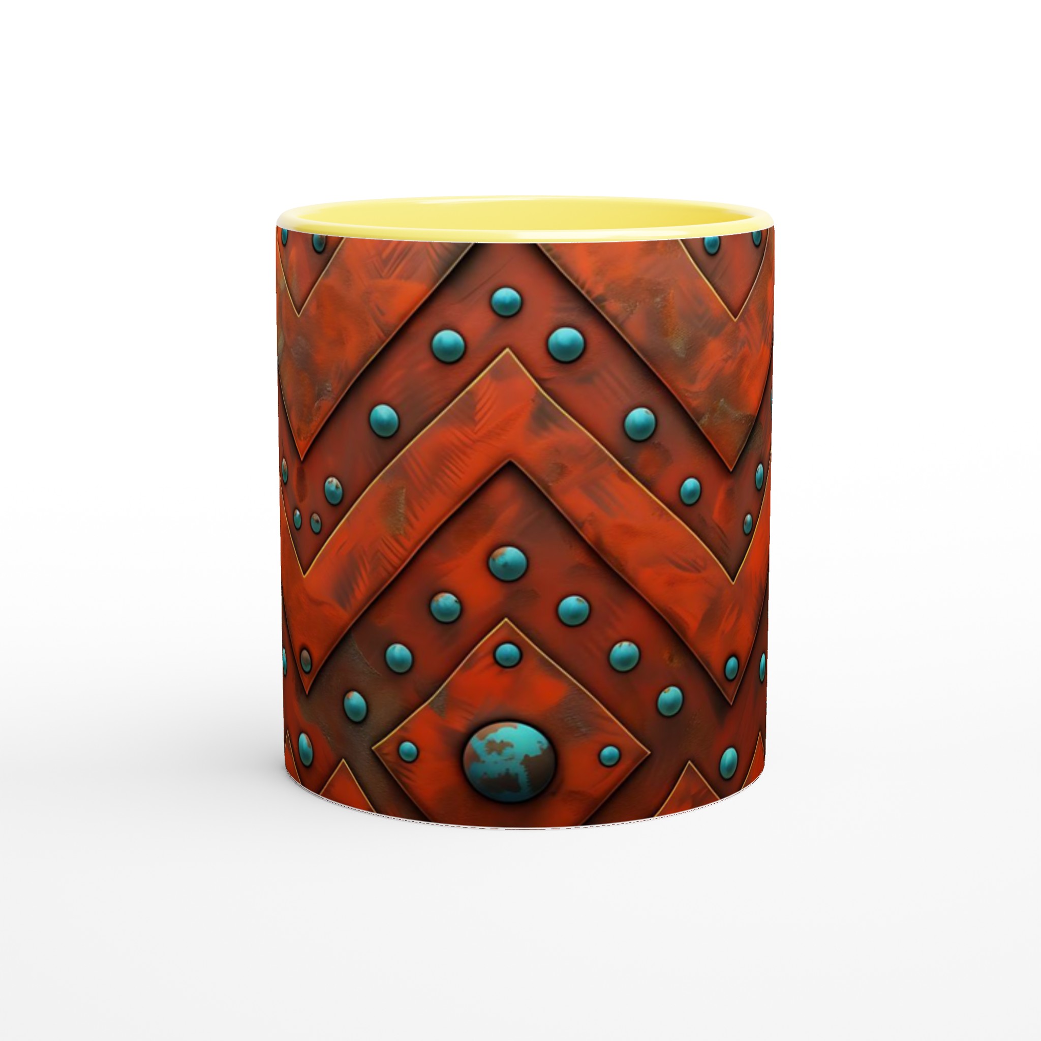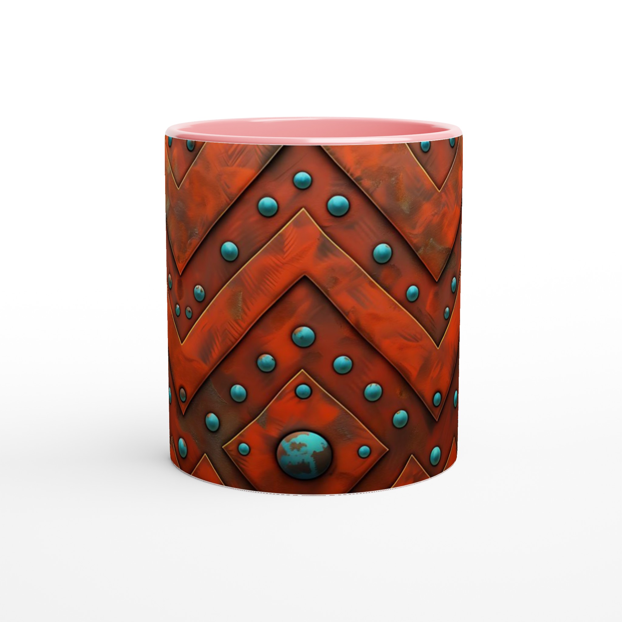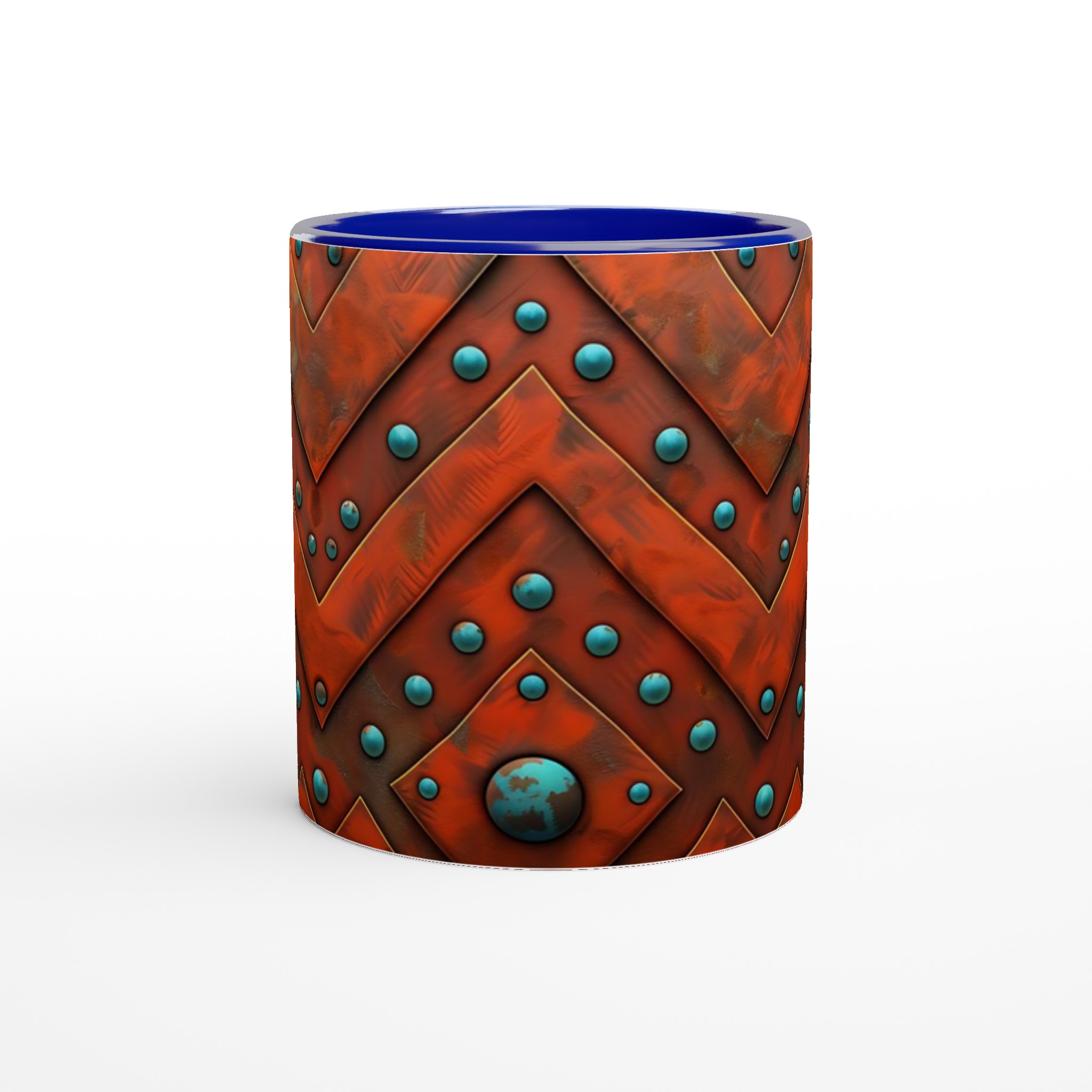 Väck dina sinnen med denna unika keramikmugg, inspirerad av den rika, jordnära skönheten i aztekiska mönster. Den rustika orange nyansen möter livfulla turkosblå pärlor i ett intrikat chevron-mönster som för tankarna till antika hantverk och tidlösa skatter. Denna mugg är inte bara en behållare för din dryck, utan en berättelse i sig – perfekt för att förgylla morgonkaffet, en värmande kopp te eller en härlig varm choklad.